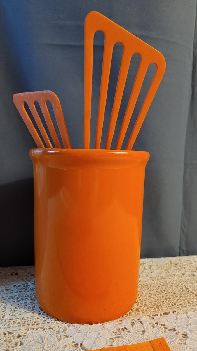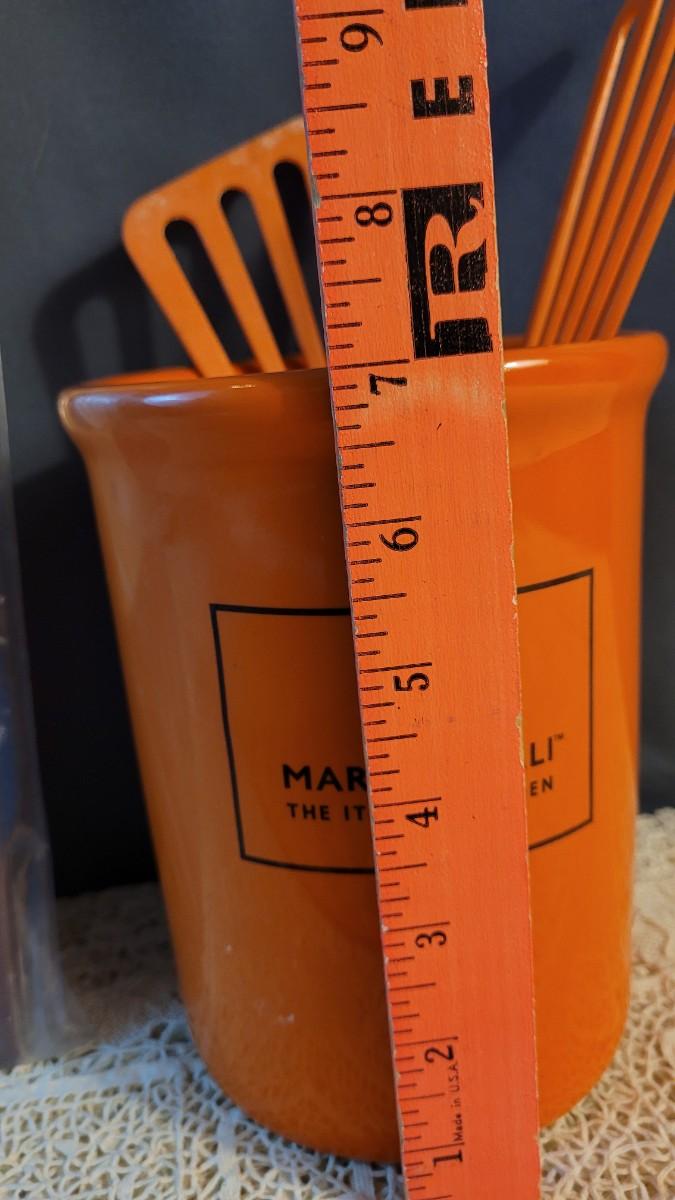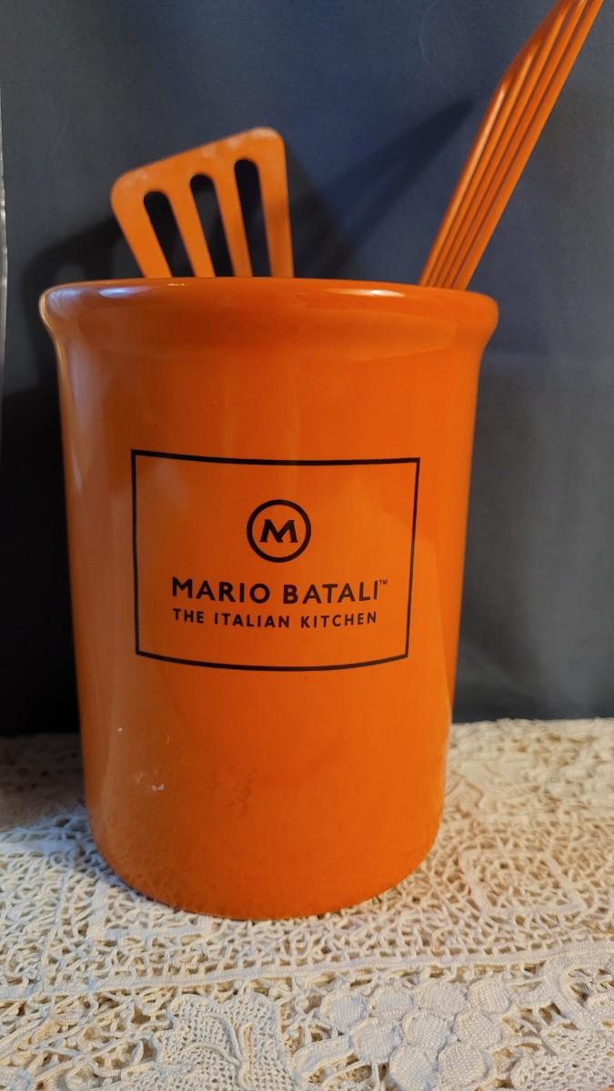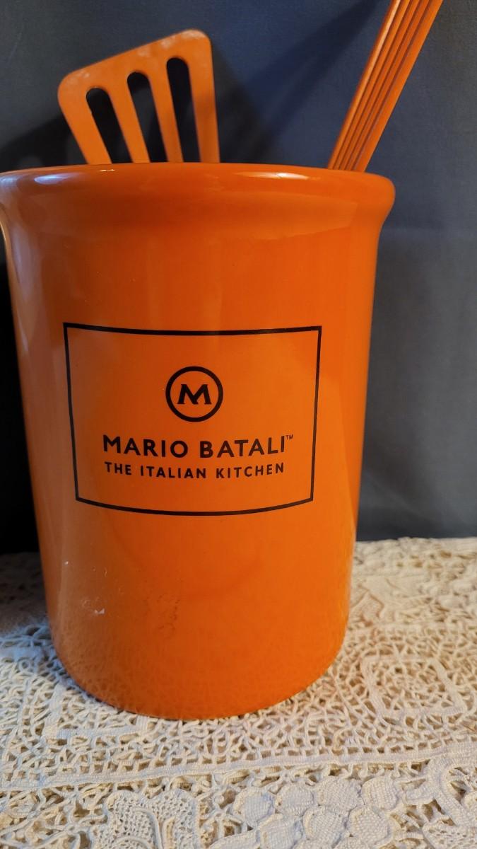 Lot 145: Orange Utensils, Mario Batali Crock and Mat