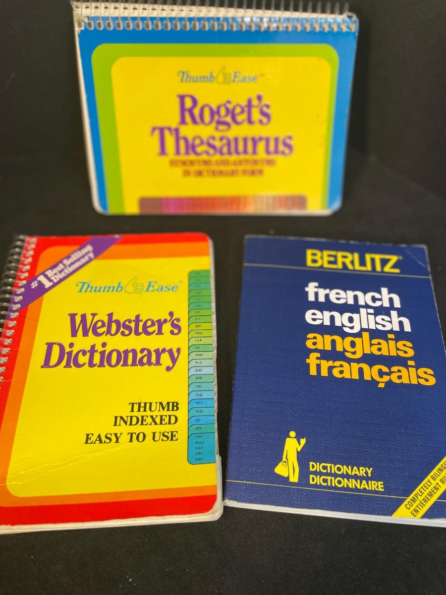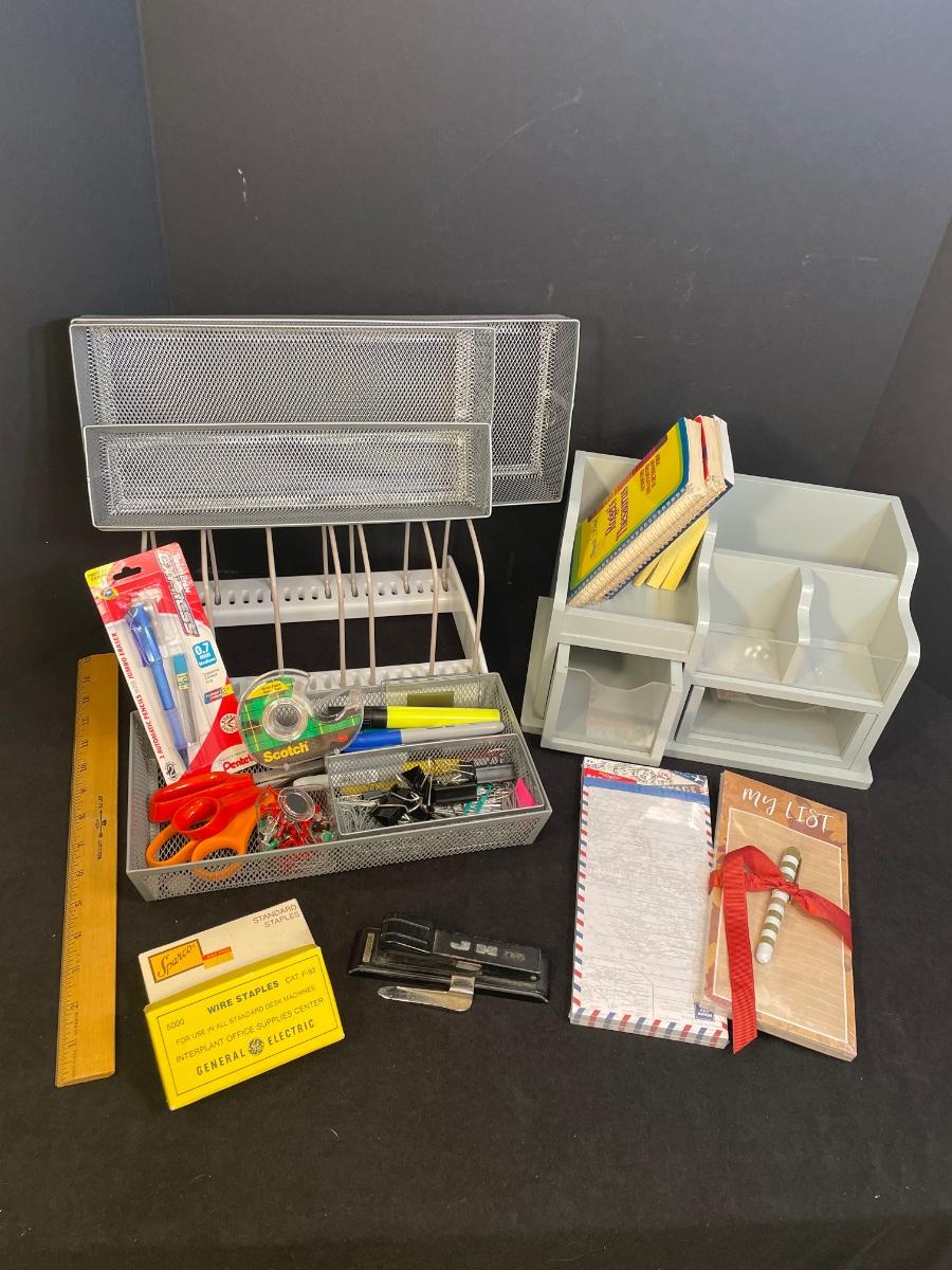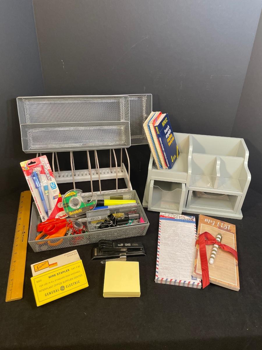Includes desk organizer, 2 desk drawer organizers, ruler, Scotch tape, small notepads, Webster's Dictionary, French/English dictionary, Thesaurus and miscellaneous clips etc.