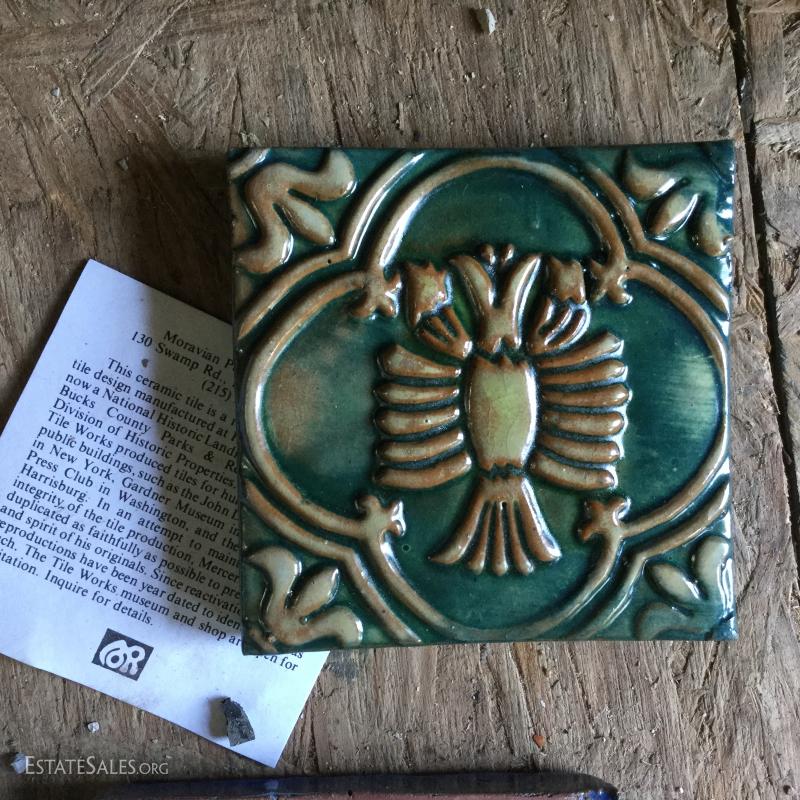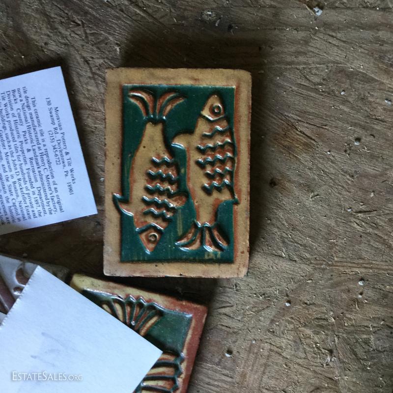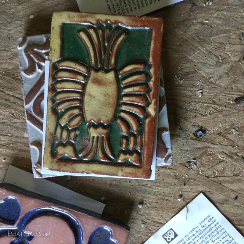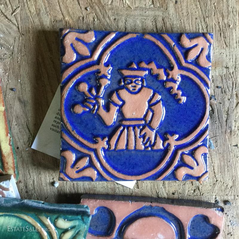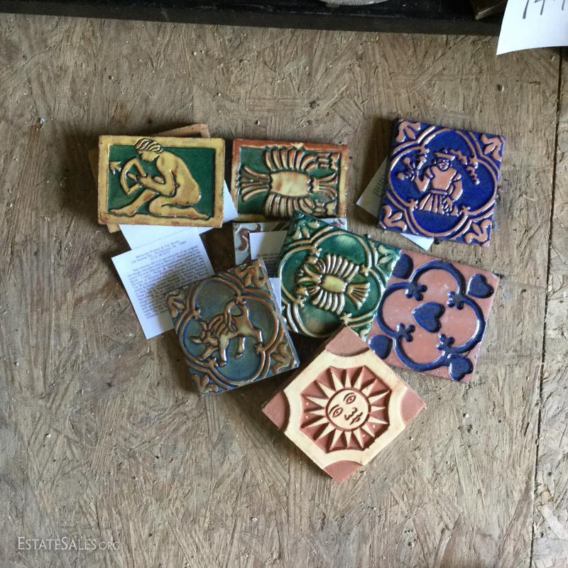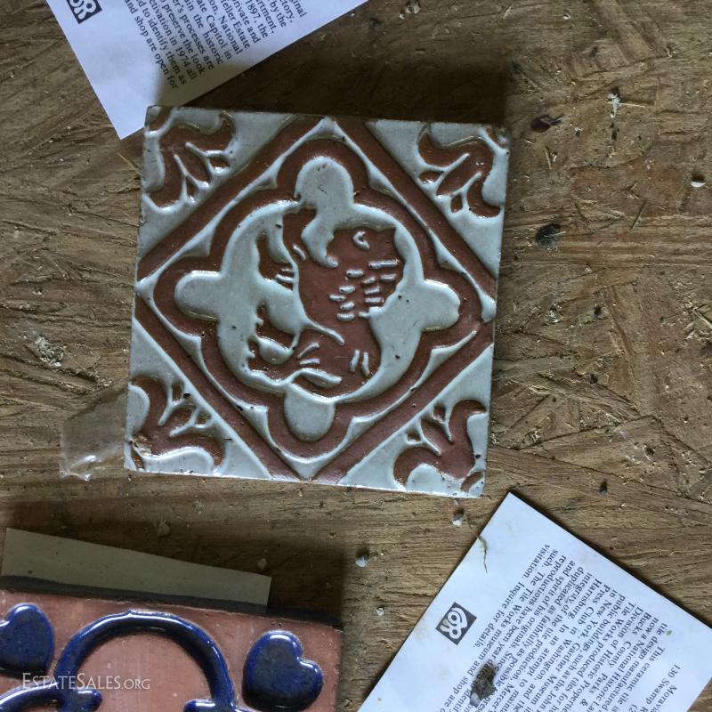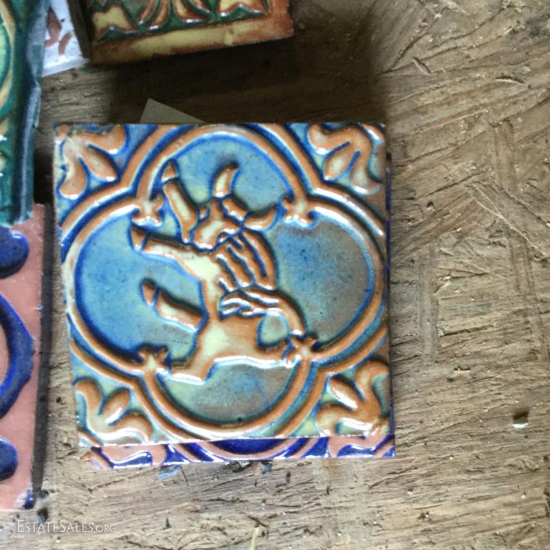 9 colorful reproduction ceramic tiles of originals made at Henry C Mercer's factory in Buck' Co PA. Tiles very in size, largest is 4"x4". This lot is available for shipping or local pick up in Hendersonville, NC.