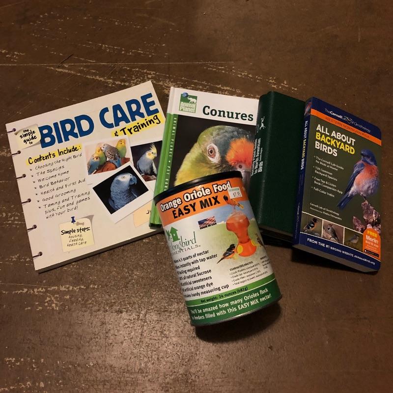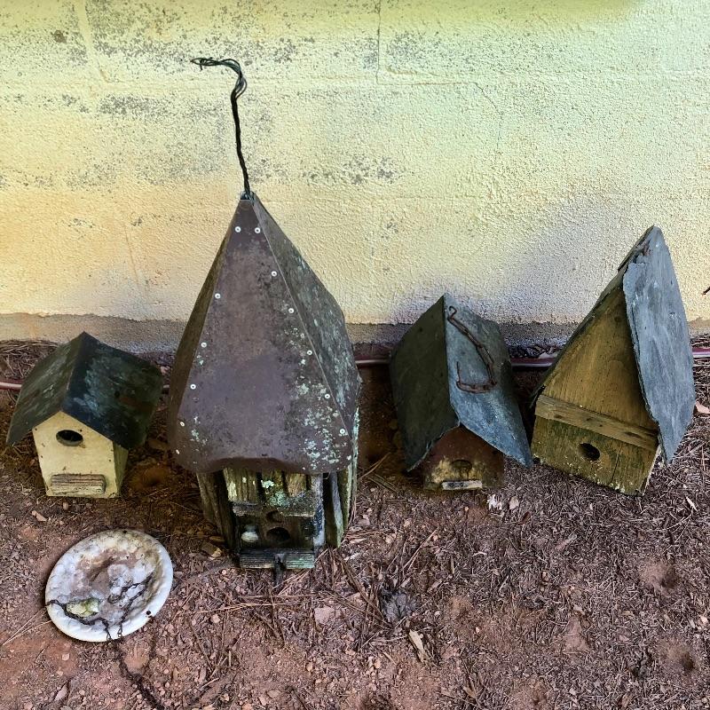 Lot includes 4 bird houses, a ceramic bird dish, an assortment of bird books, and bird food mix. The quirky bird houses make fun decor for any yard. The books are perfect for bird lovers. Largest house is 31”H. Local pickup only.