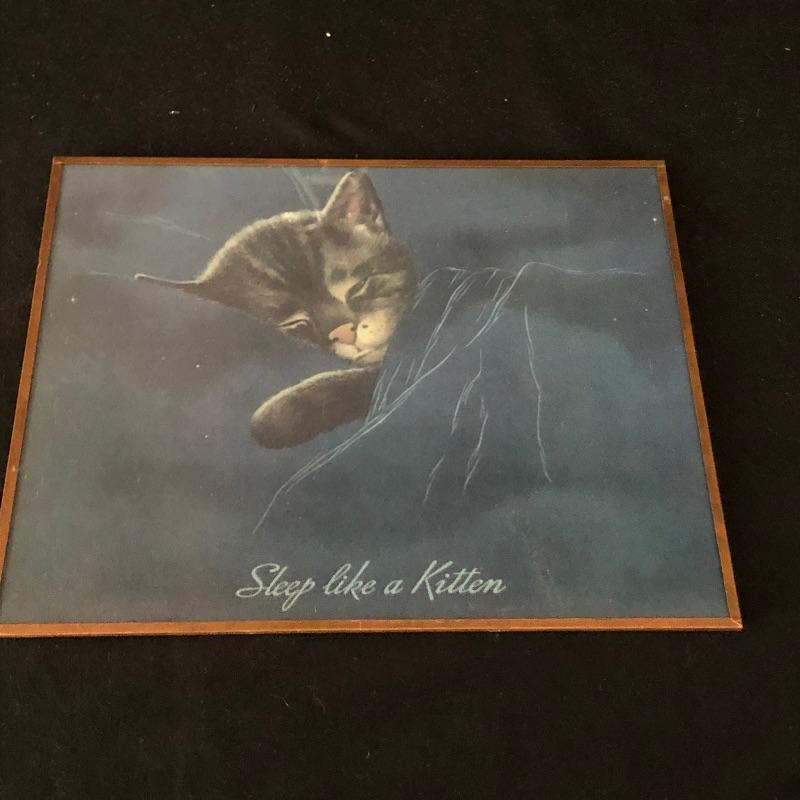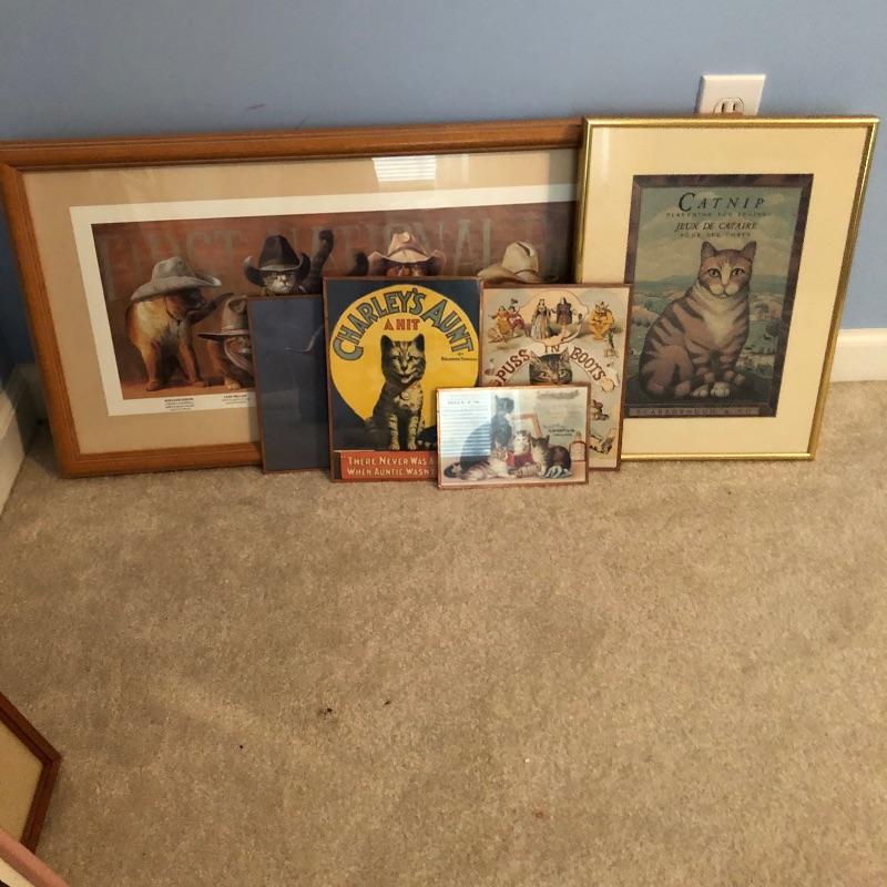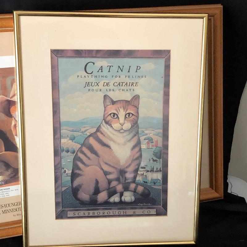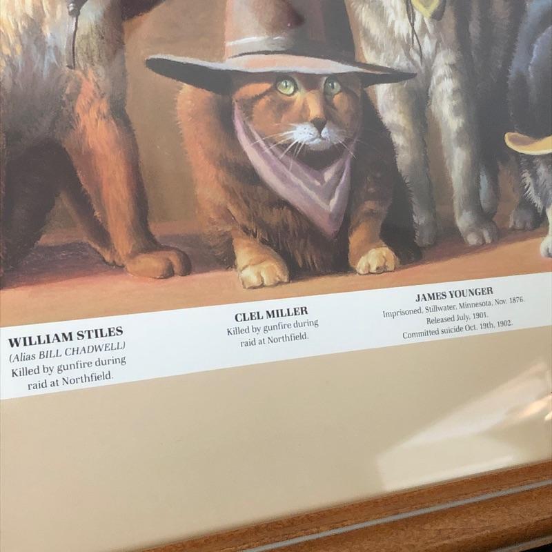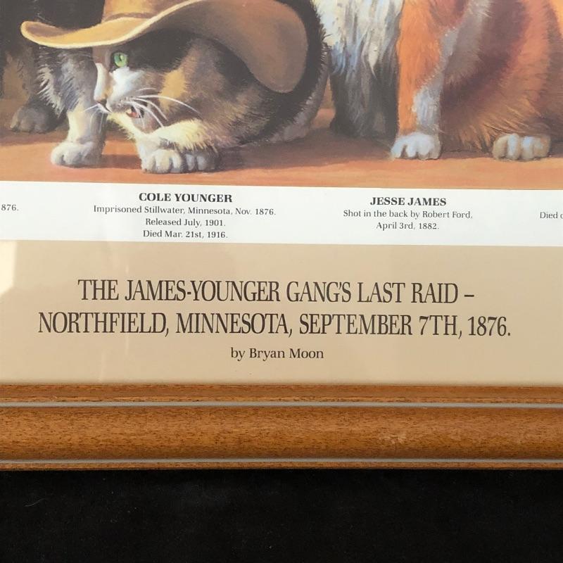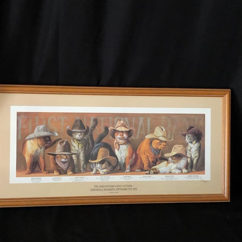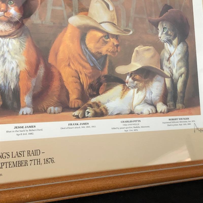 This adorable assortment of cat art will make even a dog lover smile! Six pieces in total. Signed, Lucy Gould for the Catnip piece and The James-Younger Gangs by Bryan Moon appears to be artist signed. The four smaller pieces have copper colored metal frames.