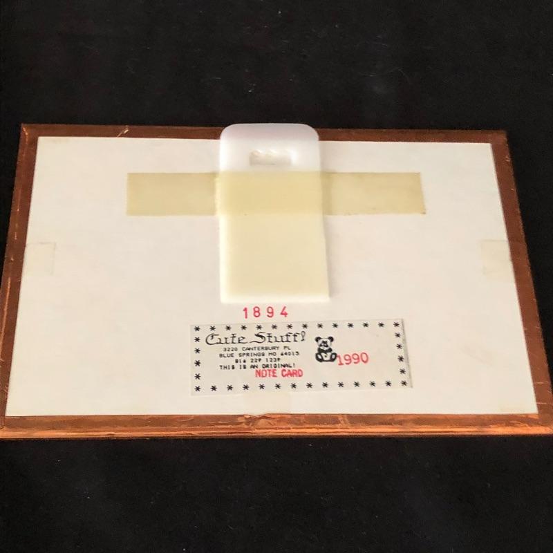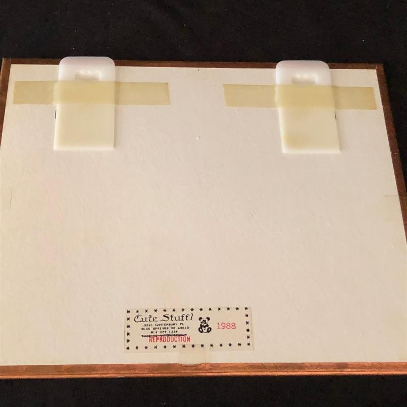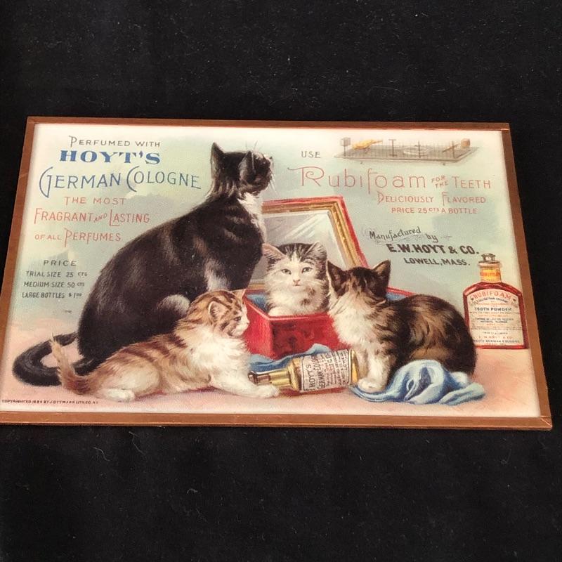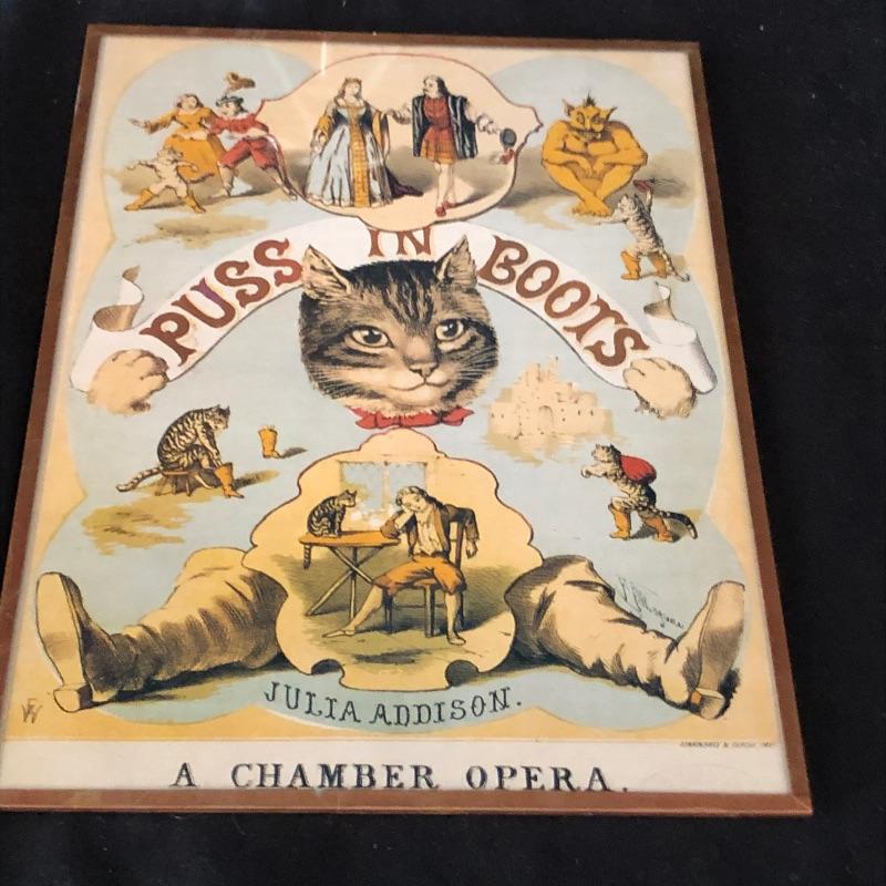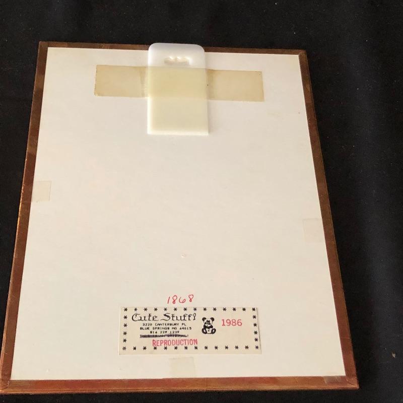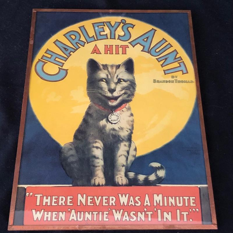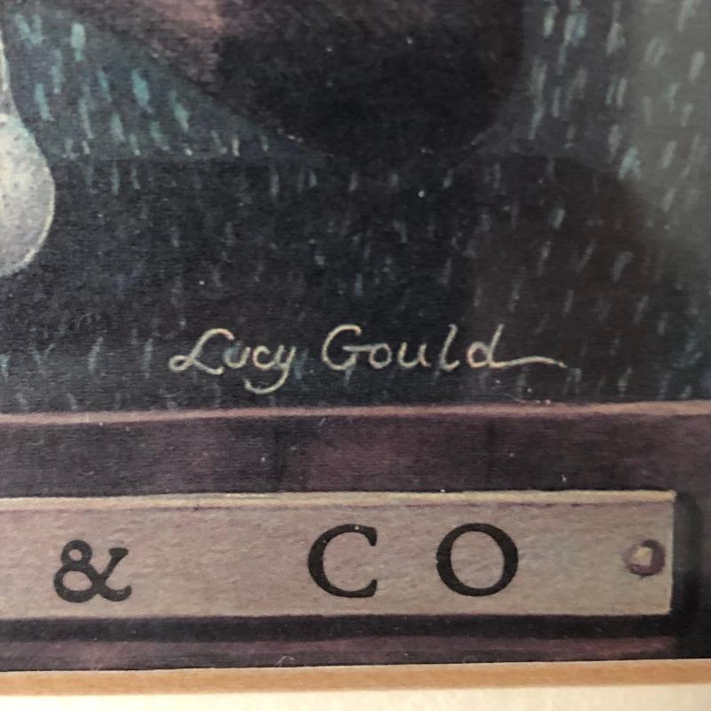 This adorable assortment of cat art will make even a dog lover smile! Six pieces in total. Signed, Lucy Gould for the Catnip piece and The James-Younger Gangs by Bryan Moon appears to be artist signed. The four smaller pieces have copper colored metal frames.