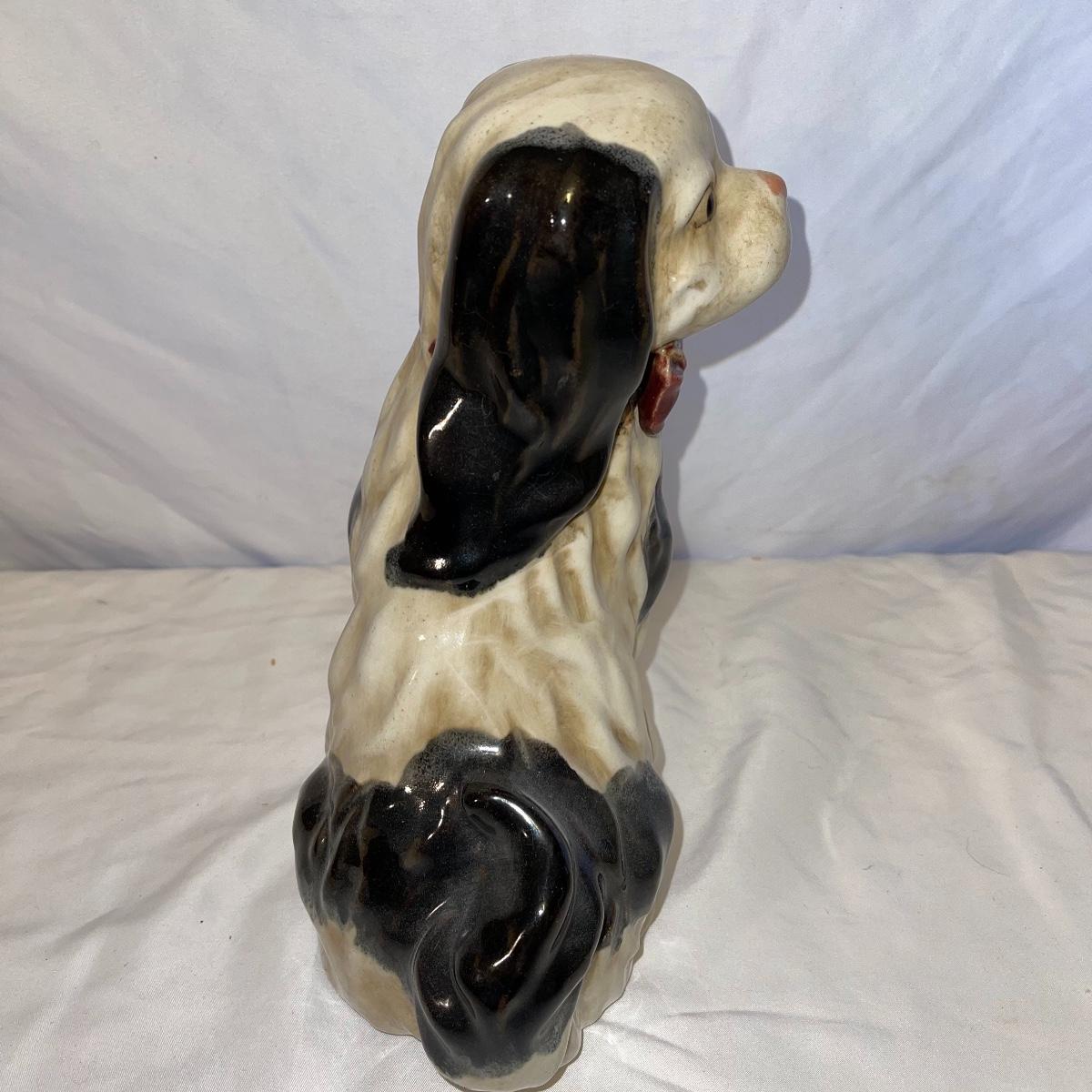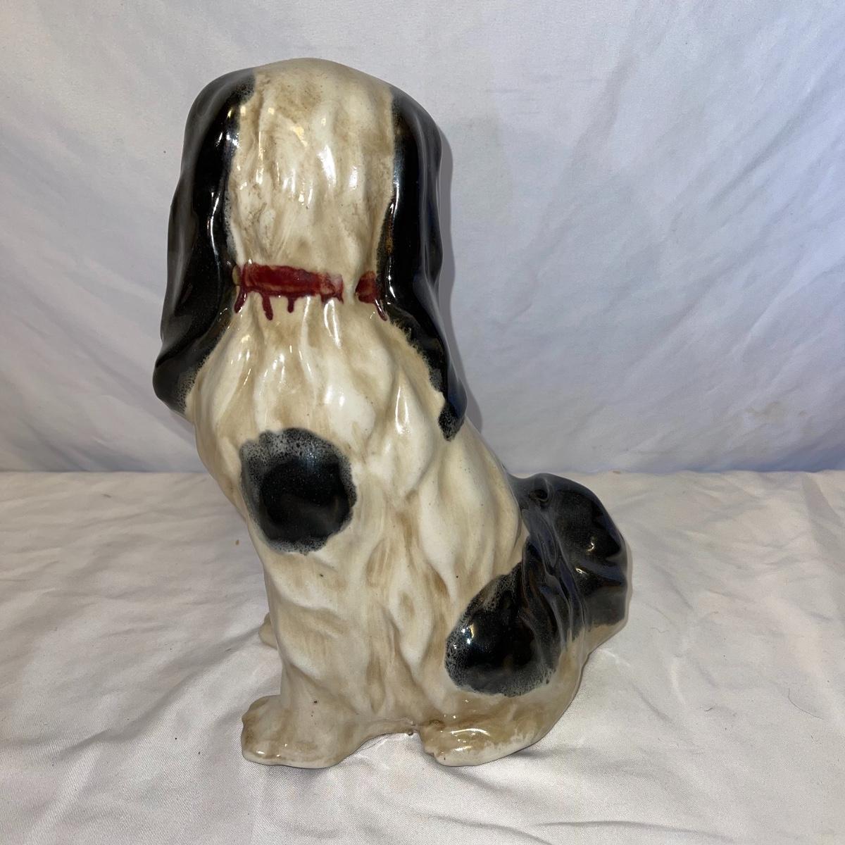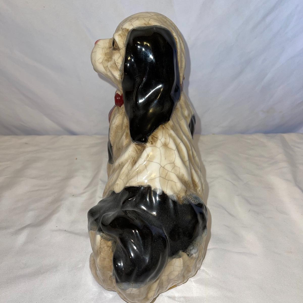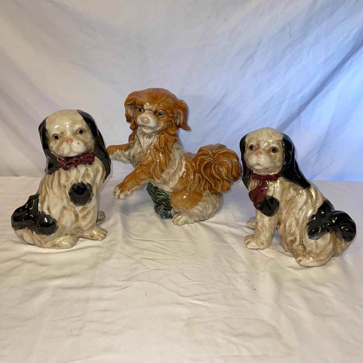 This lot of three ceramic dogs has two black and white dogs that are sitting, facing forward but sitting on opposing sides. The third dog is white and brown and is standing on two legs with its front paws up in the air. The tallest of them is the brown and white dog at about 10.5 inches tall.