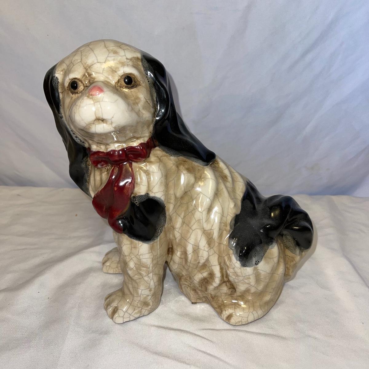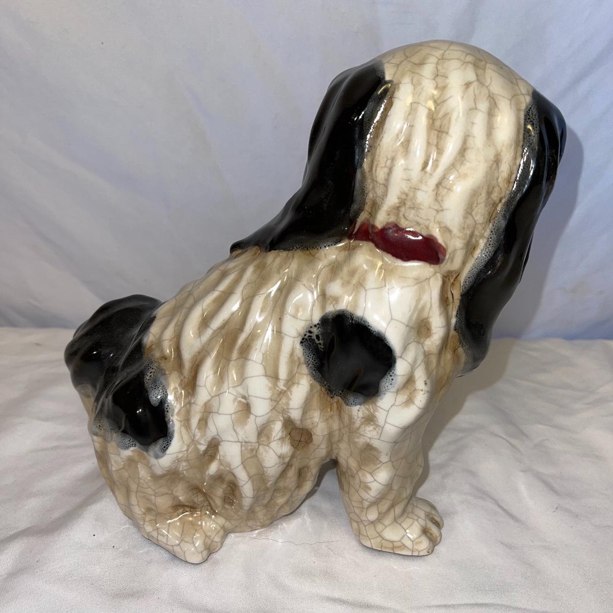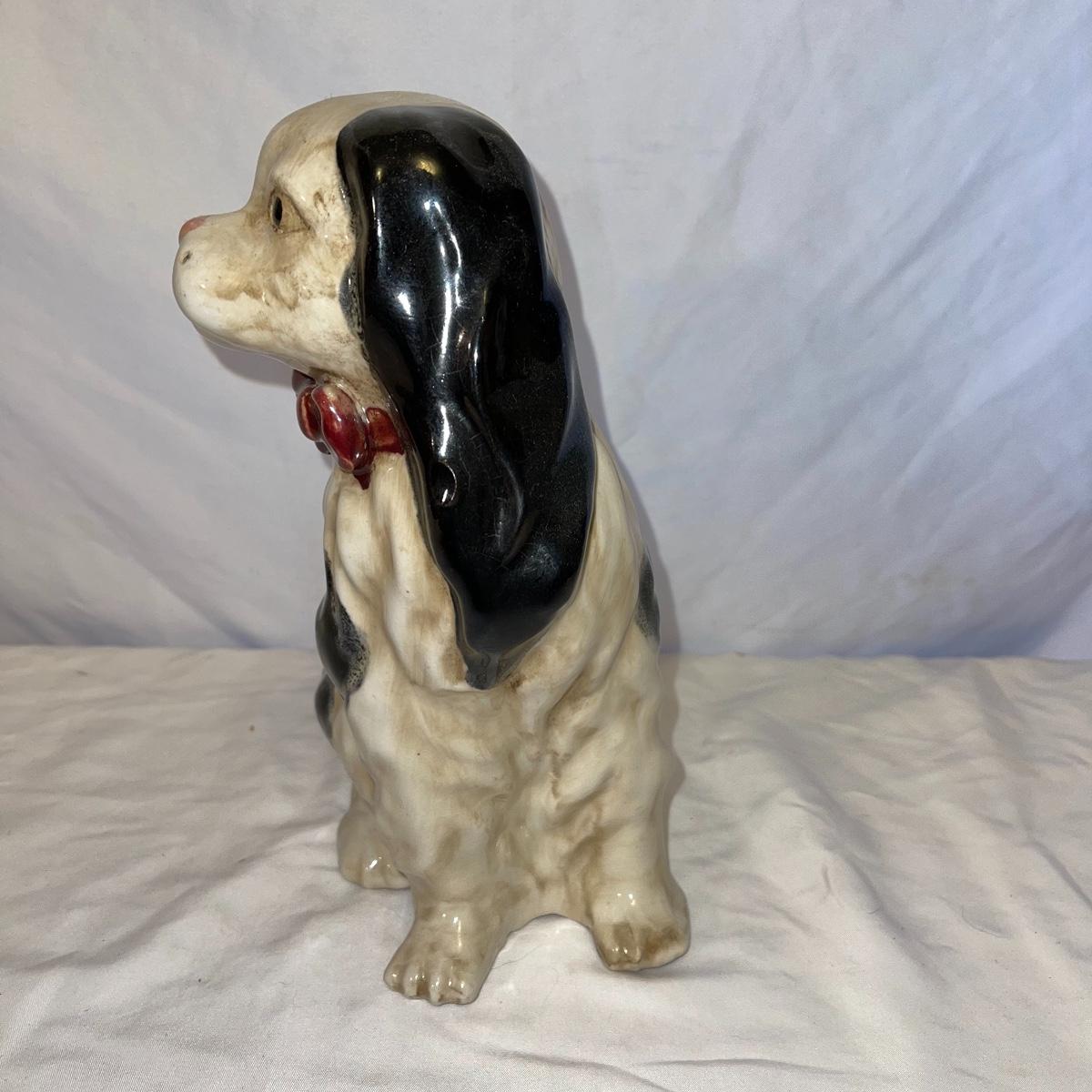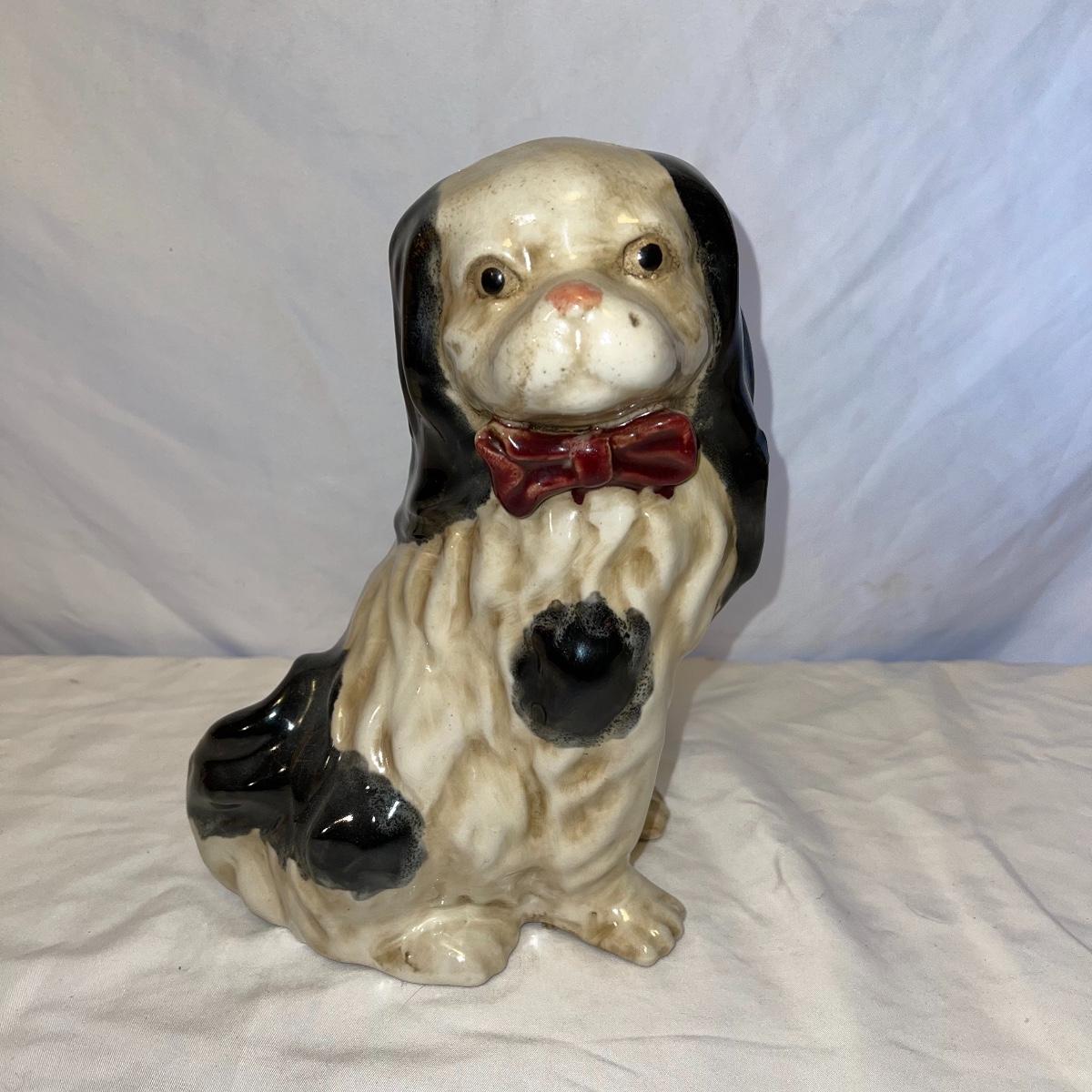 This lot of three ceramic dogs has two black and white dogs that are sitting, facing forward but sitting on opposing sides. The third dog is white and brown and is standing on two legs with its front paws up in the air. The tallest of them is the brown and white dog at about 10.5 inches tall.