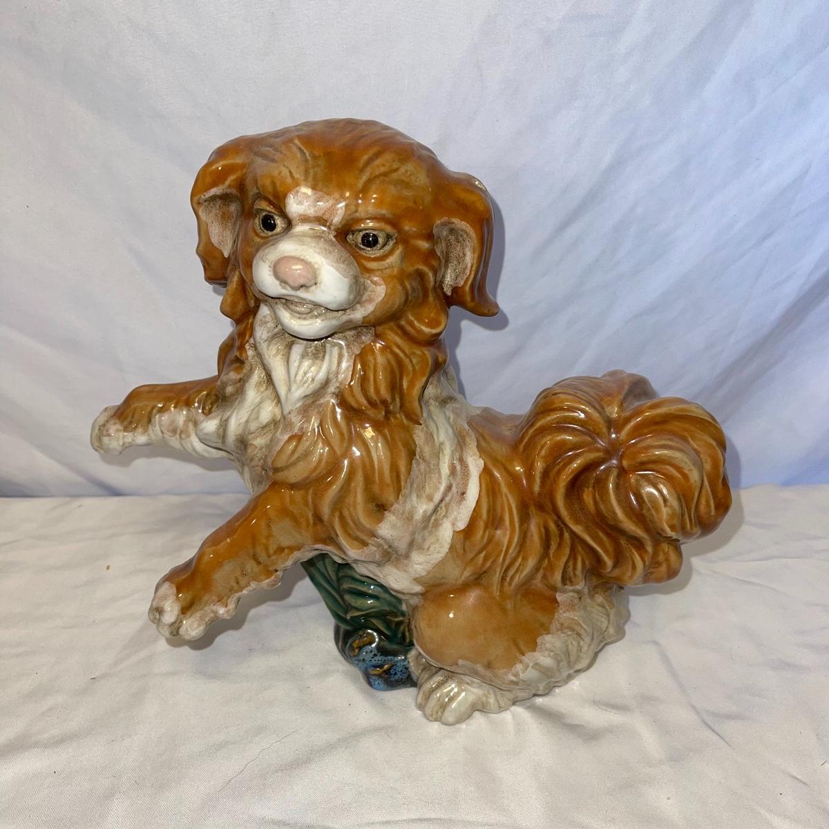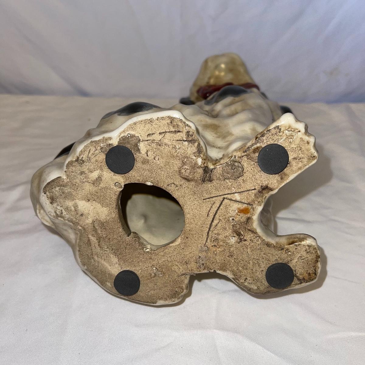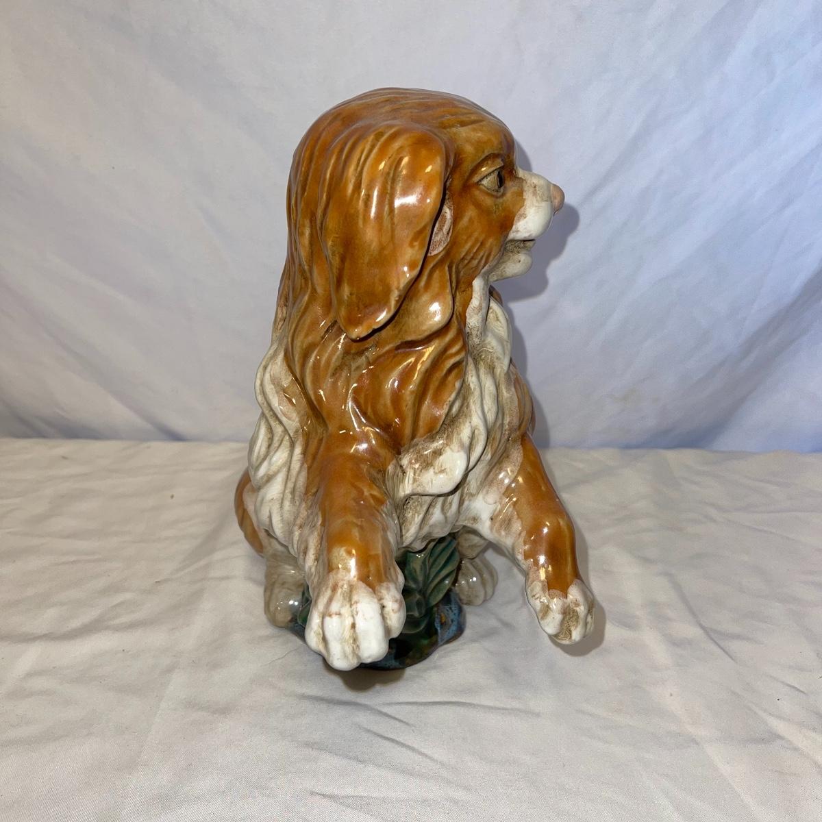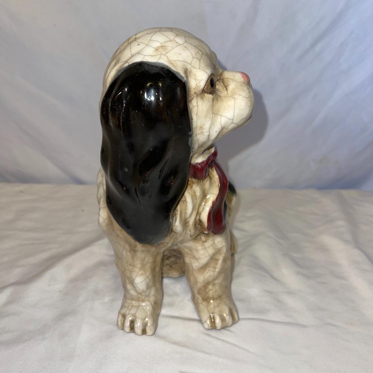 This lot of three ceramic dogs has two black and white dogs that are sitting, facing forward but sitting on opposing sides. The third dog is white and brown and is standing on two legs with its front paws up in the air. The tallest of them is the brown and white dog at about 10.5 inches tall.