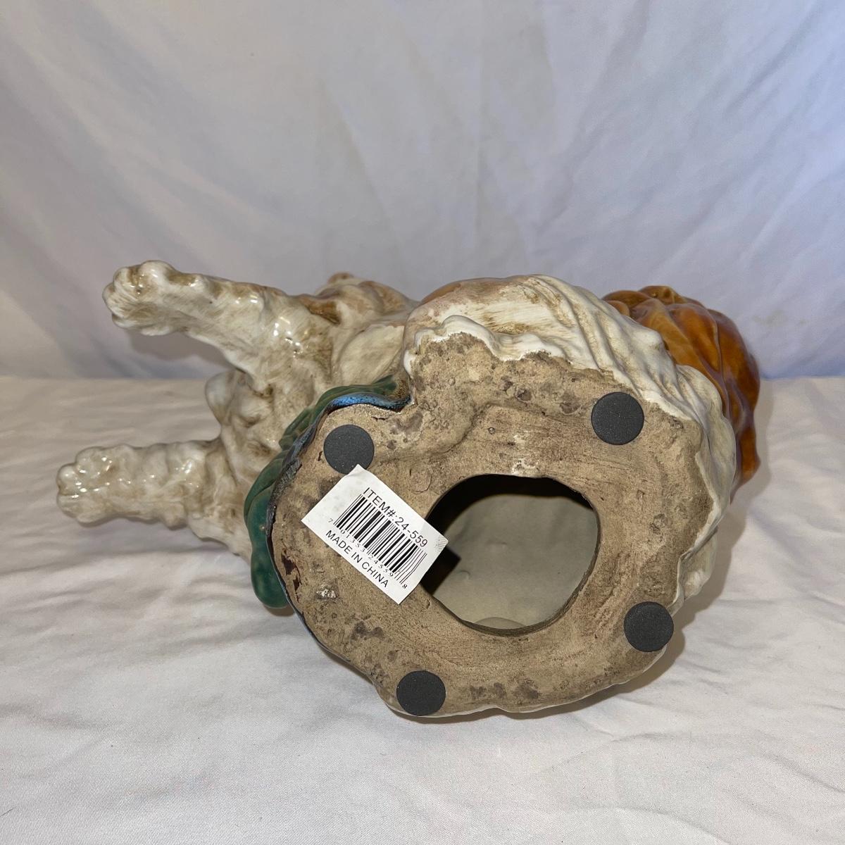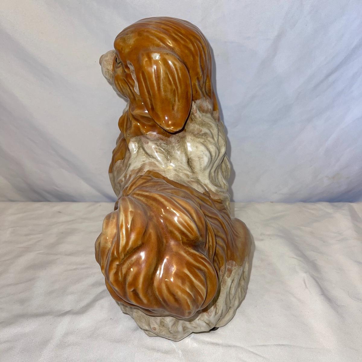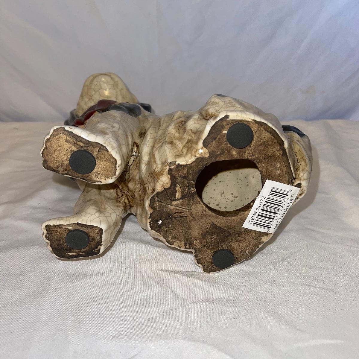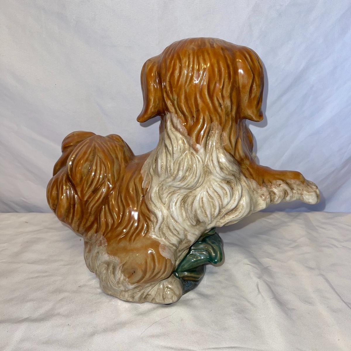 This lot of three ceramic dogs has two black and white dogs that are sitting, facing forward but sitting on opposing sides. The third dog is white and brown and is standing on two legs with its front paws up in the air. The tallest of them is the brown and white dog at about 10.5 inches tall.