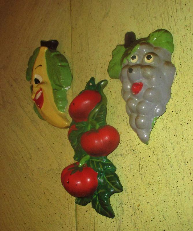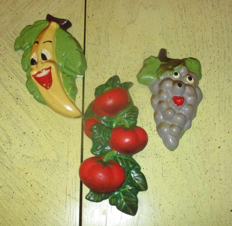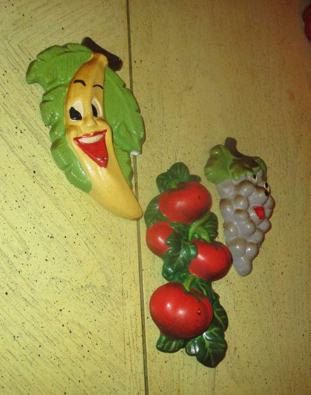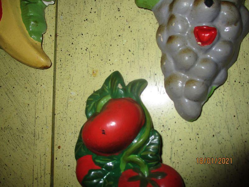 These fruits and vegetables will never turn into a science project! The vegetables are chalkware and the tomatoes are ceramic. There is a little bit of paint chipping, but not enough to take away the "sweetness". They are about 7.75" long.