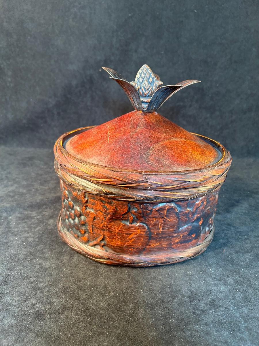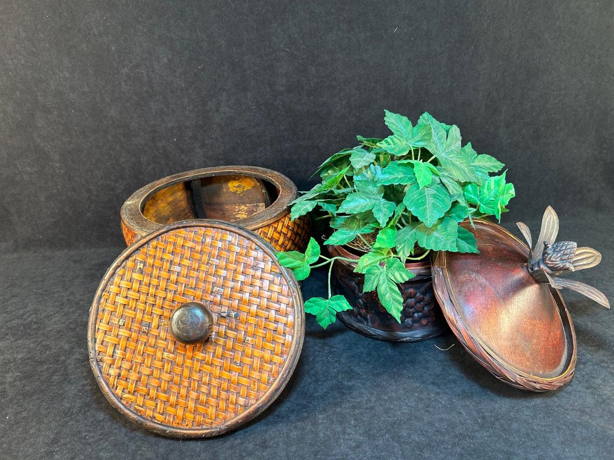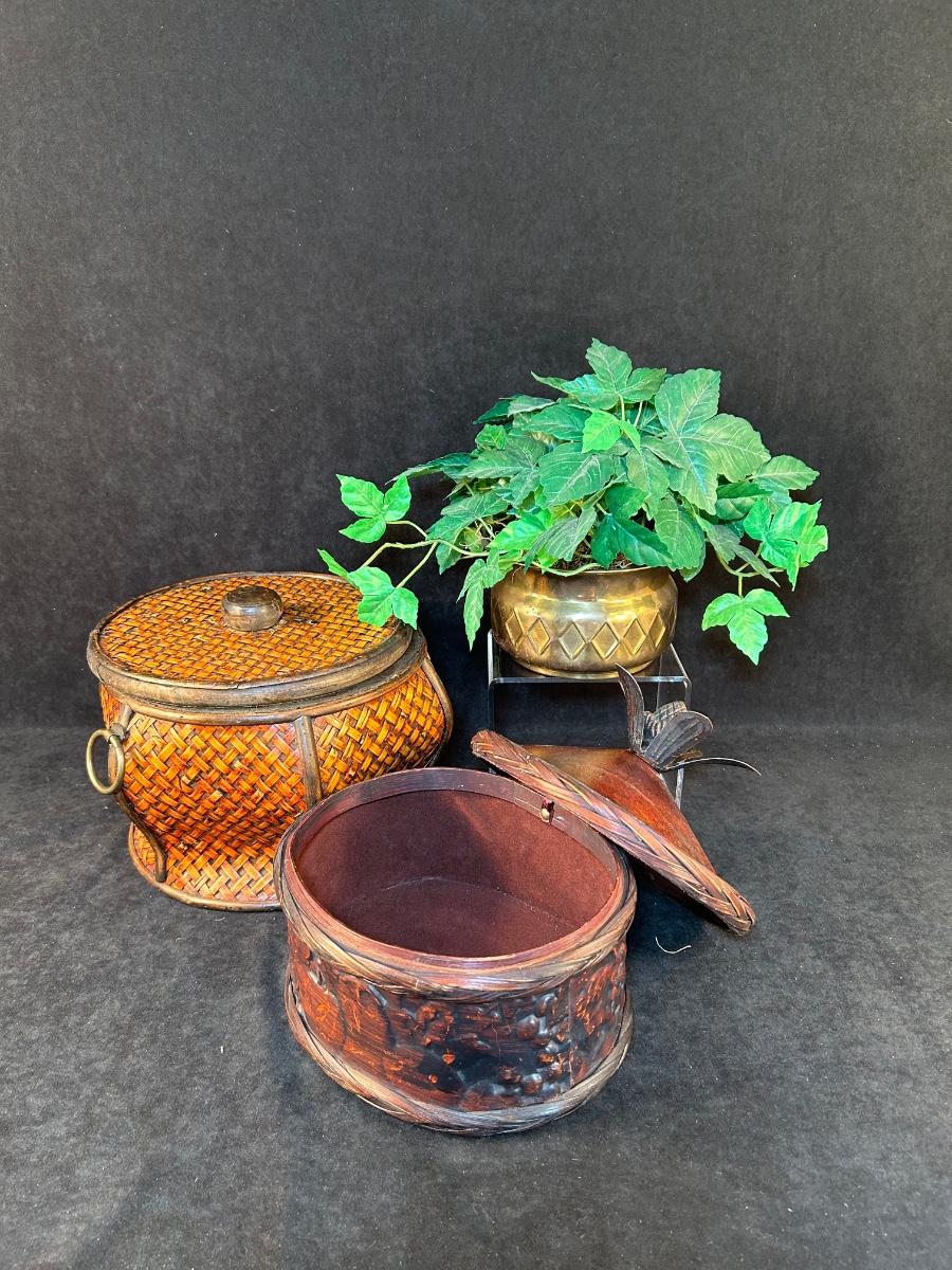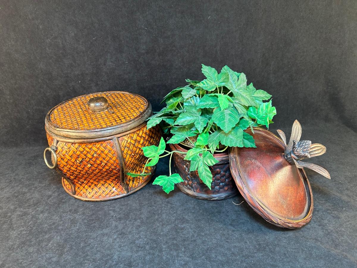 Included 7" "woven" look planter/basket, 7 1/2" x 6 1/2" oval metal planter with fruit on the side and attached lid and brass colored metal planter with silk greenery.