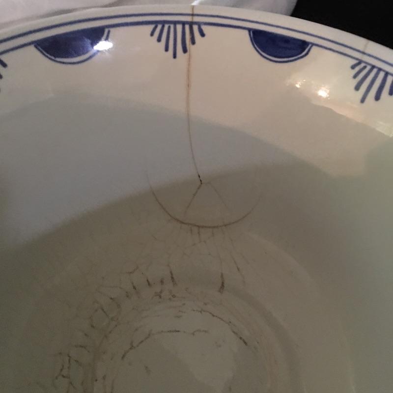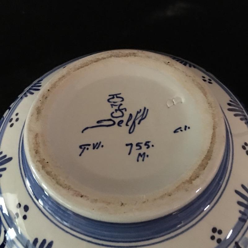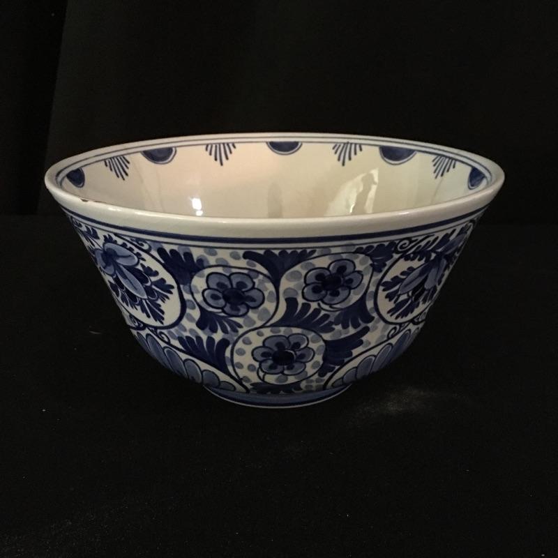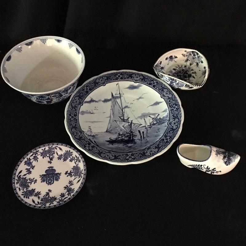 Beautiful selection of Five Delft pieces that includes two plates, two bowls and a clog. Largest plate measures 12” D. Large bowl has some surface cracks, see pictures.