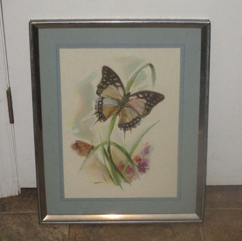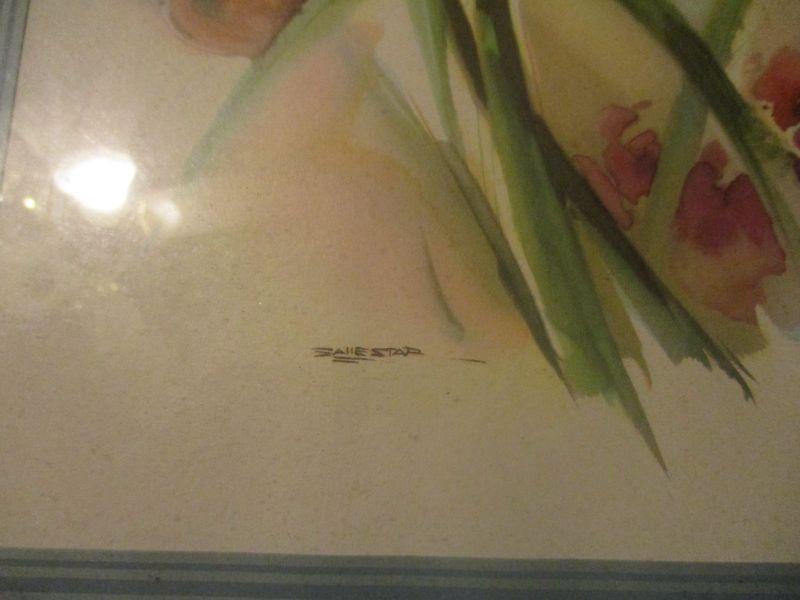 This is signed Jane Star and looks like it is a watercolor reprint. The metal frame is slightly rough feeling, but a good cleaning will probably take care of that. It is 20.25" x 16.25".