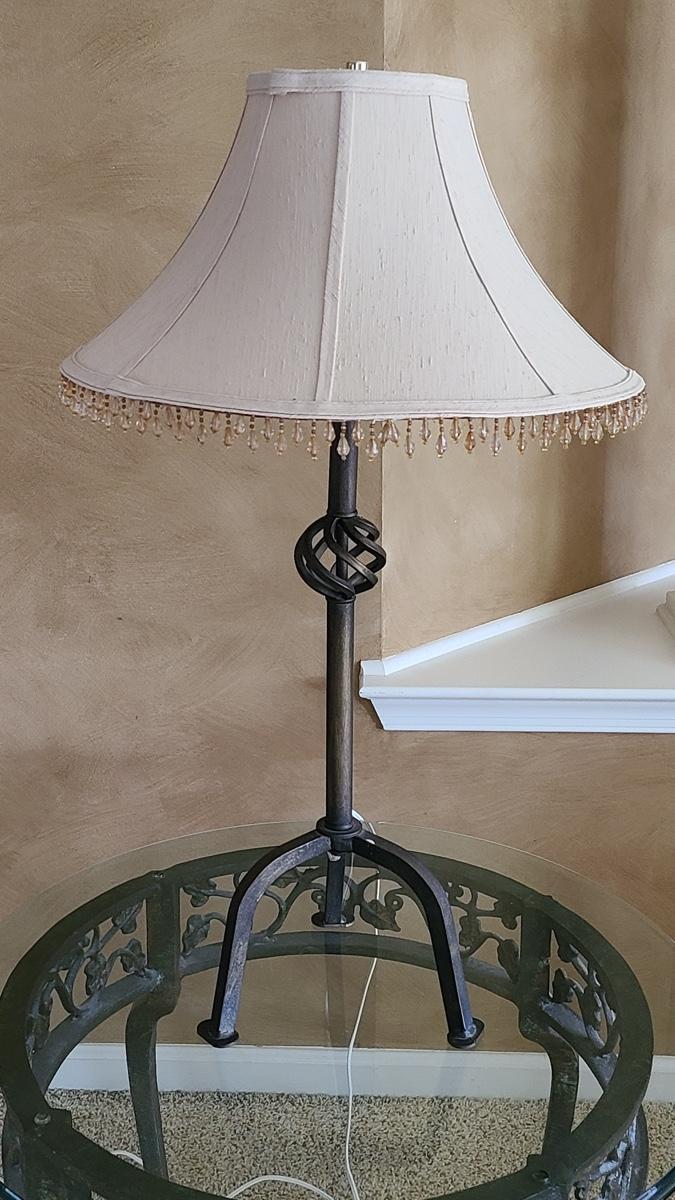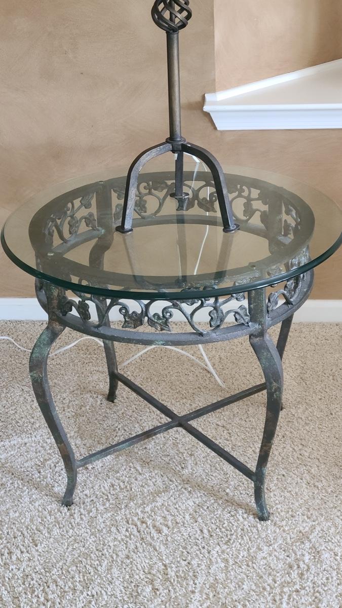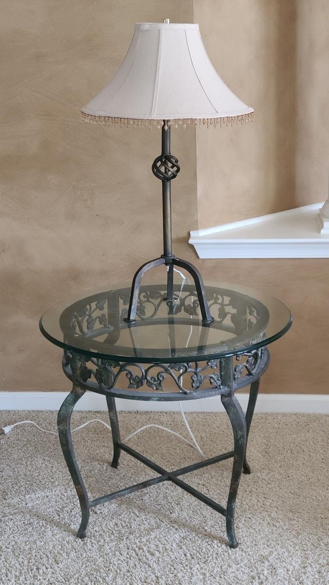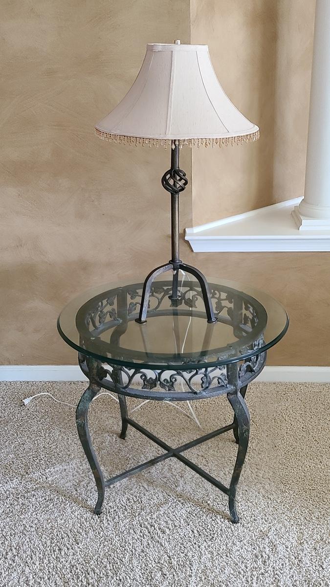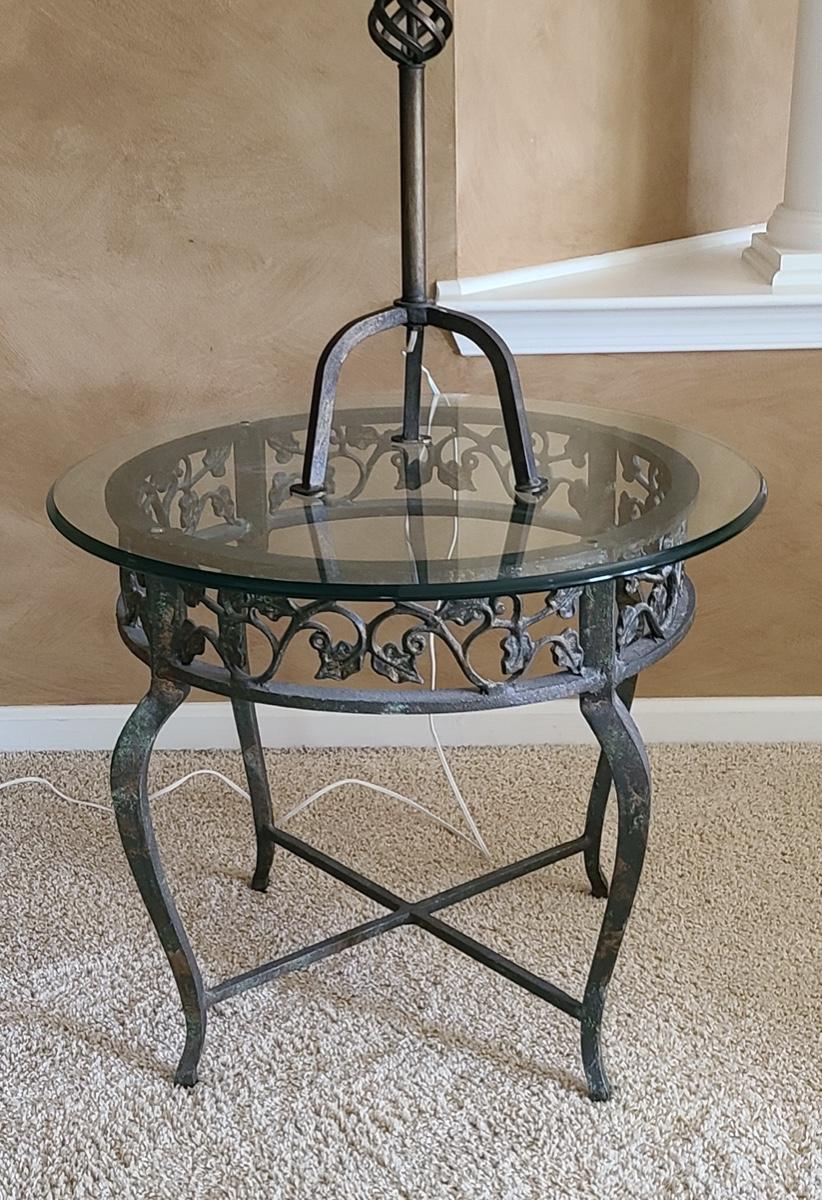 Lot 145: Glass Top Cast Iron Table with Matching Lamp