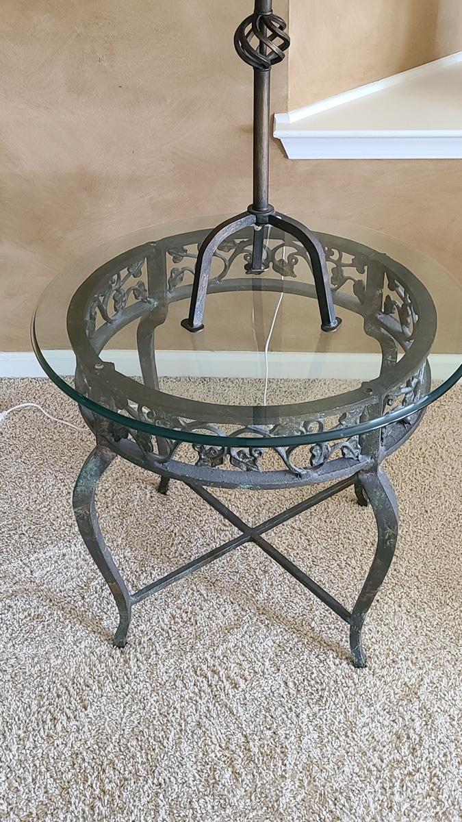 This is a well-designed scrollwork cast iron black base side table with glass top & matching lamp. Table is 26x23 inches. Please see all pictures for content of the lot, condition of the lot, and measurements if taken. Pictures are the best representation of the items listed and items are untested unless indicated in description. Thank you for looking and have fun bidding!
