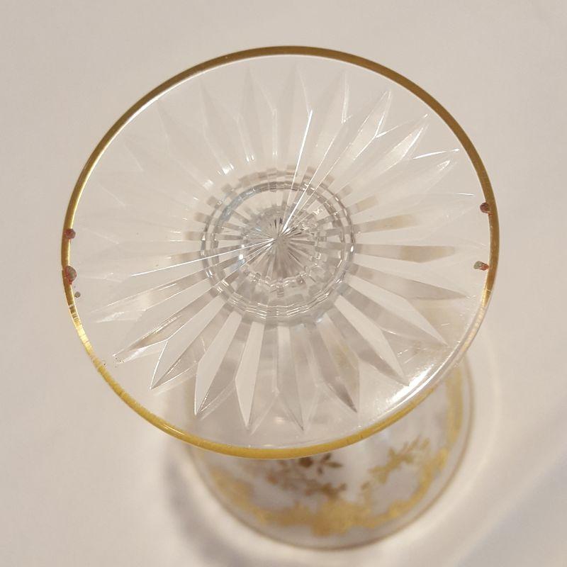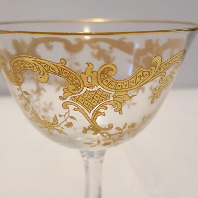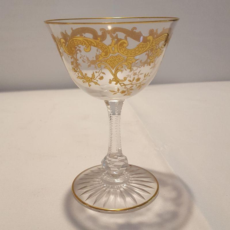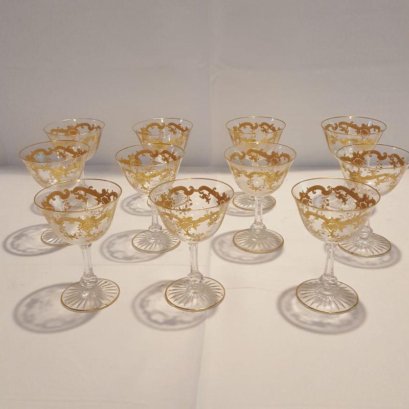 11 beautifully etched glasses just waiting for your favorite cocktail! All glasses are in good shape, no chips or cracks, but there is red paint dots on the bottom on the glass. See pictures.