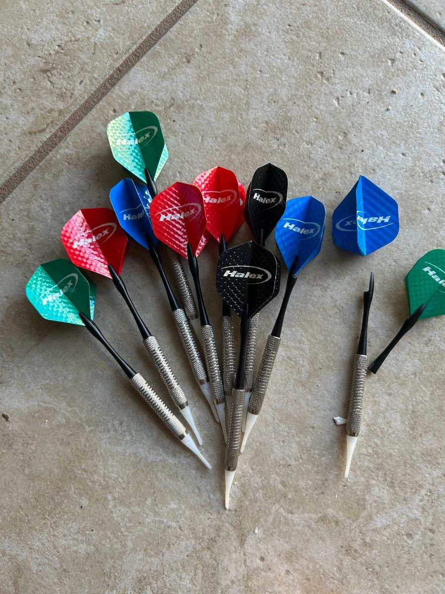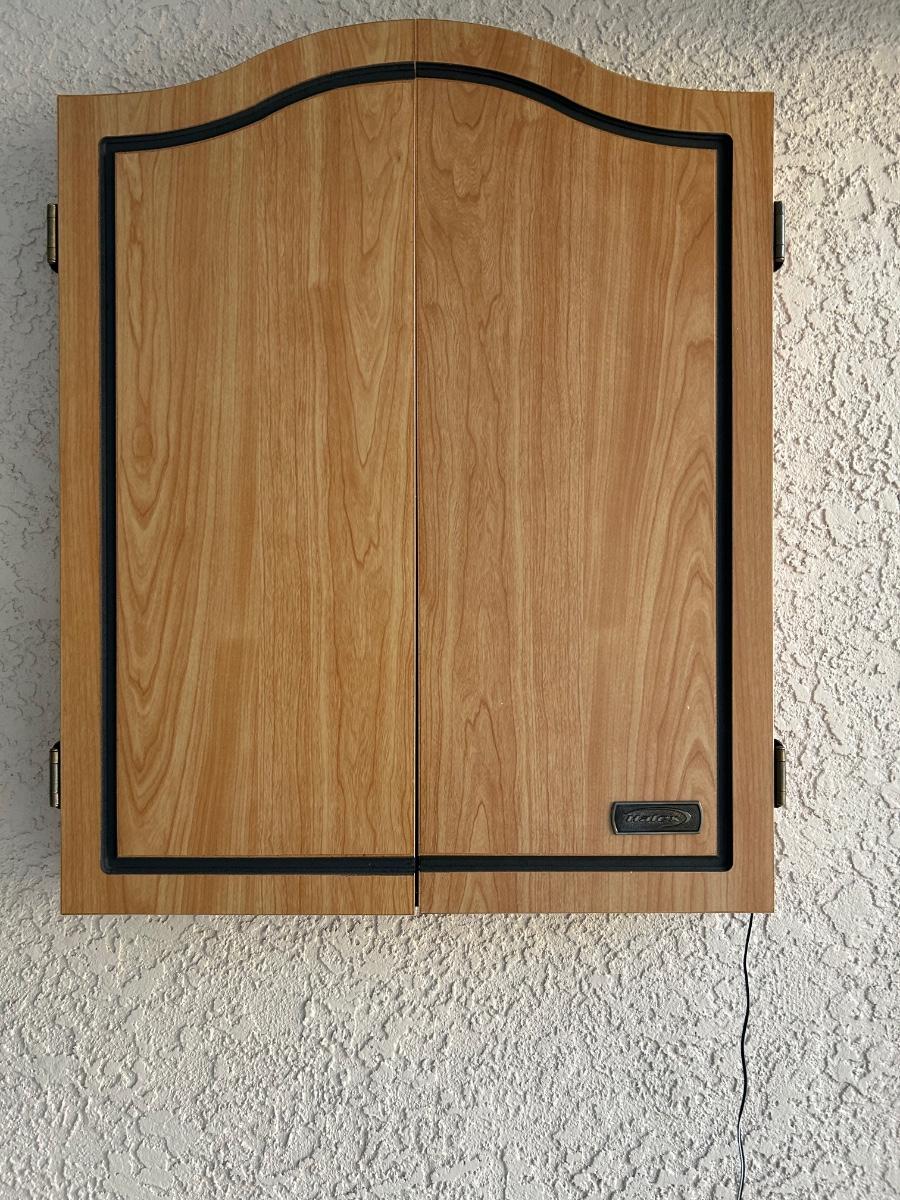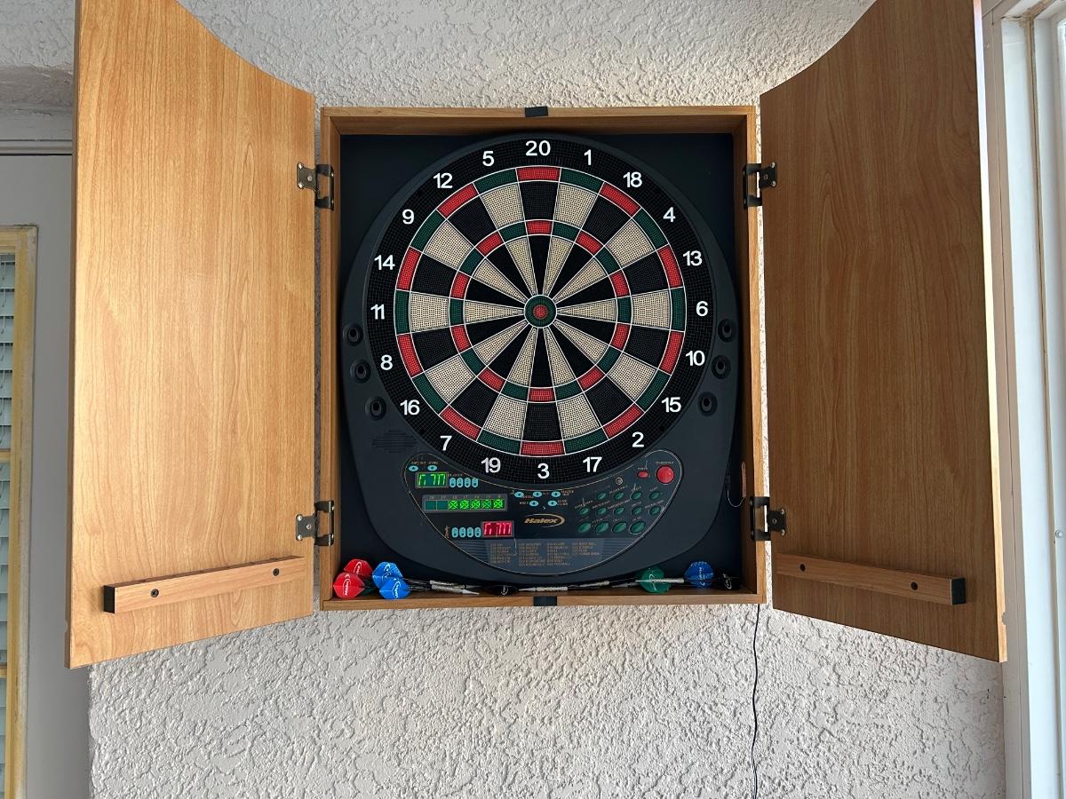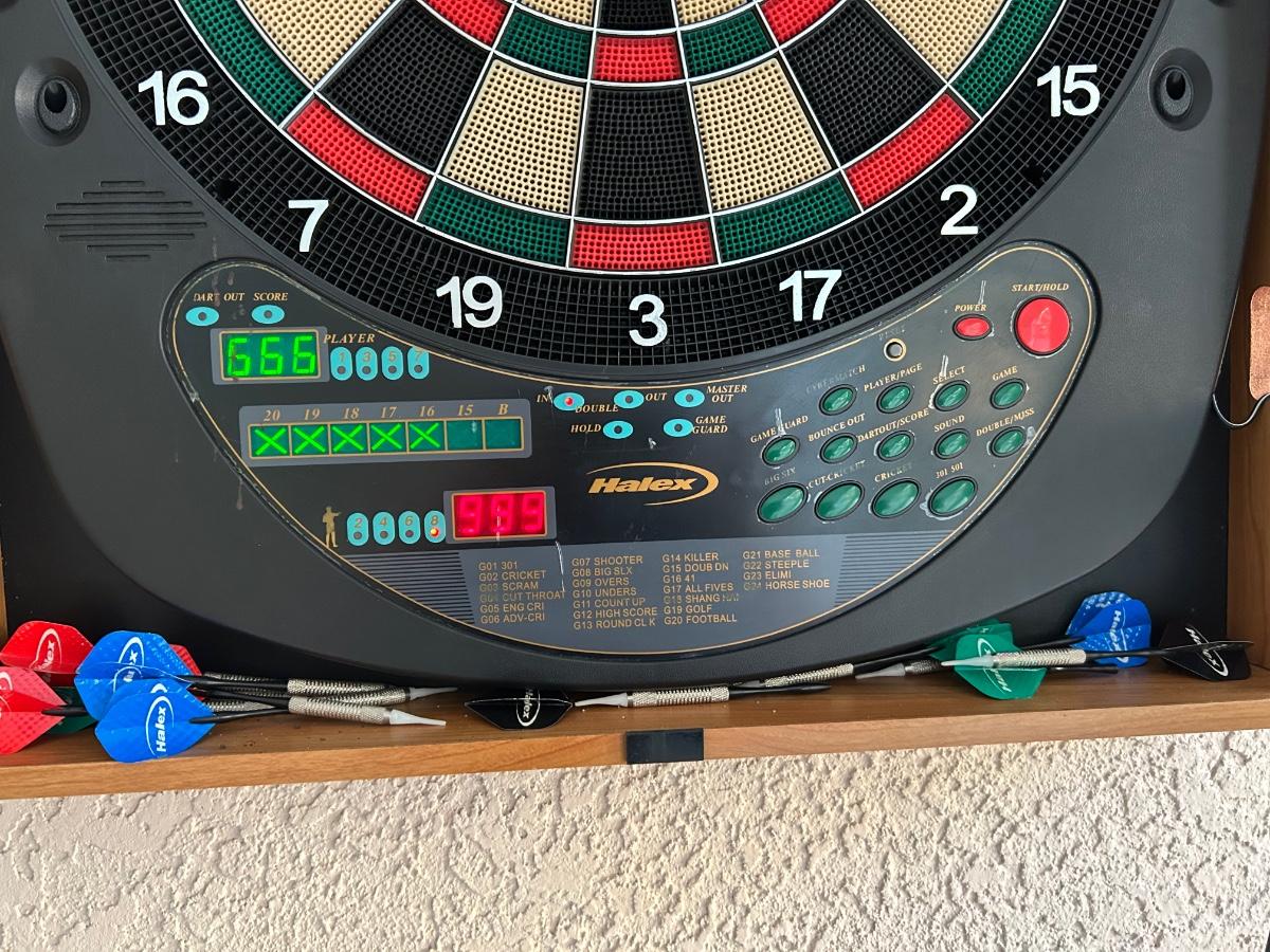 Wall mounted Halex Electric Dartboard with 9 plastic-tip darts. 28 1/4" x 22 3/4"