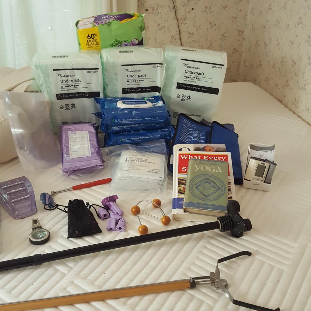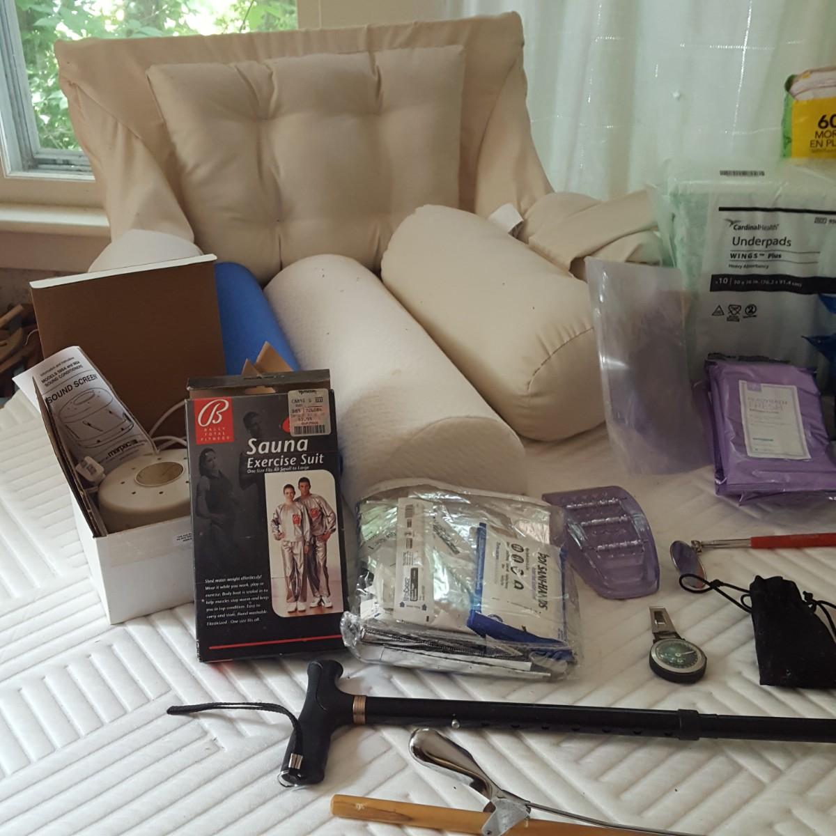This large lot of home health care will take care of your every need. From bed cushions, pads, blood pressure cuff, pulse gage, sound drowning machine, ice/hot packs, books, a cane and a claw grabber. See pictures for all the details. No shipping