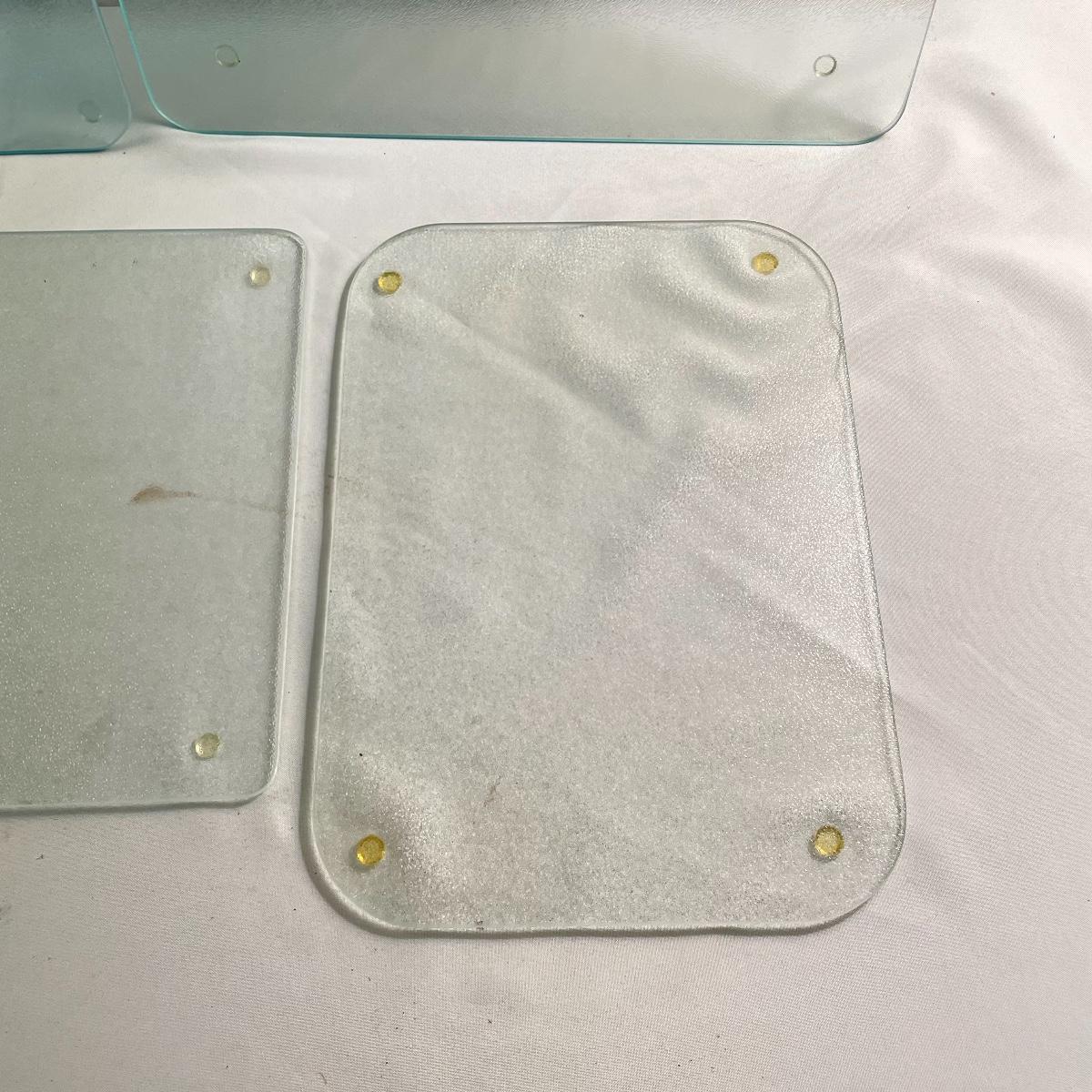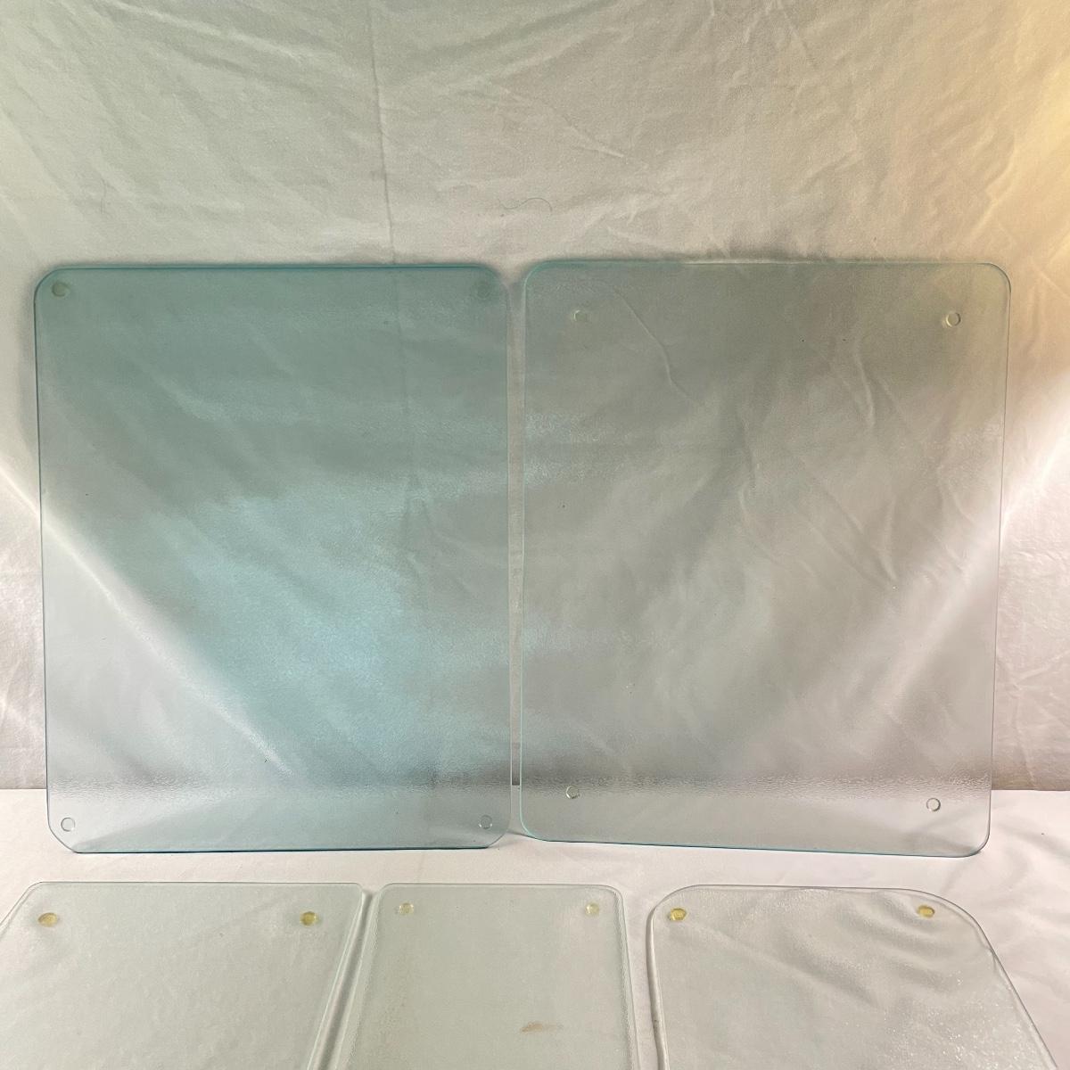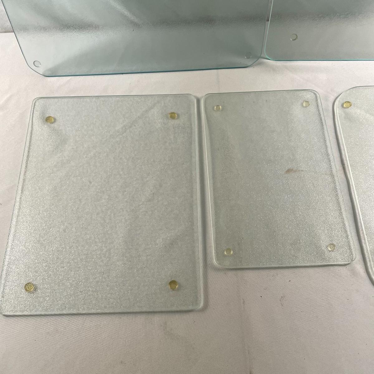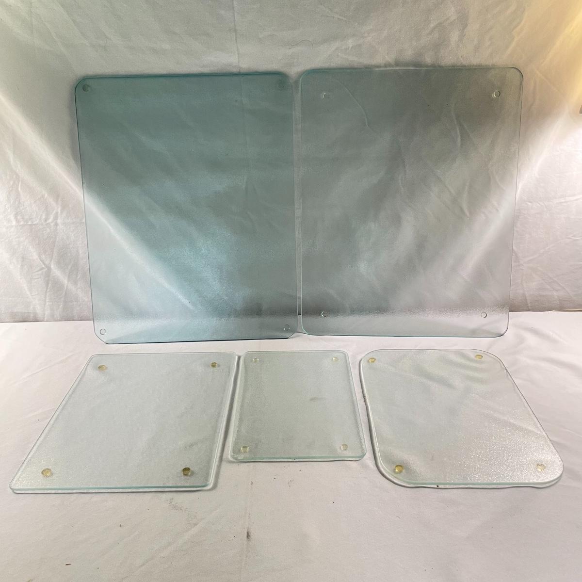 Imagine the feasts you can prepare with two 16” x 20” cutting boards! These kitchen necessities also protect your countertops if you prefer a wooden board. For the smaller jobs, this lot is offering an 8” x 12” and two larger glass cutting boards. When the dishes are hot, protect your dining table with style by using any of the four iron trivets. One trivet is marked 1955 Cathedral, see photos. Local pick up only.