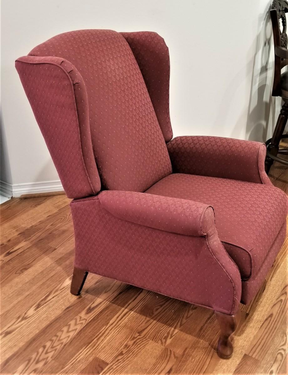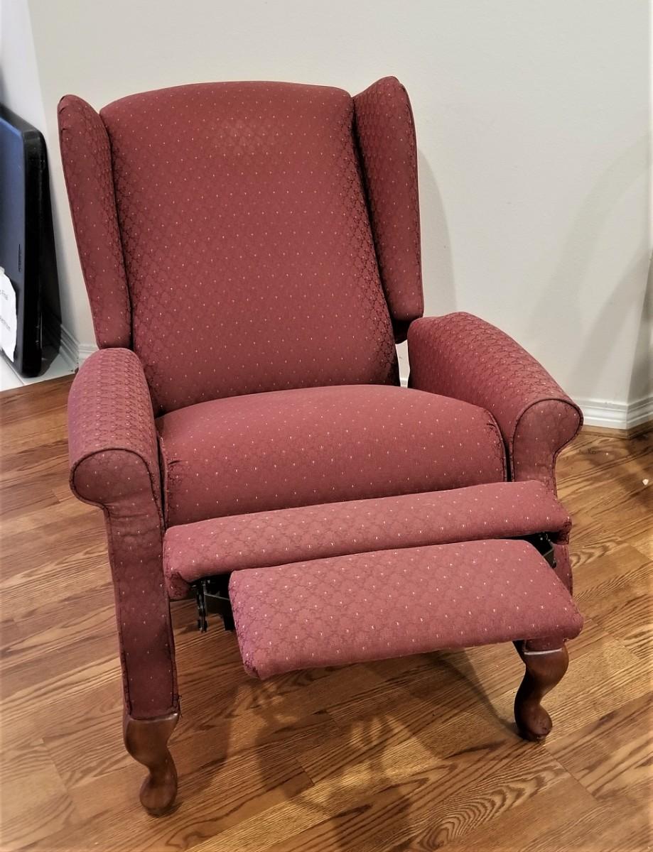 Lazy-Boy brand Wing Back Recliner - comfy and clean. Reclines all the way back to sleep position. Check the photos - the arm protectors have never been taken out of the bag. 40" tall, 34" deep, 29.5" across