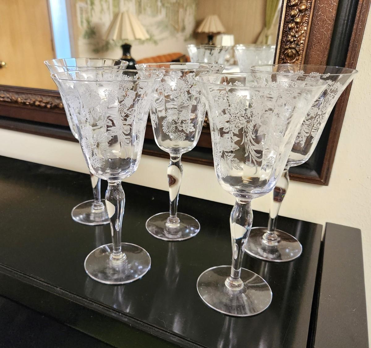 These glasses match those in an earlier lot - they have a very dainty bird design we have not been able to identify. This is obviously quality crystal - Fostoria? Tiffin? Cambridge? If you know, let us know. Each 7.5" tall.