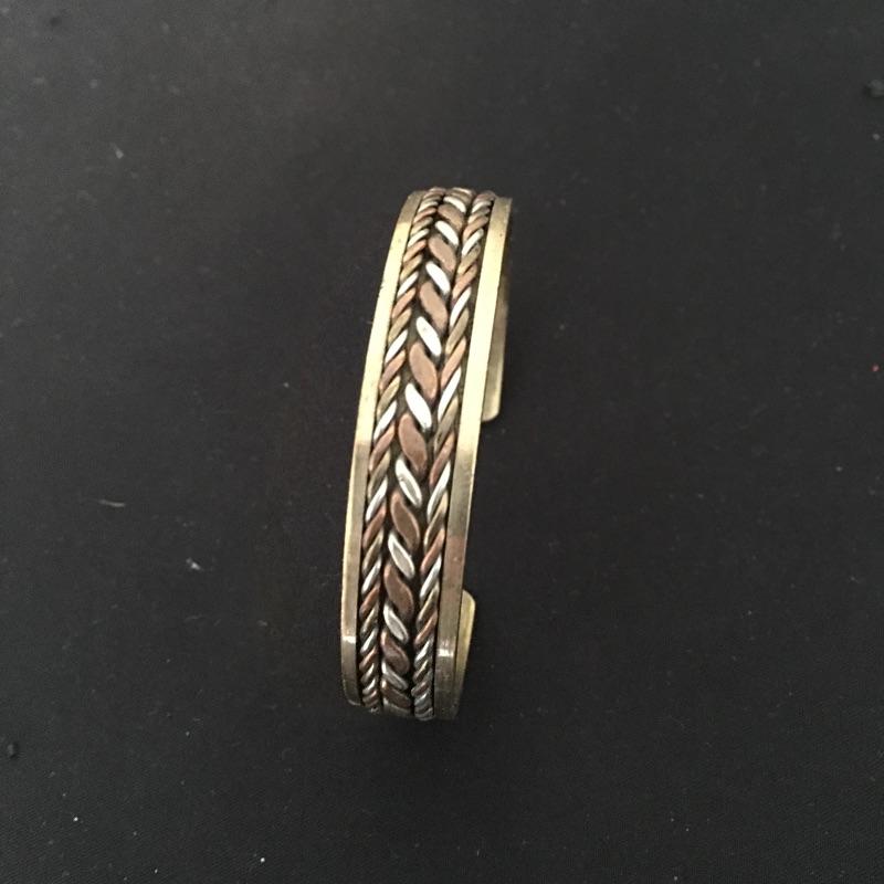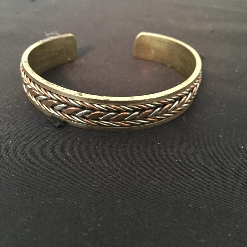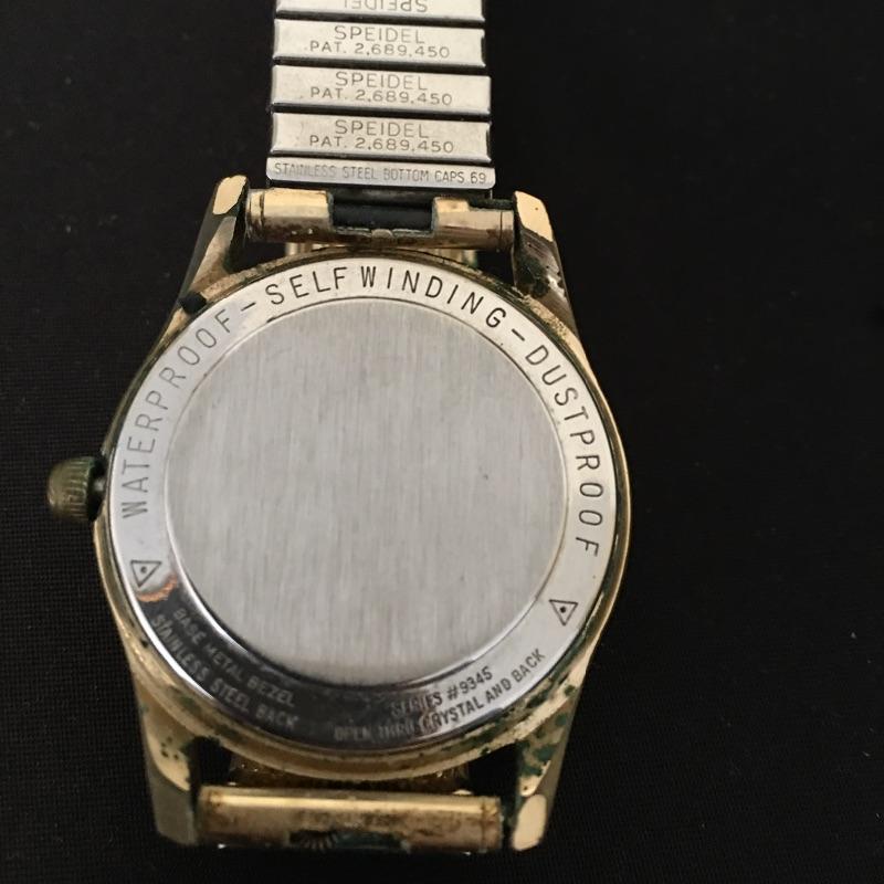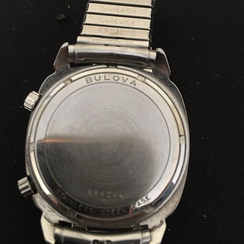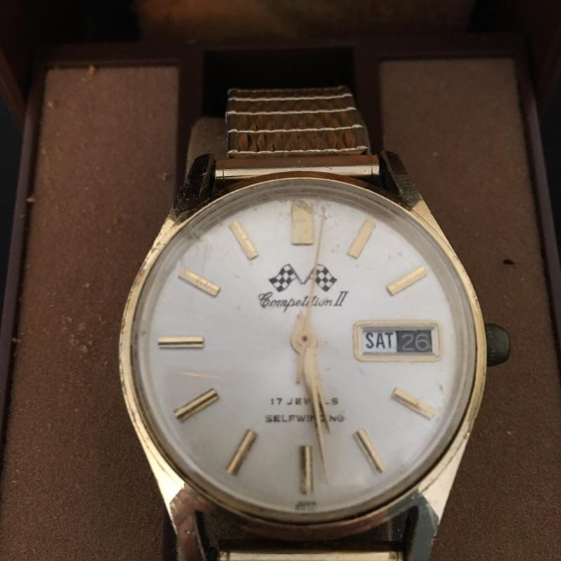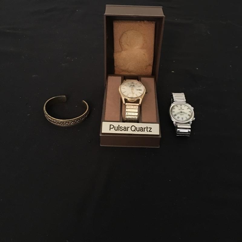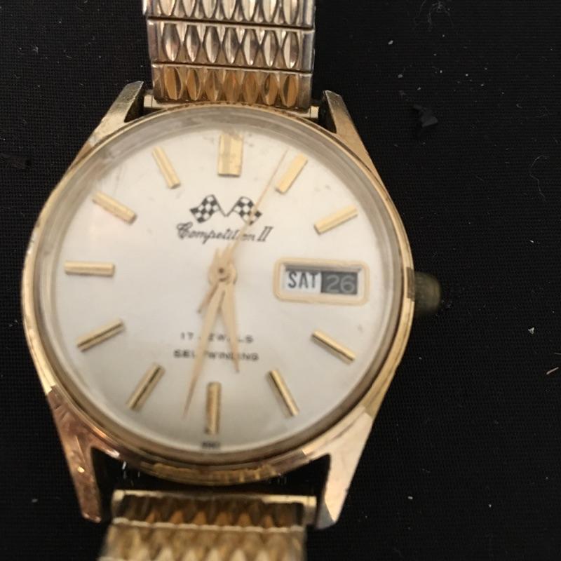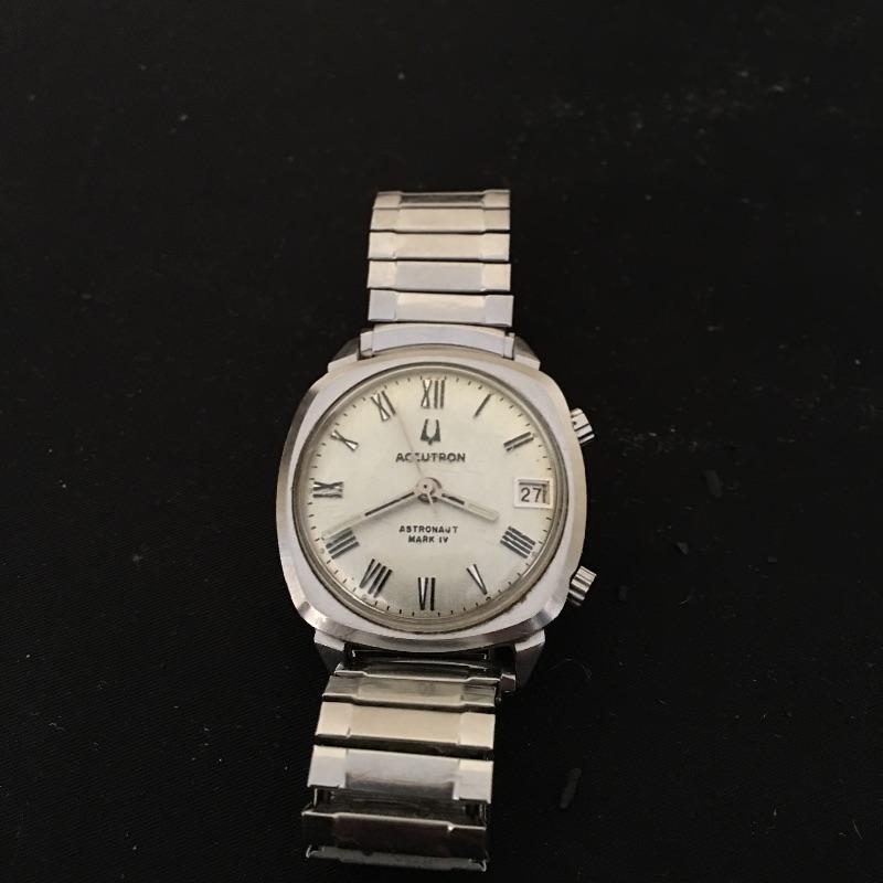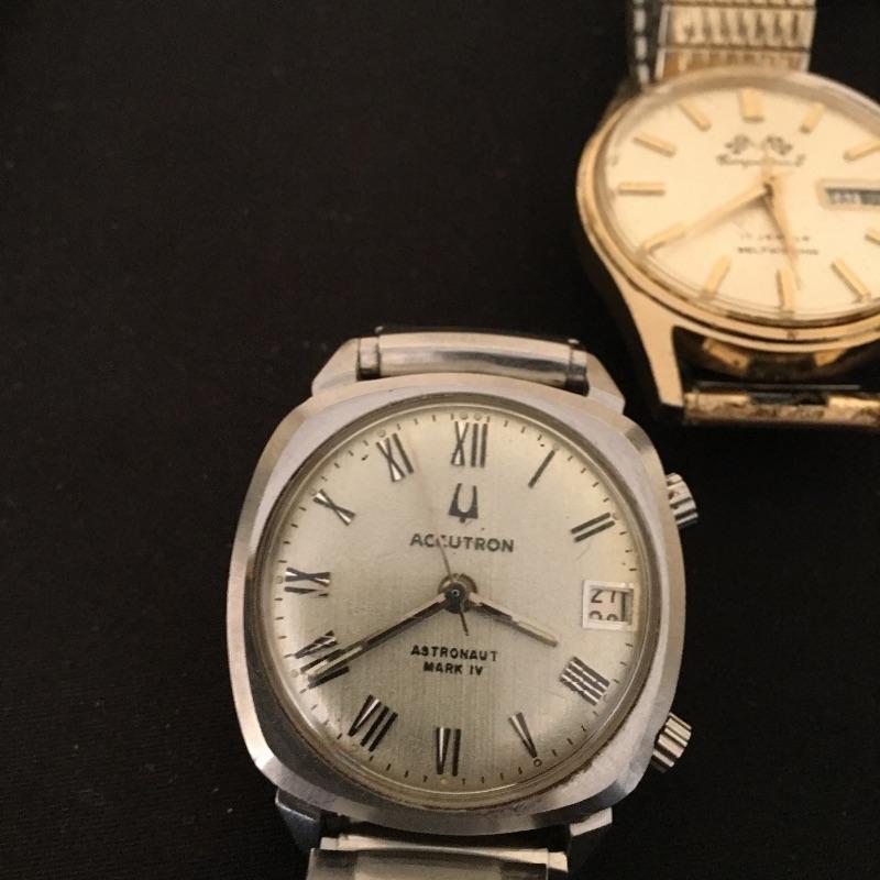 This pair of watches includes a Bulova Accutron, Astronaut Mark IV watch and a Competition 11 17 jewel self winding watch. Also includes cuff bracelet in what appears to be copper and aluminum. Competition 11 watch worked when tested and Bulova did not work. Battery likely dead