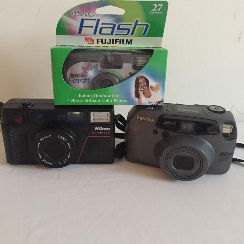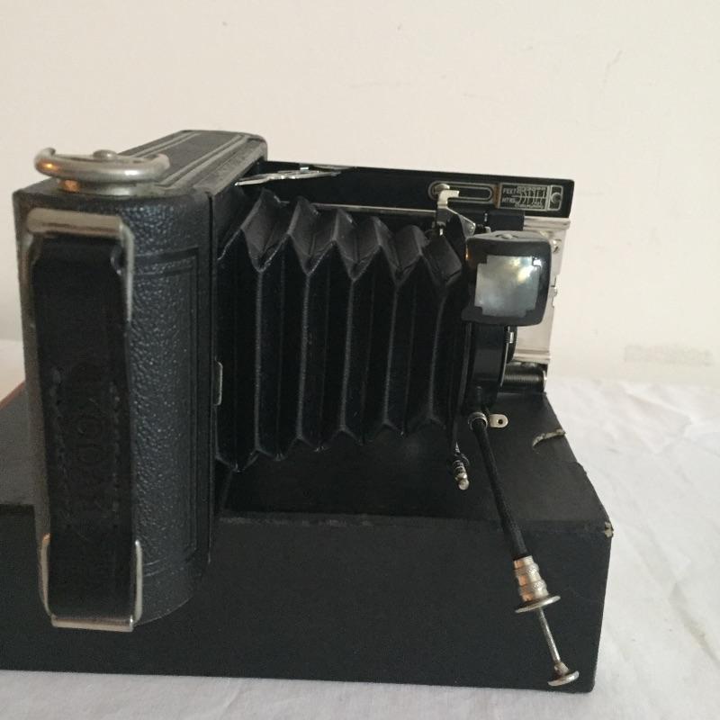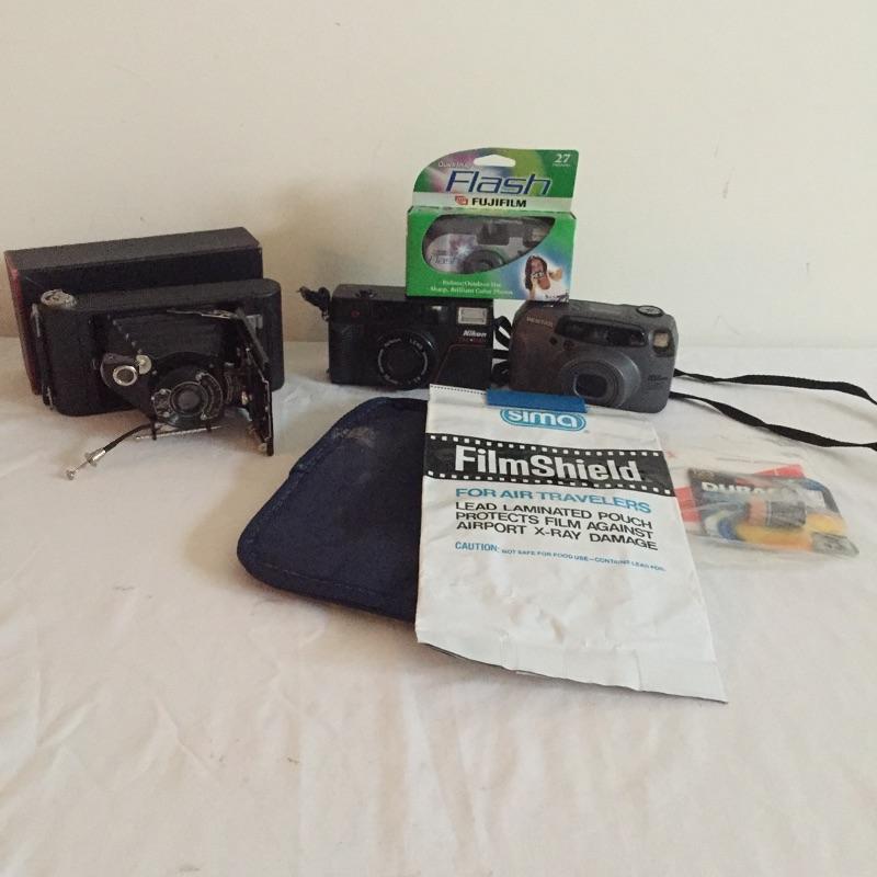 Nostalgic no. 1 Kodak pocket camera with a pair of newer film cameras and two bags for travel. Beautiful Kodak pocket camera is sure to bring back great memories and wonderful to display.
