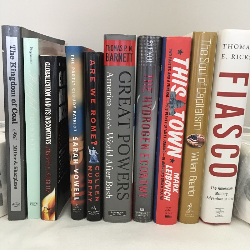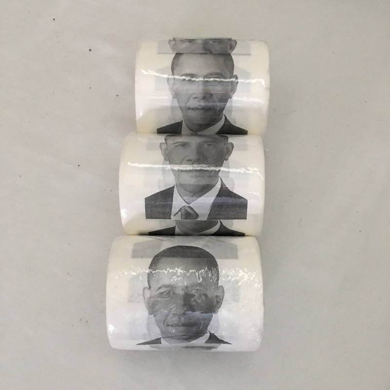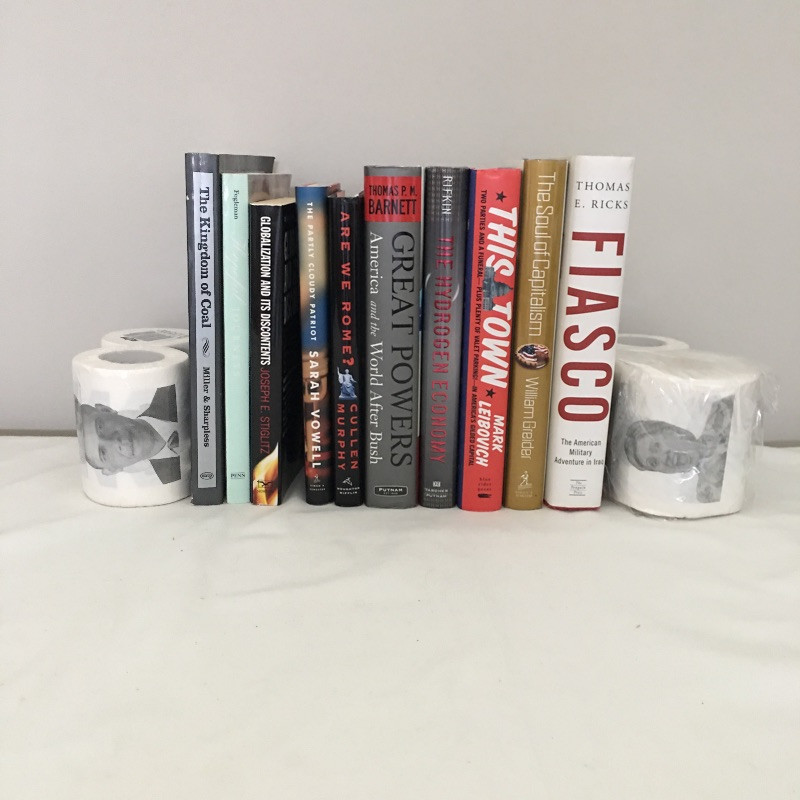 Ten books on politics and four novelty toilet paper rolls with pictures of Obama and Hillary Clinton. Get the discussion started with this interesting collection of books and gag toilet paper rolls.