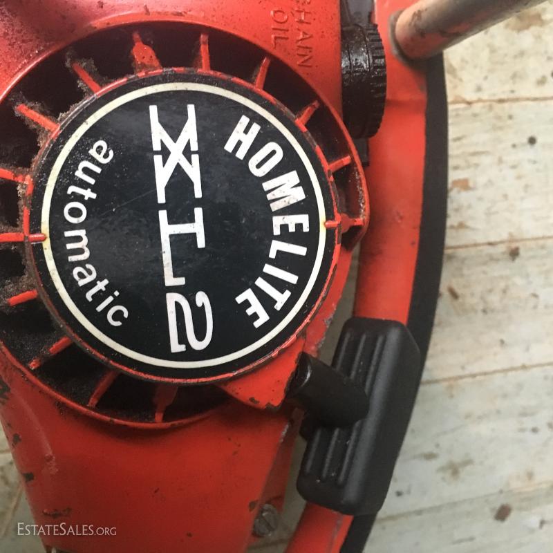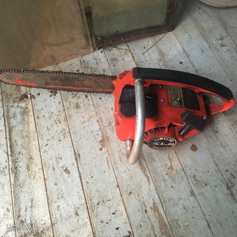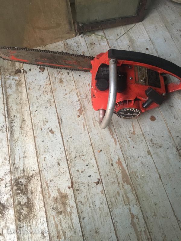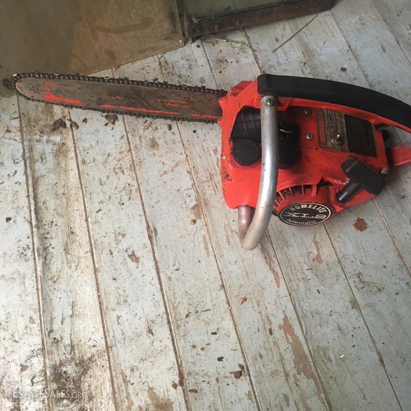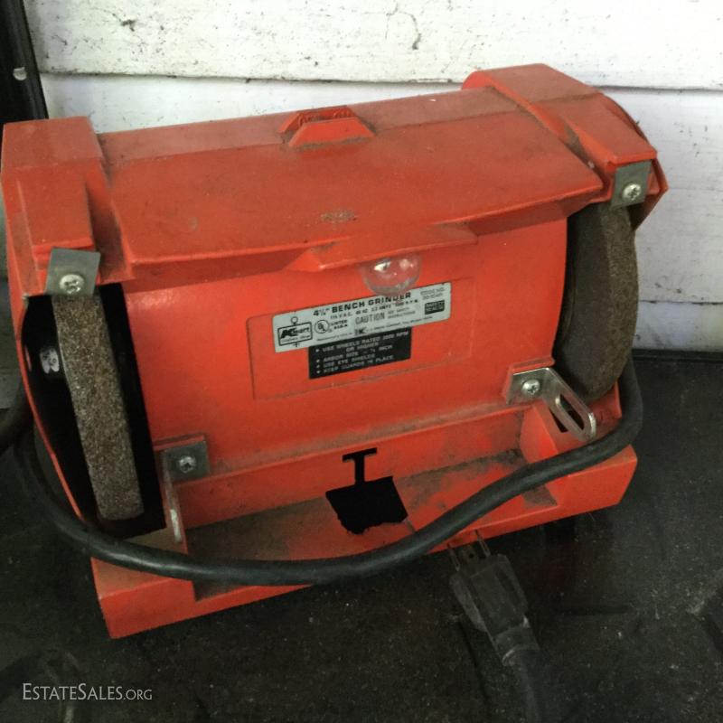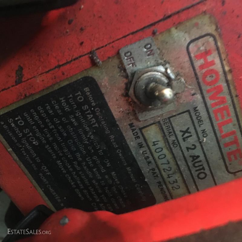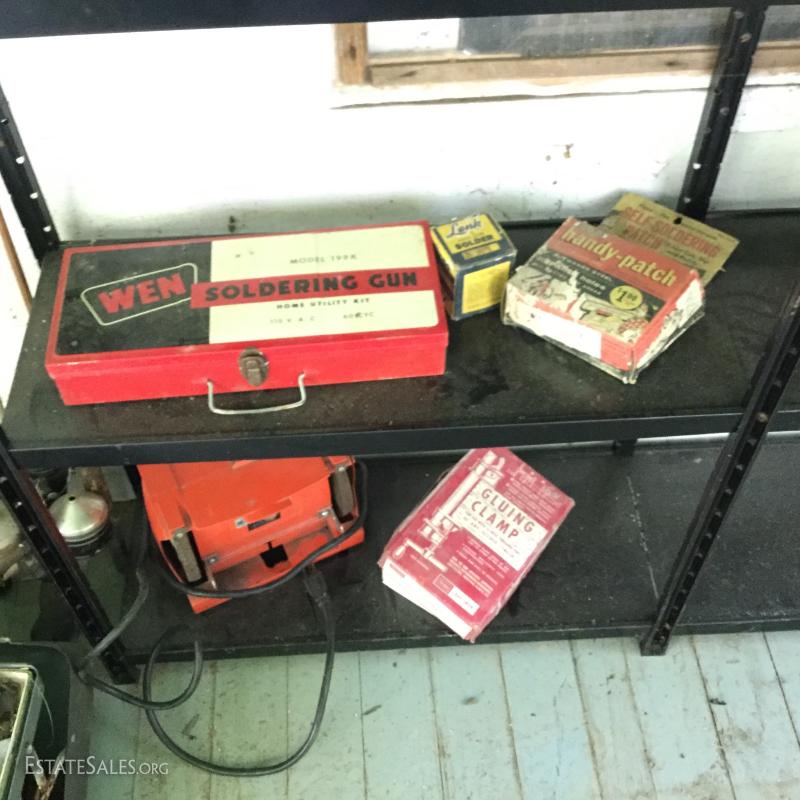 4.5" Bench Grinder and Soldering gun with supplies. Gluing clamp. Homelite XL2 chainsaw that has not been started. Local pick up in Saluda, NC. Shelf not included.