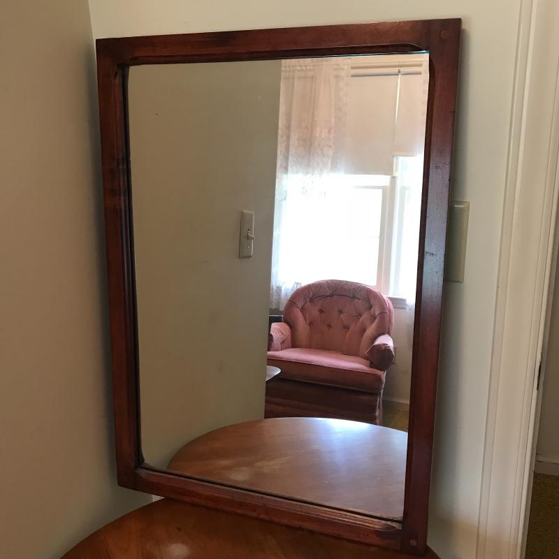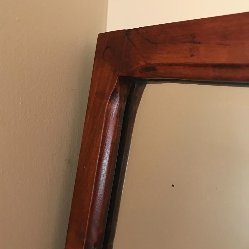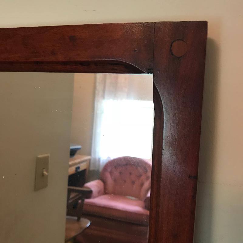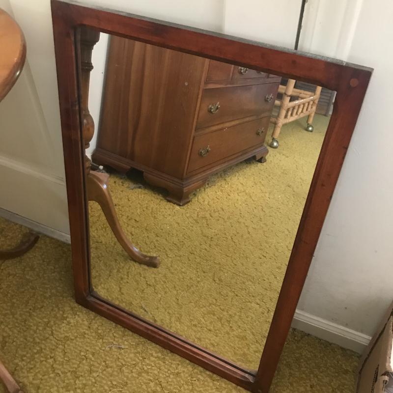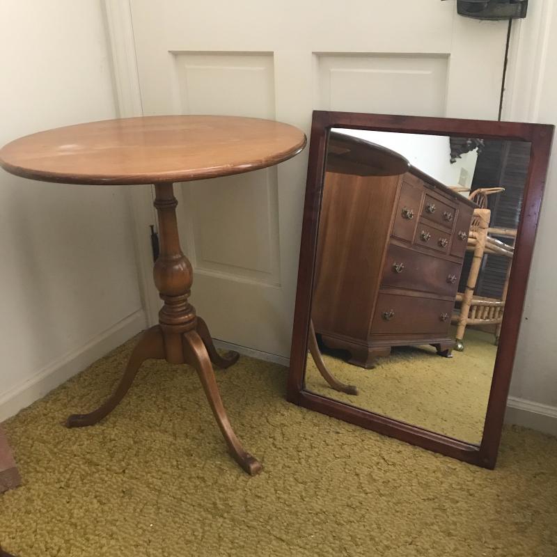 Handsome duo- Leopold Stickley 1957 Side table measures 24”x26.75” is a solid piece with moderate wear to top and legs. Mirror is a stunning cherry color, heavy with nailed backing and very few, hardly noticeable nicks in bottom part of frame. Local pick up only.