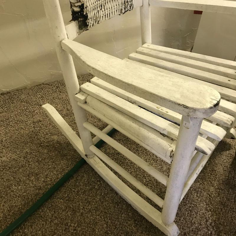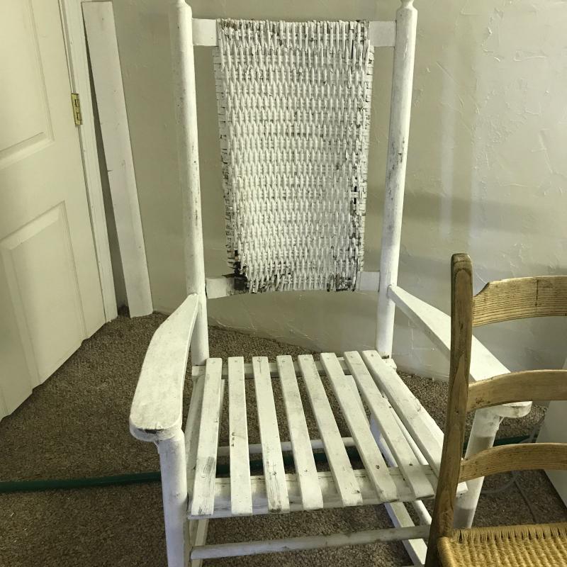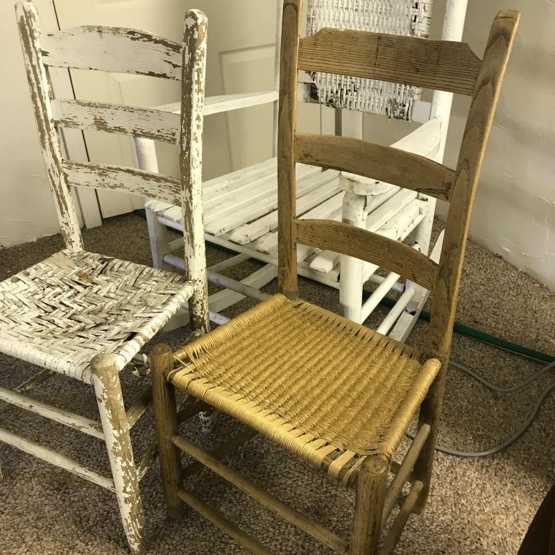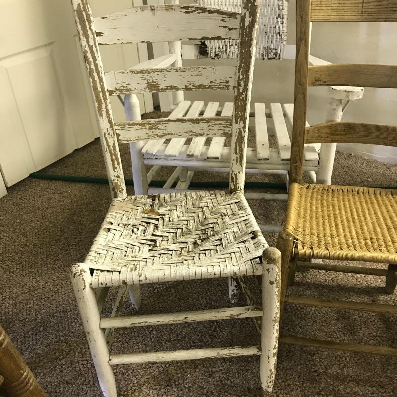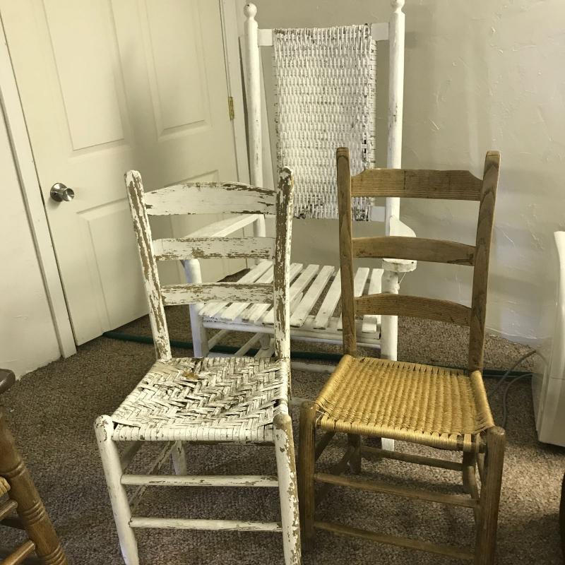Lot includes three chairs in various styles and conditions. Rocking chair is approx. 27” x 22” x  47” h. Two need some repairs or reinforcement. No shipping available.