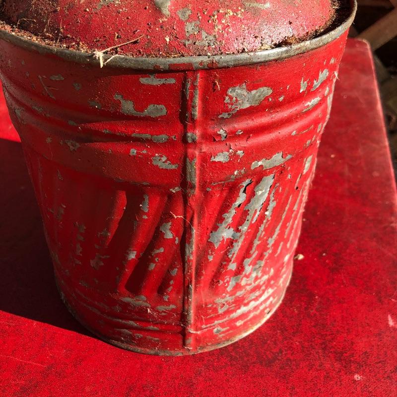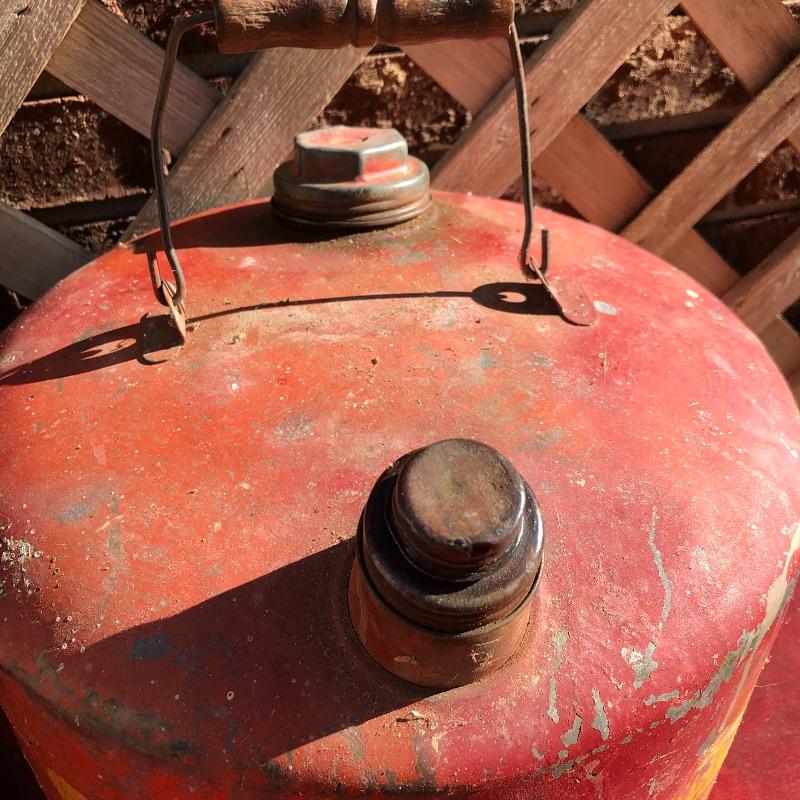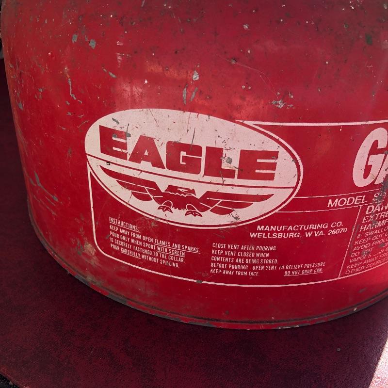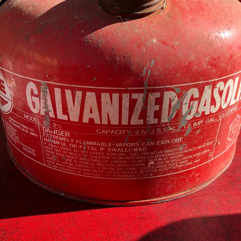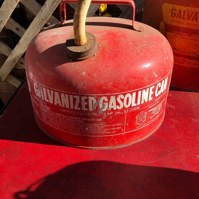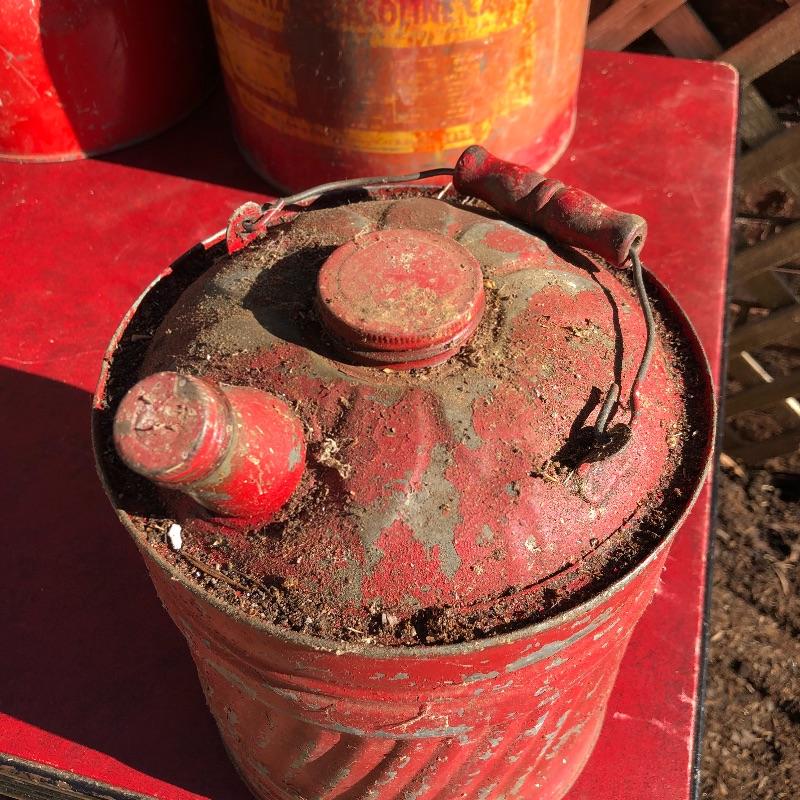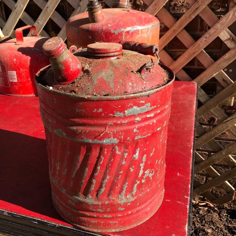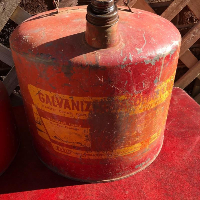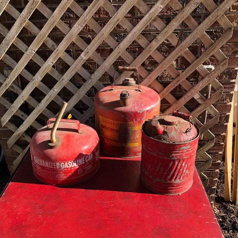 This lot contains three gas cans. They are purely for design and decorative purposes, as they are not up to code. However, they are very much a collectors item. The largest one (back, middle) measures 12.5” x 12.5” x 12”. Local pickup only.