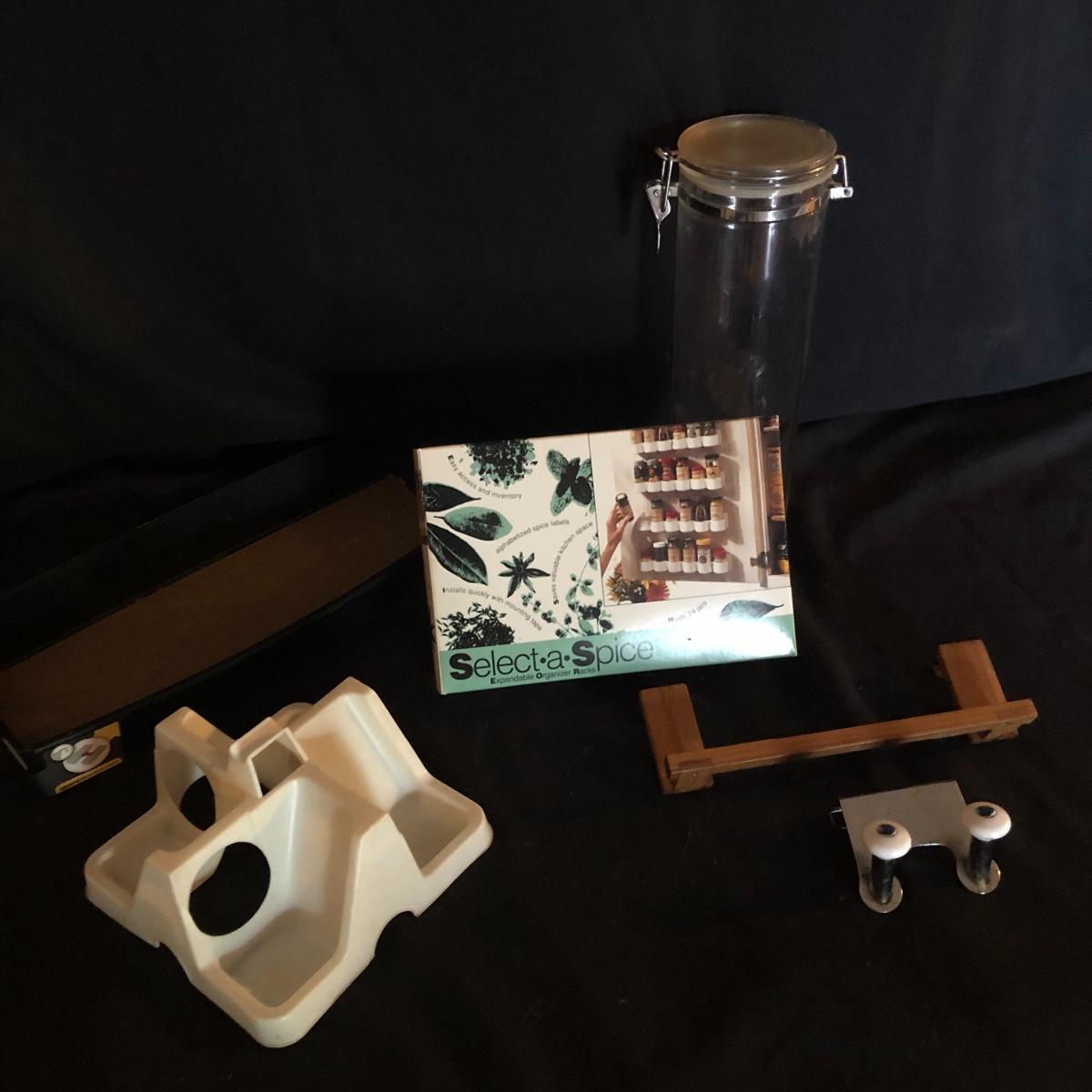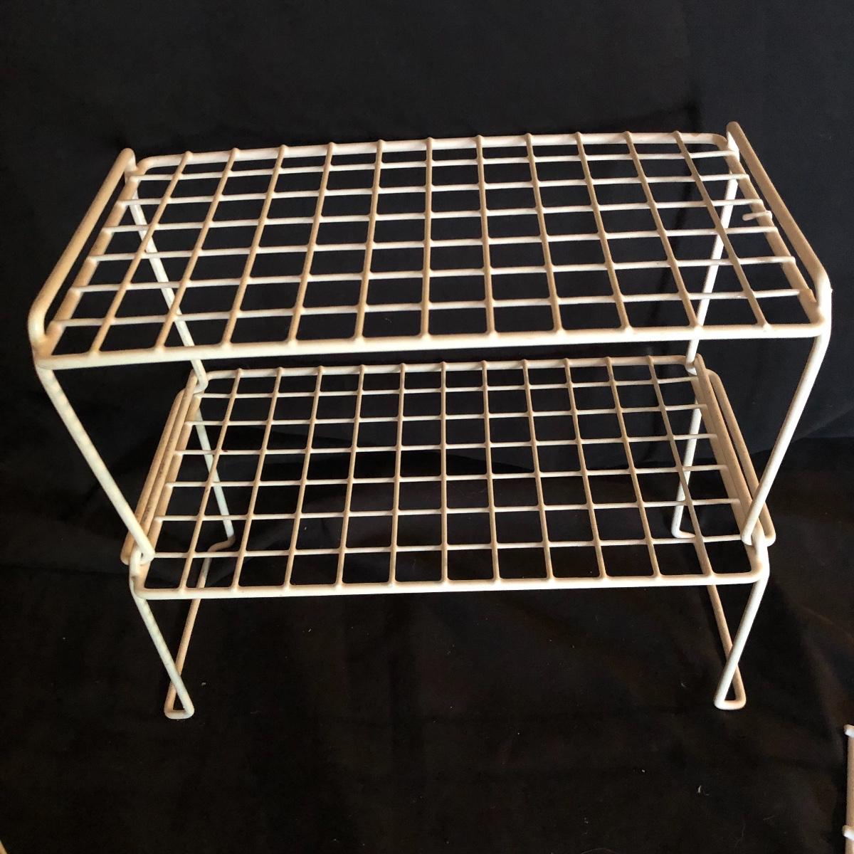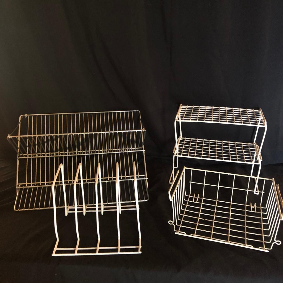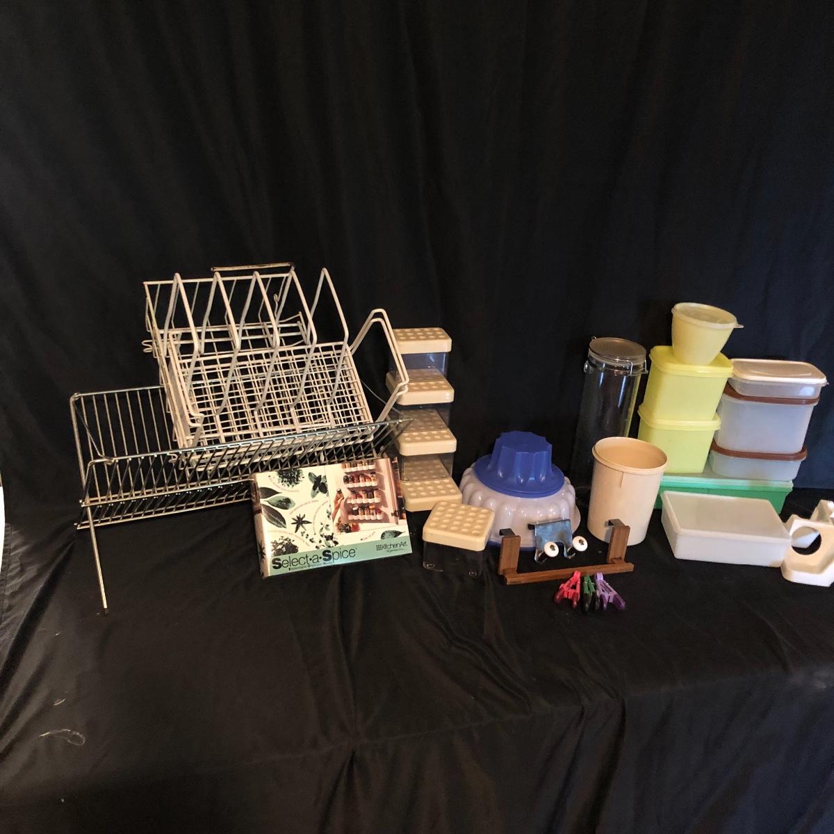 Organize and containerize your kitchen with this lot. It contains three cabinet racks and a metal dishwasher rack, ten Tupperware containers and five hard plastic containers, spice organizers and more! All Tupperware containers have lids except for the round tall container. The metal dish rack measures approximately 20” x 9.5”. Local pick up only.