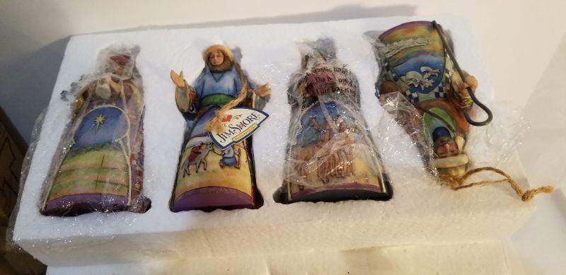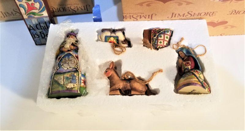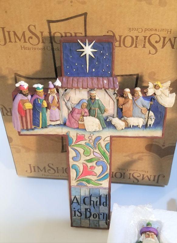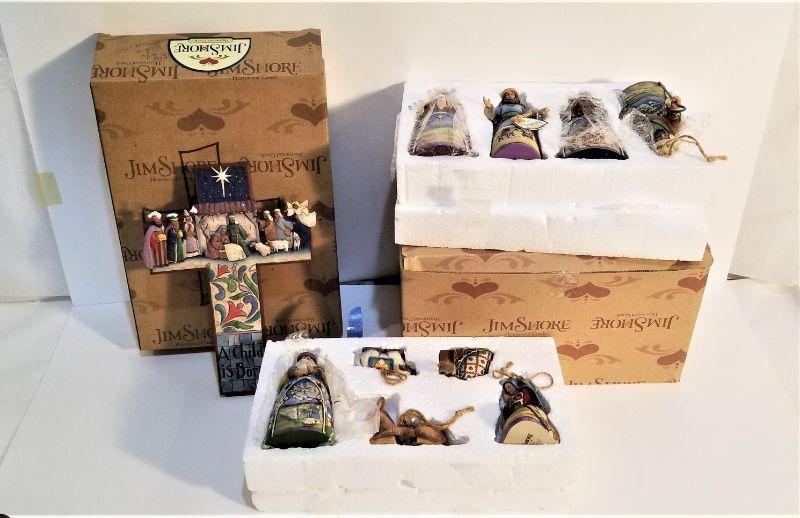 Jim Shore produces holiday decorations for higher end department stores - here is a two piece lot featuring a Christmas Nativity Cross (9" tall) and a set of Nativity Christmas ornaments new in box (9 pieces). Purchased in 2007 at a cost of $66.00.