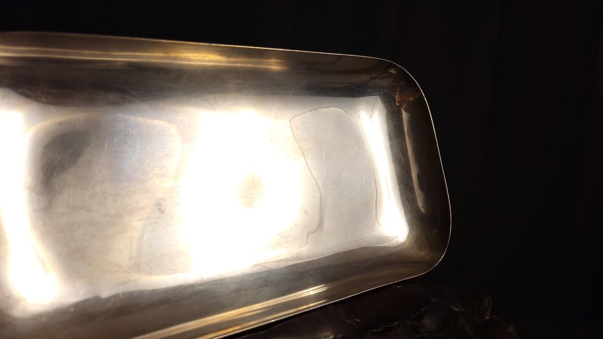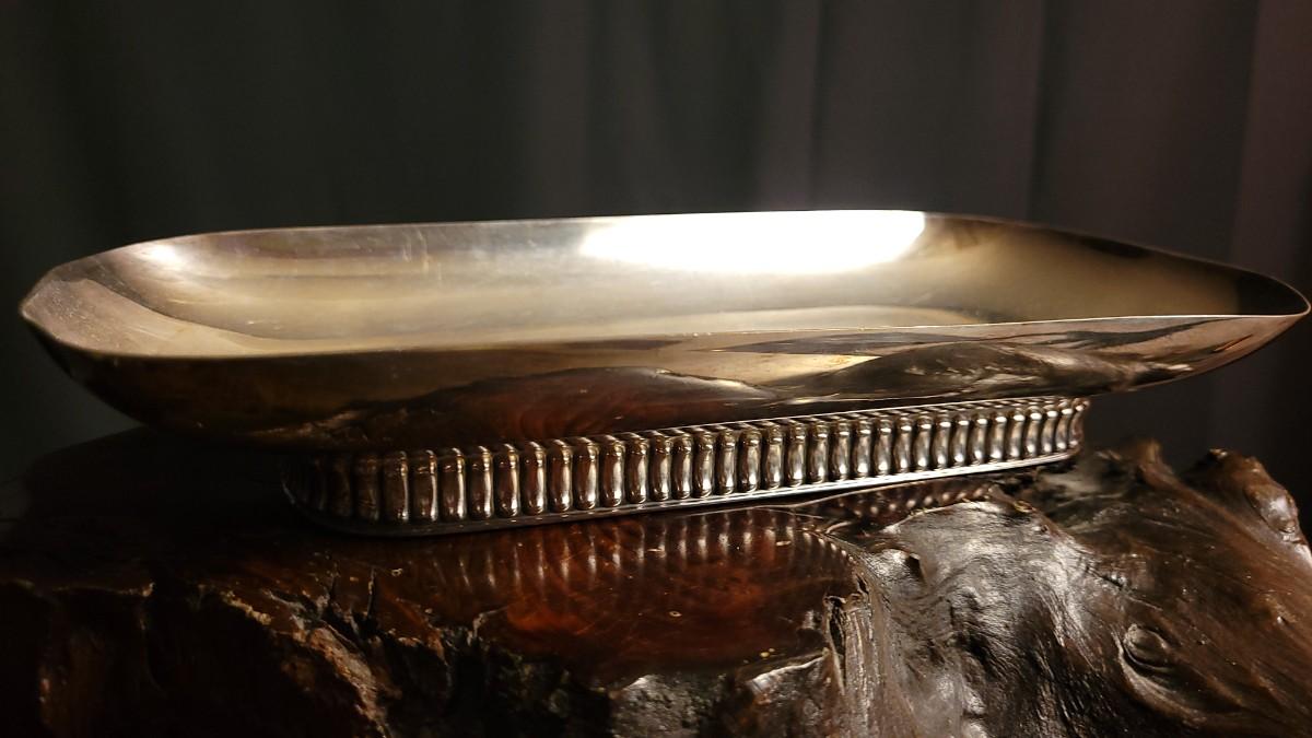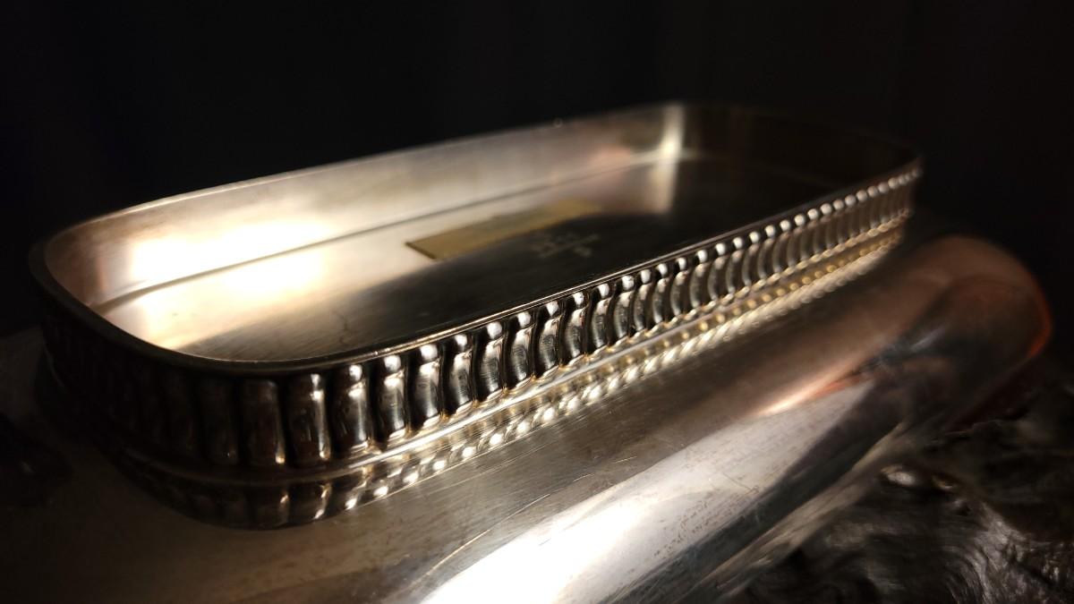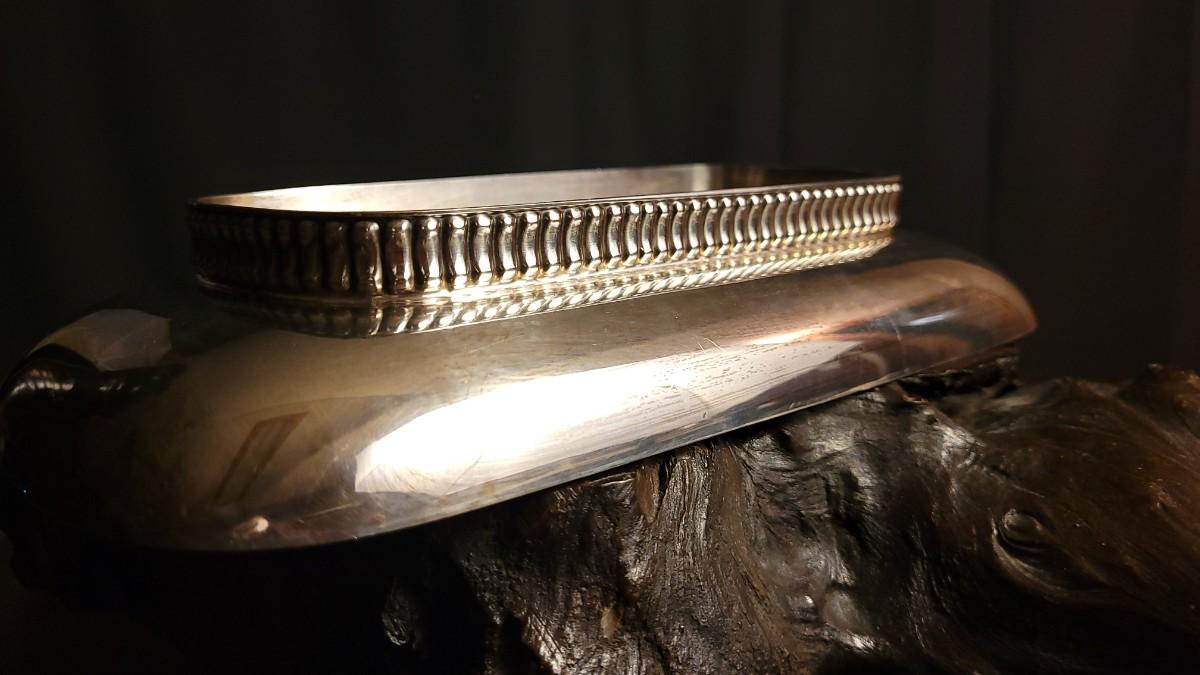 This lot features a Vintage REED & BARTON Silverplated Serving Platter. Measures about 10.75" x 5.5" x 1.75". Unpolished. No major dings or scratches observed during inspection.