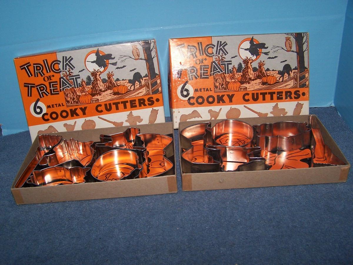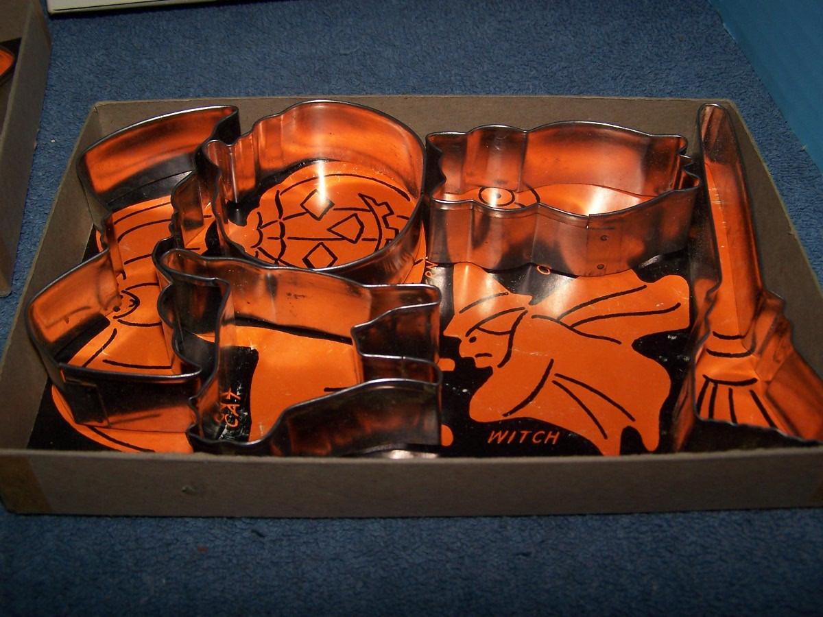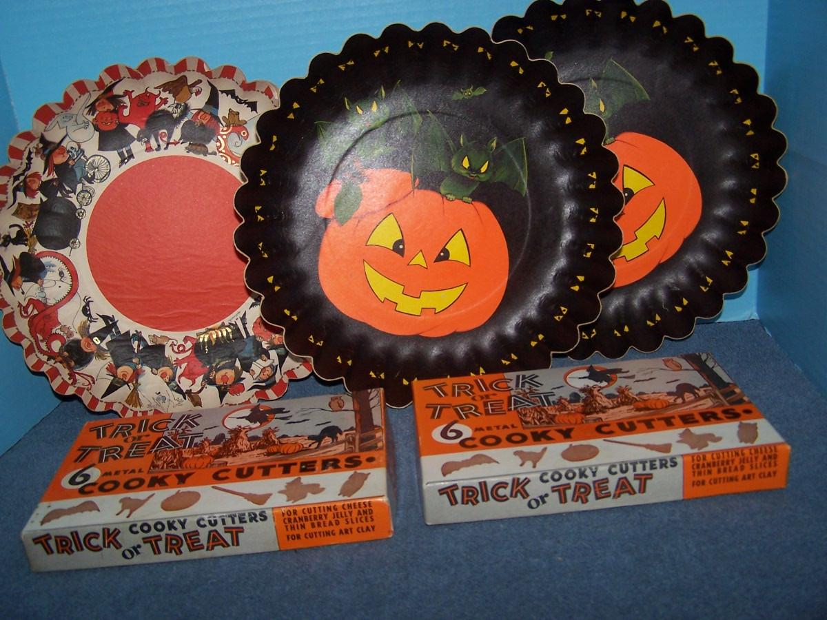 THIS IS SOME WONDERFUL VINTAGE HALLOWEEN ITEMS.. CARDBOARD BOWLS 10 1/2'' ACROSS, 1 IS AN OLD HALLMARK PIECE-MADE IN WESTERN GERMANY.. 1 COOKIE CUTTER IS MISSING... LIGHT WEAR..