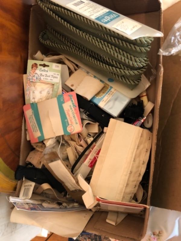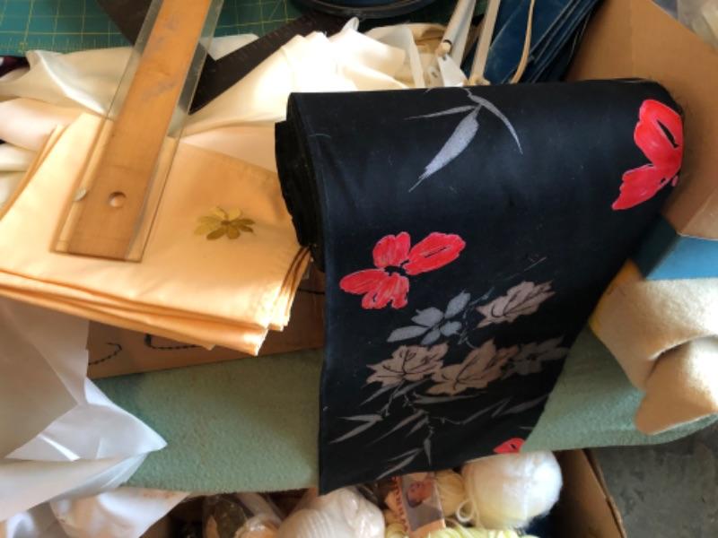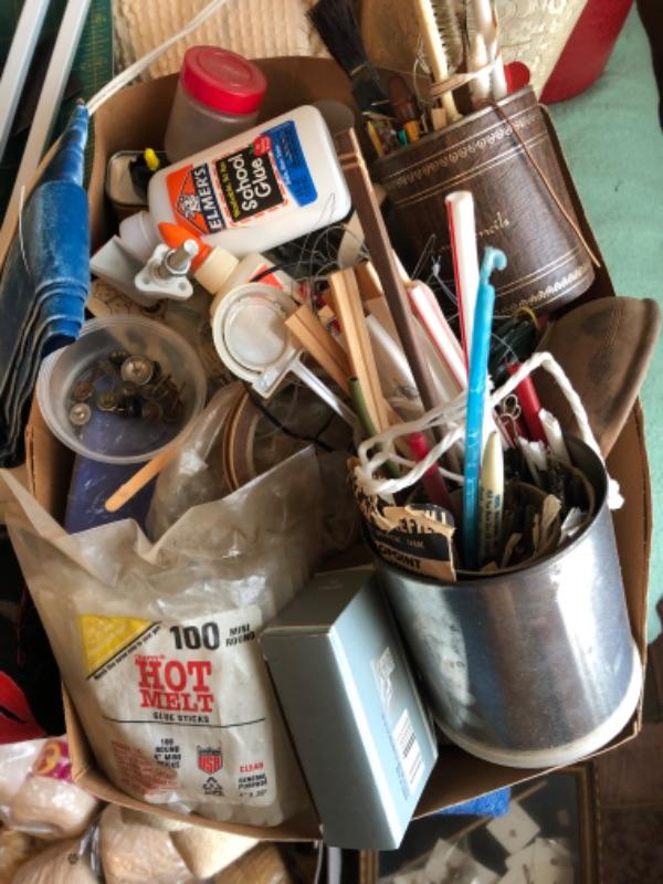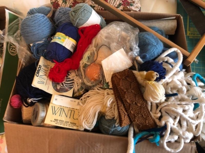 Lot 145F. Huge collection of crafting supplies“”knitting and crochet needles, yarn, embroidery hoops, T-square, trims, yarns, flowers, embroidery floss, buttons, darning eggs, rotary knife, cutting mats, etc.--$125