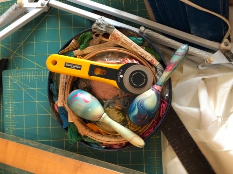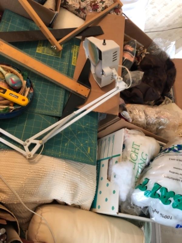 Lot 145F. Huge collection of crafting supplies“”knitting and crochet needles, yarn, embroidery hoops, T-square, trims, yarns, flowers, embroidery floss, buttons, darning eggs, rotary knife, cutting mats, etc.--Was $125 “” NOW $75