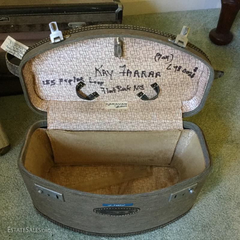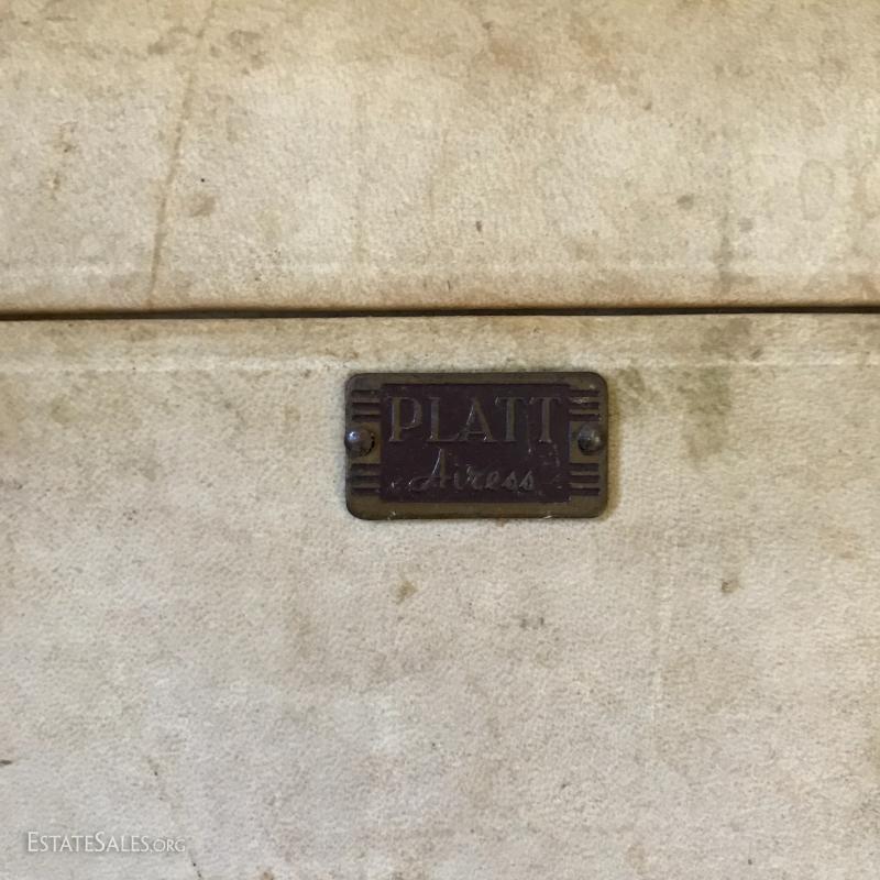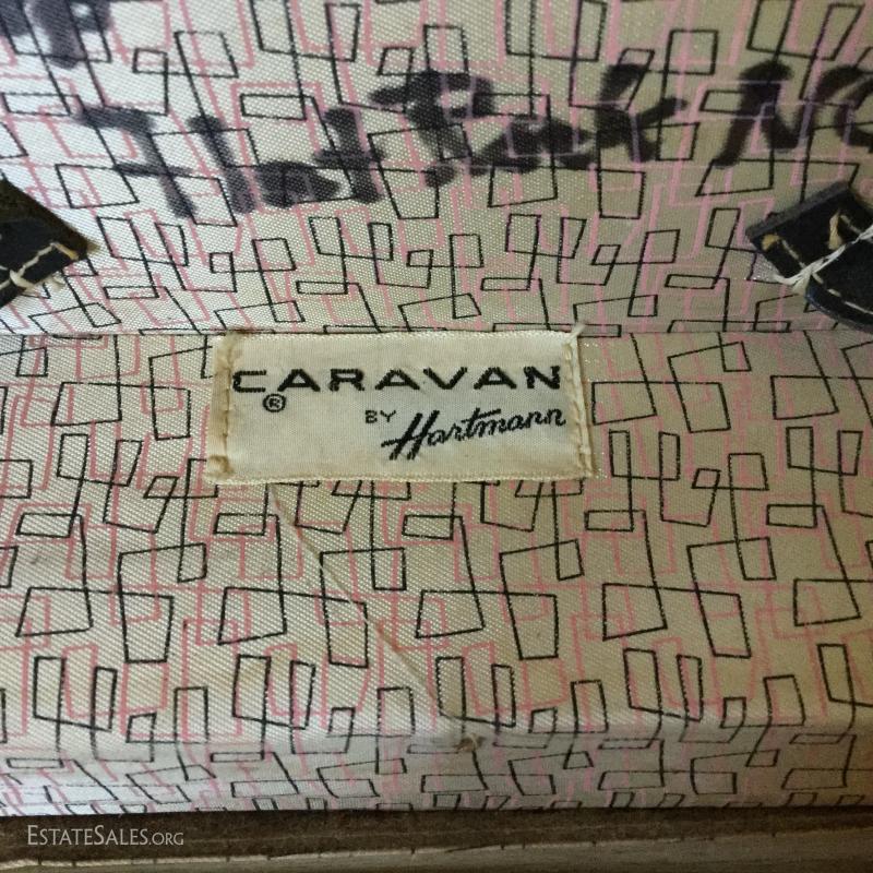 Great vintage set of Hartmann luggage. Includes large Skymate by Hartman piece with key that measures 24"l x 15"w x 9"h, matching smaller Caravan by Hartmann piece that measures 15"l x 8"w x 9"h. Both have similar pattern and black trim. There are stains on both and the smaller piece has marker written on inside. Smaller cream colored vintage Platt Airess Luggage piece is also included in this lot. Needs work to restore to original splendor.