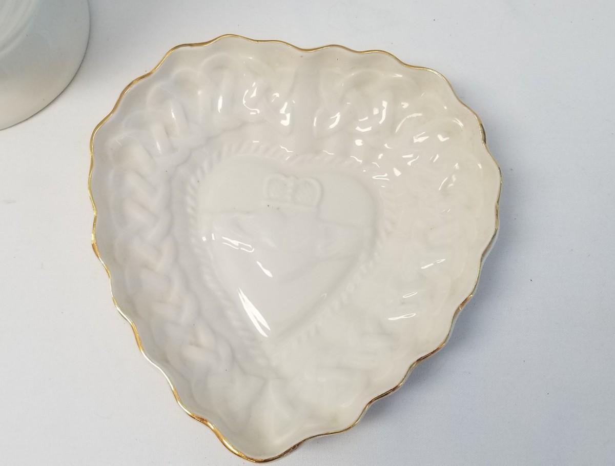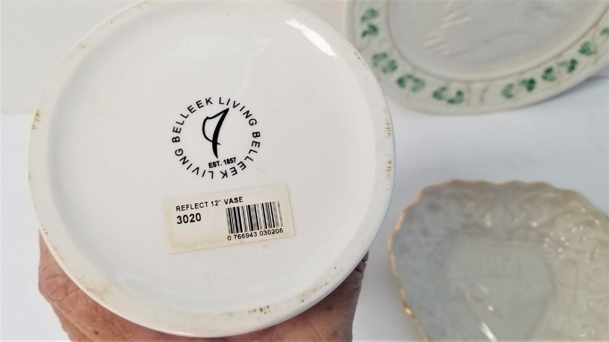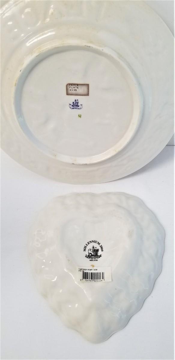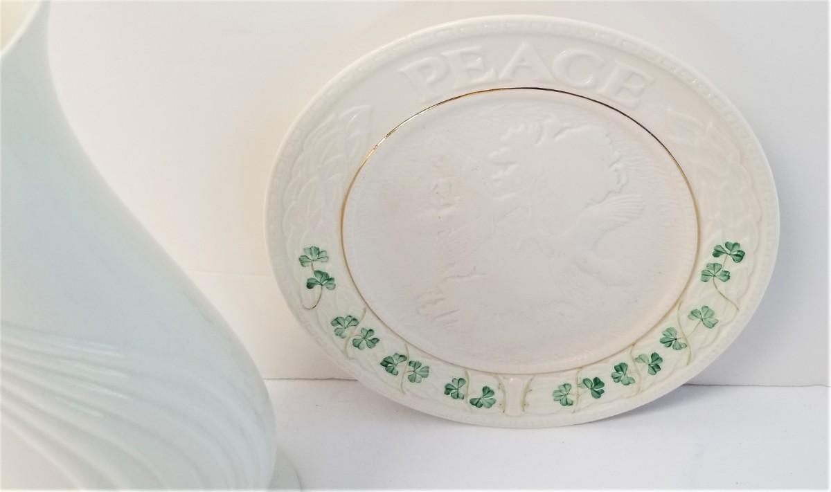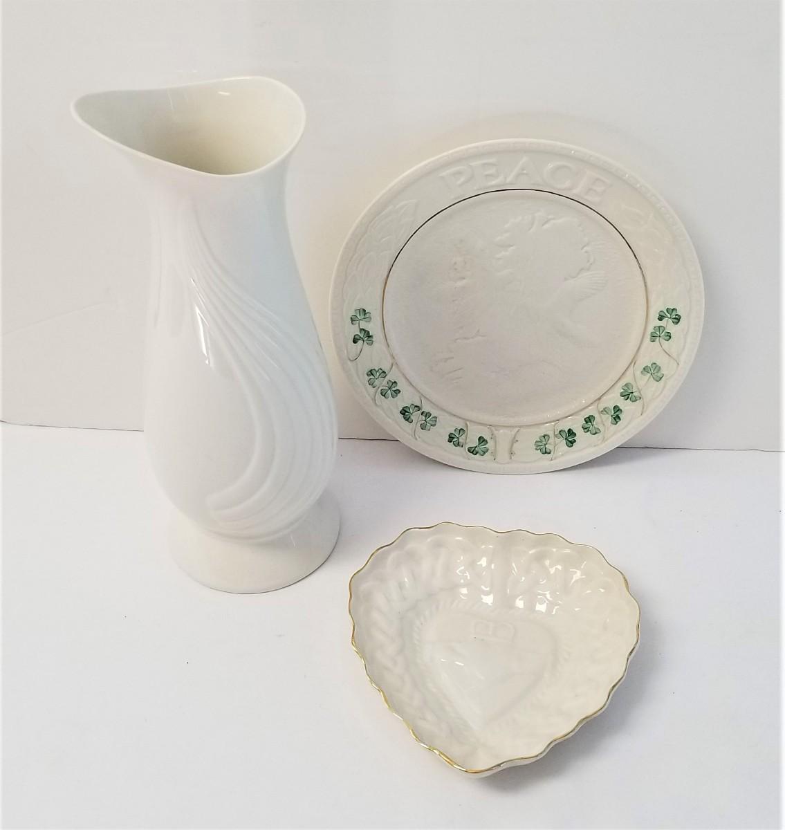 Three nice pieces of Belleek porcelain - large vase (12" tall), heart shaped dish (7" long), and a Peace Plate (9.25" across). All fully marked and in good condition.