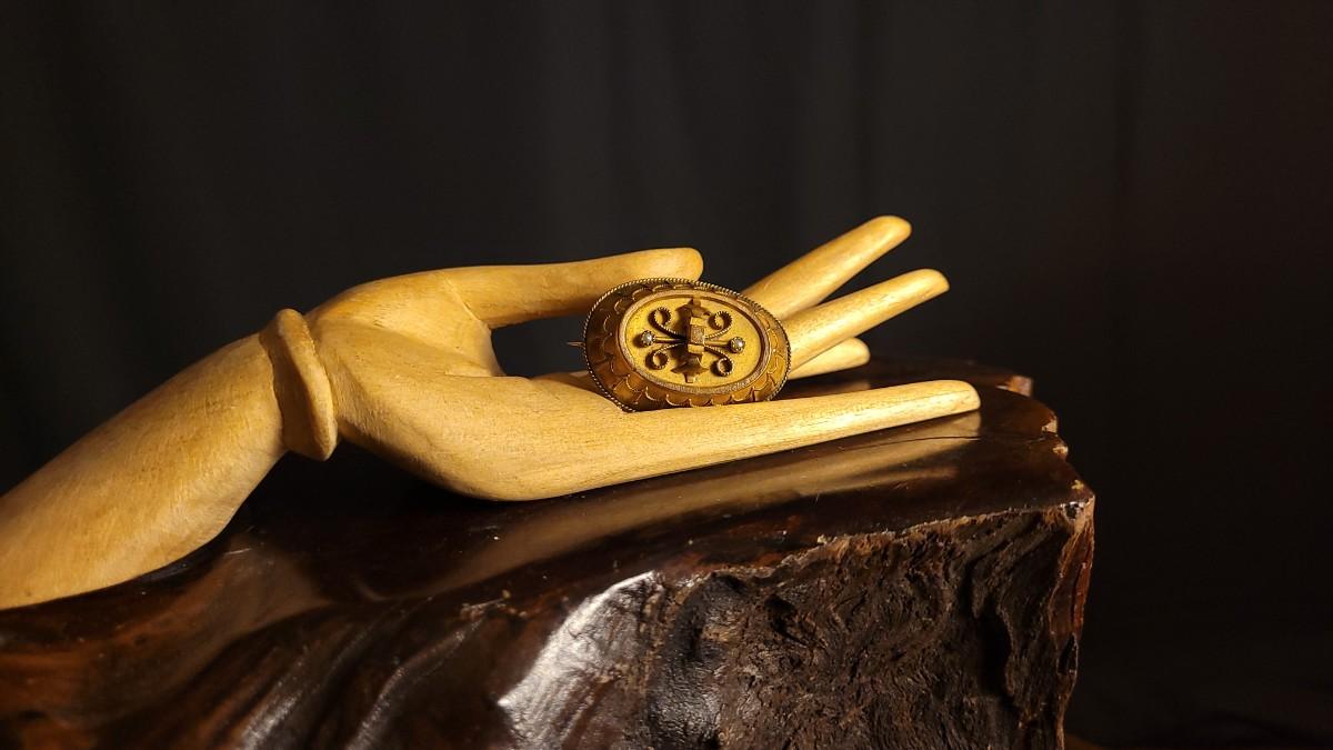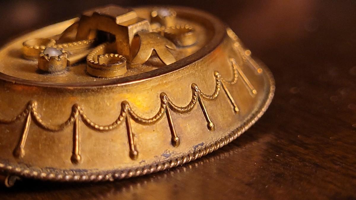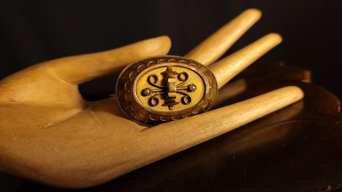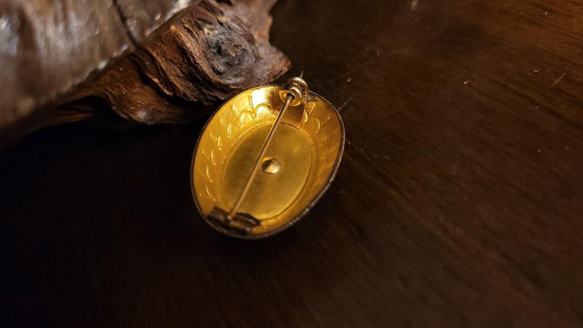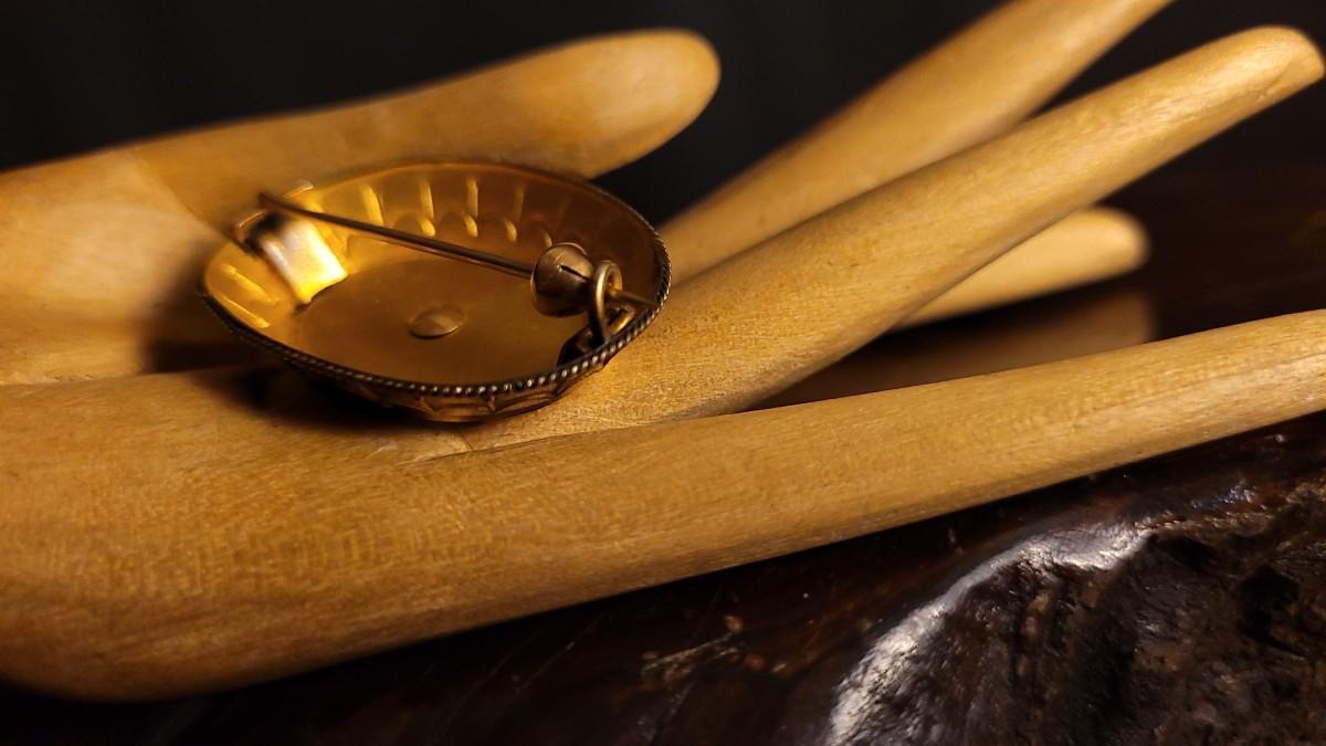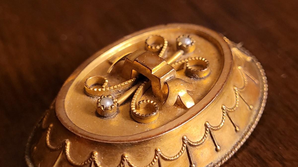 Tested as 14kt. This lot features a Vintage Costume Jewelry Brooch in gold tone. Two Faux pearl Accents adorn each side of the Ornate design in the center. The pin measures about 1.5" Wide. The reverse pin Clasp works as intended.