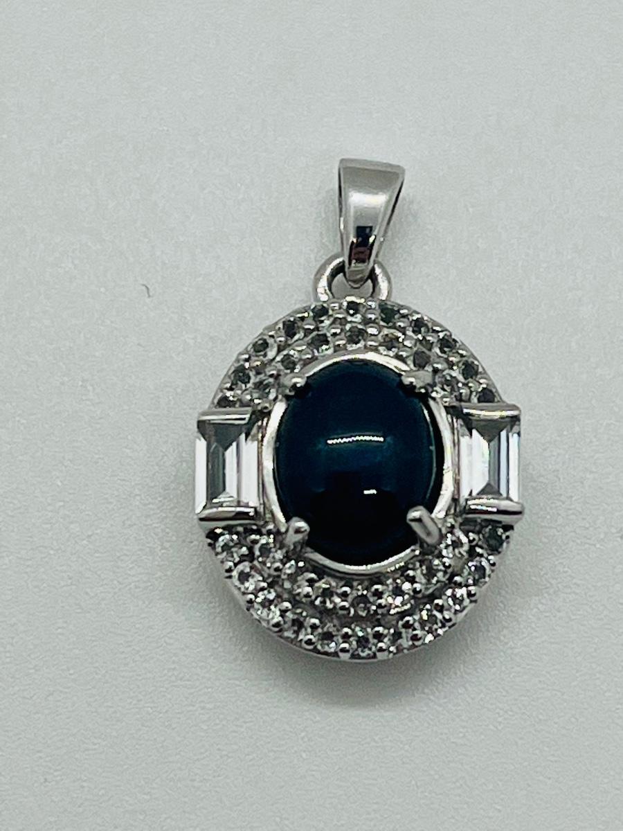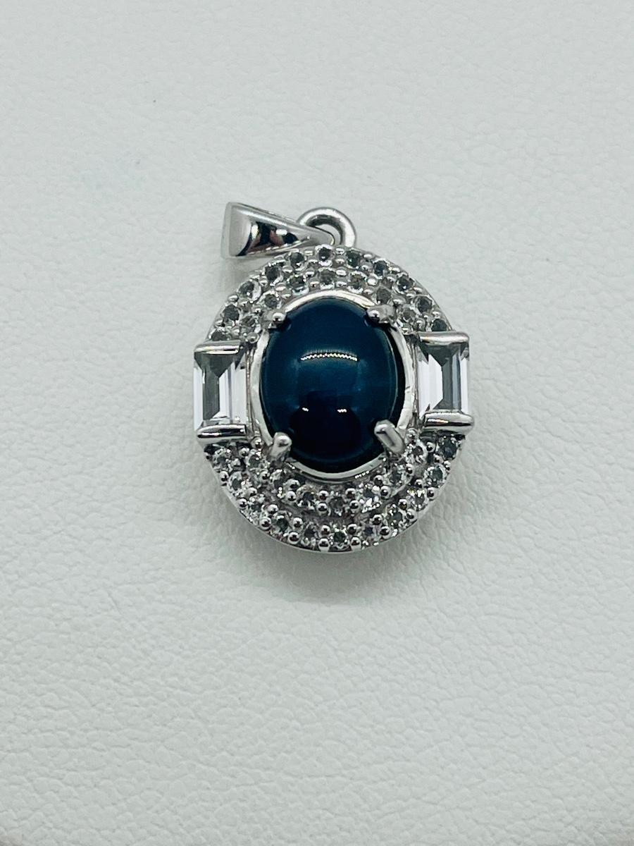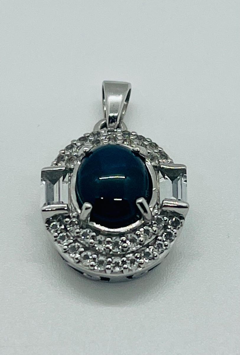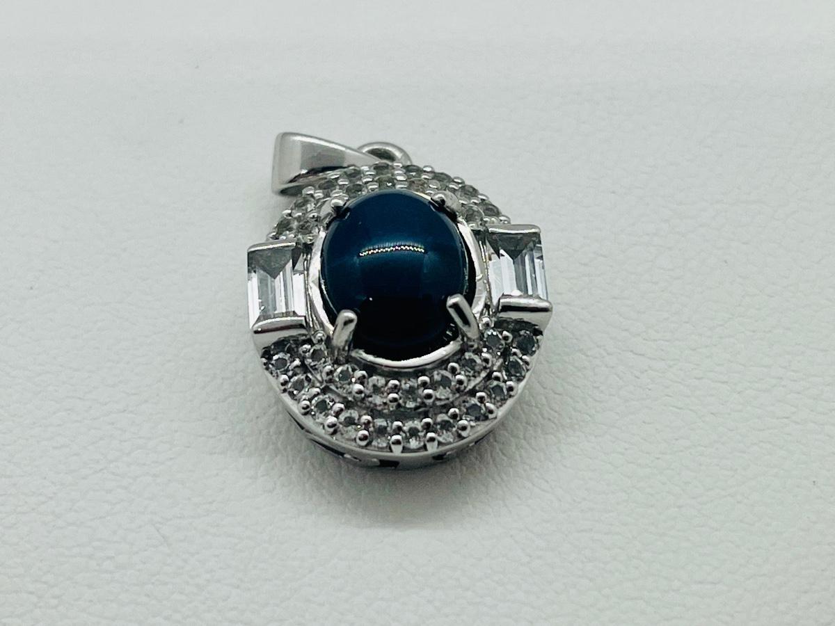 Lot 146: 925 KH Thailand Blue Star Sapphire Oval Pendant Surrounded by Diamonds, Flanked by 2 Diamond Baguettes