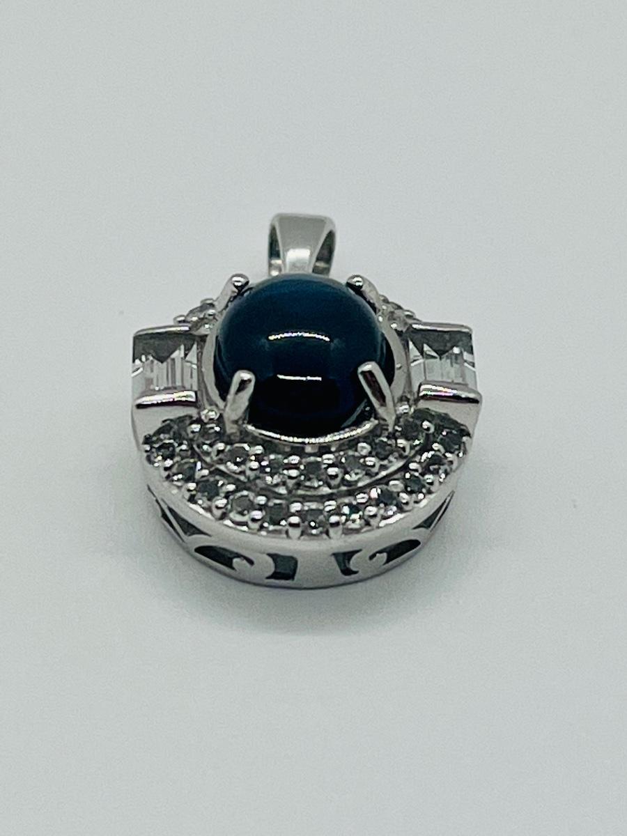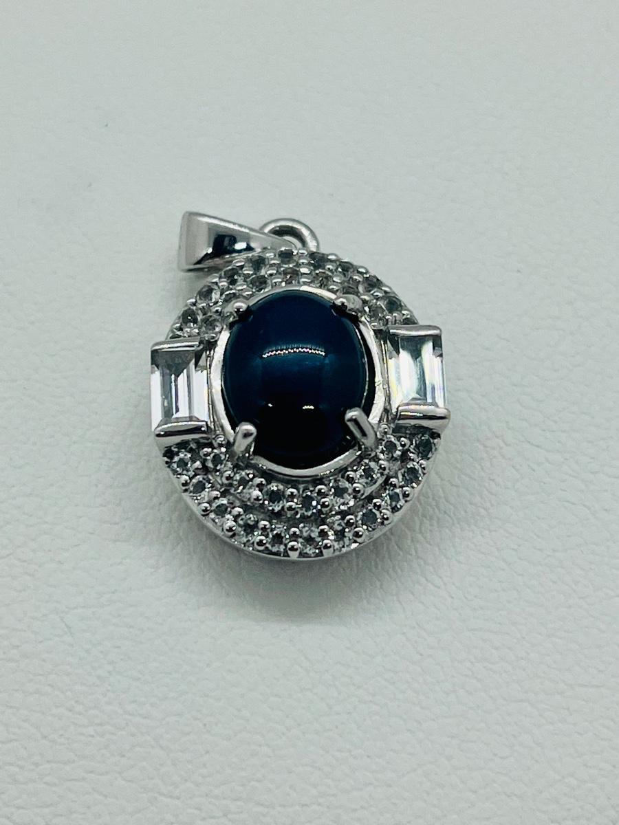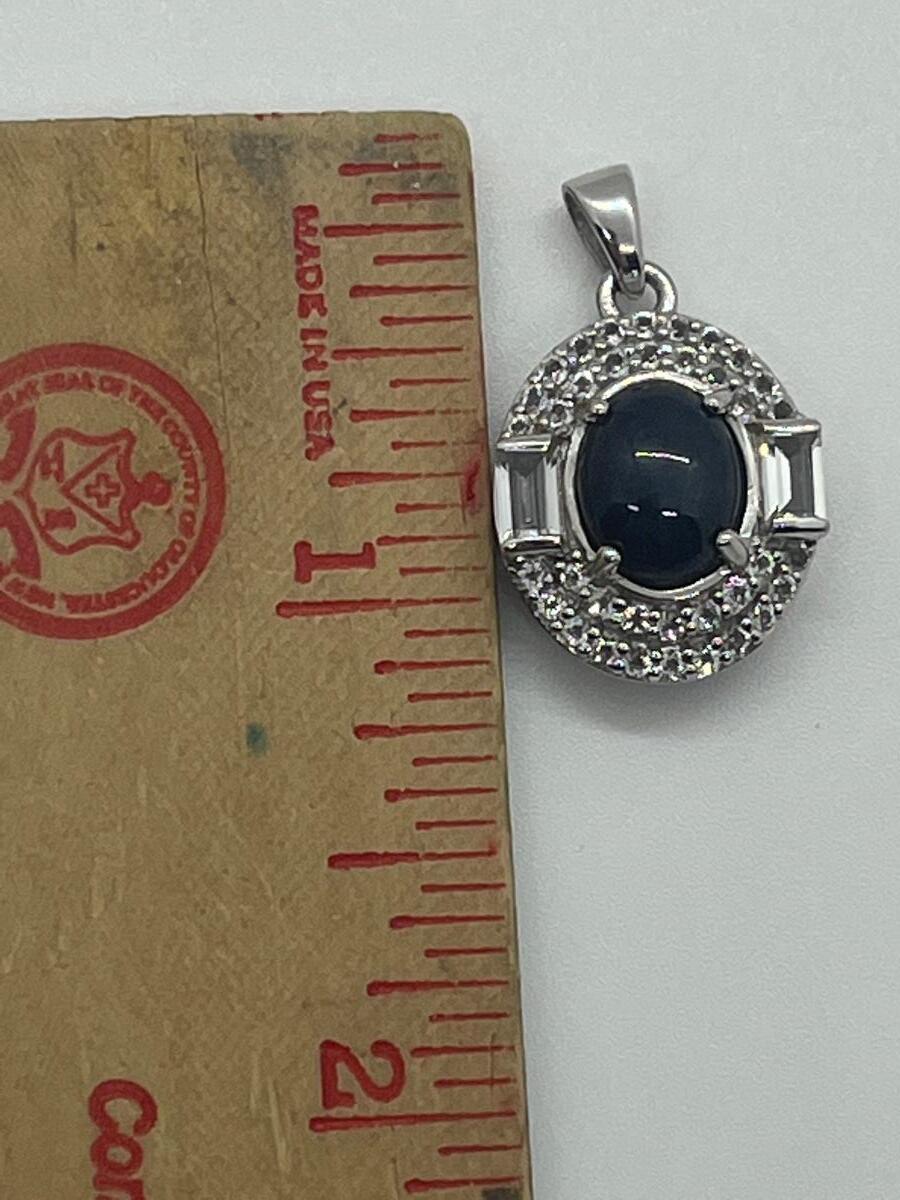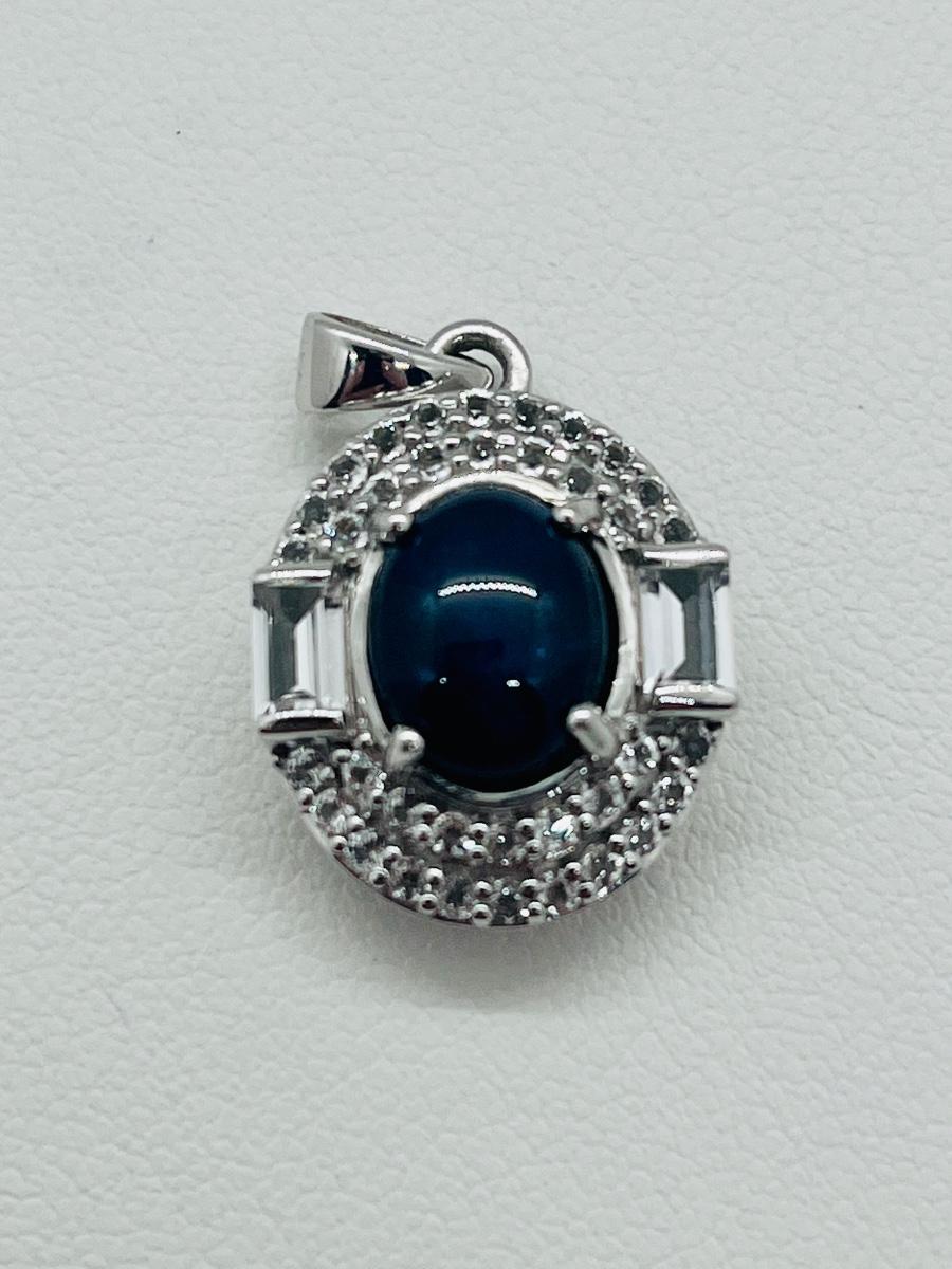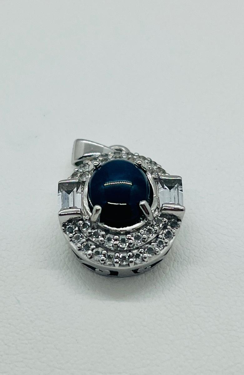 Lot 146: 925 KH Thailand Blue Star Sapphire Oval Pendant Surrounded by Diamonds, Flanked by 2 Diamond Baguettes