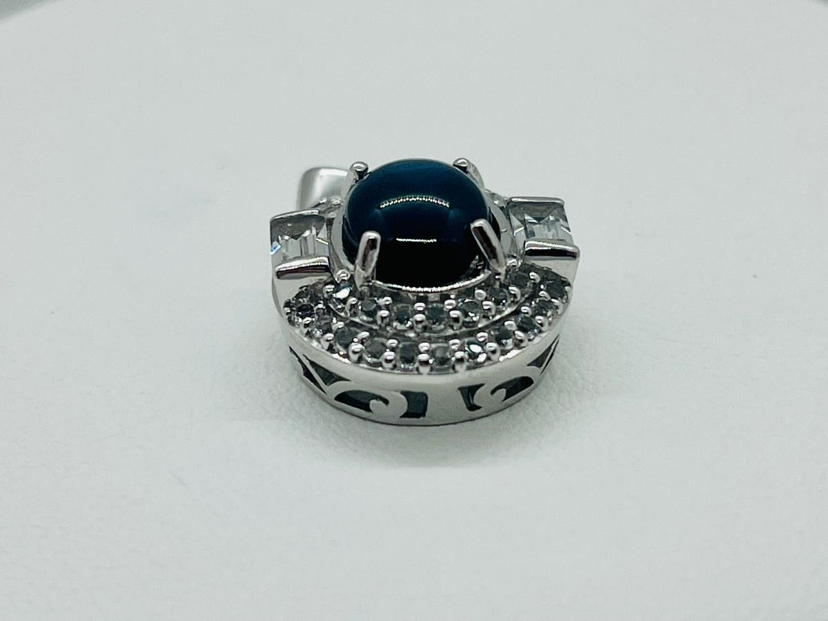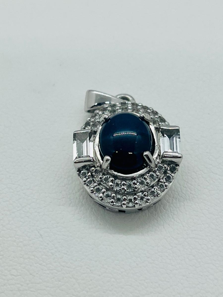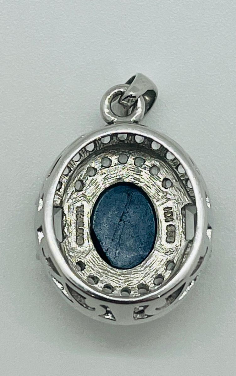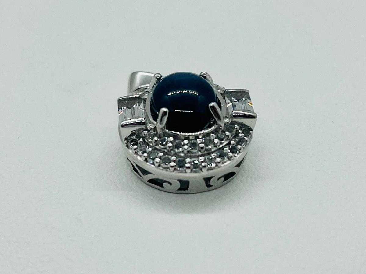 Lot 146: 925 KH Thailand Blue Star Sapphire Oval Pendant Surrounded by Diamonds, Flanked by 2 Diamond Baguettes