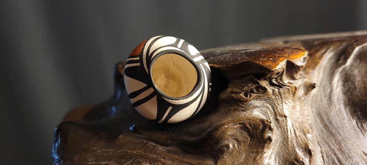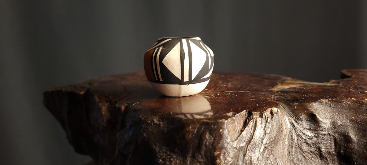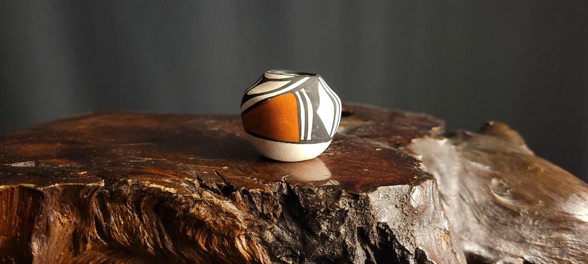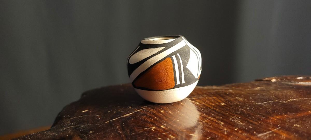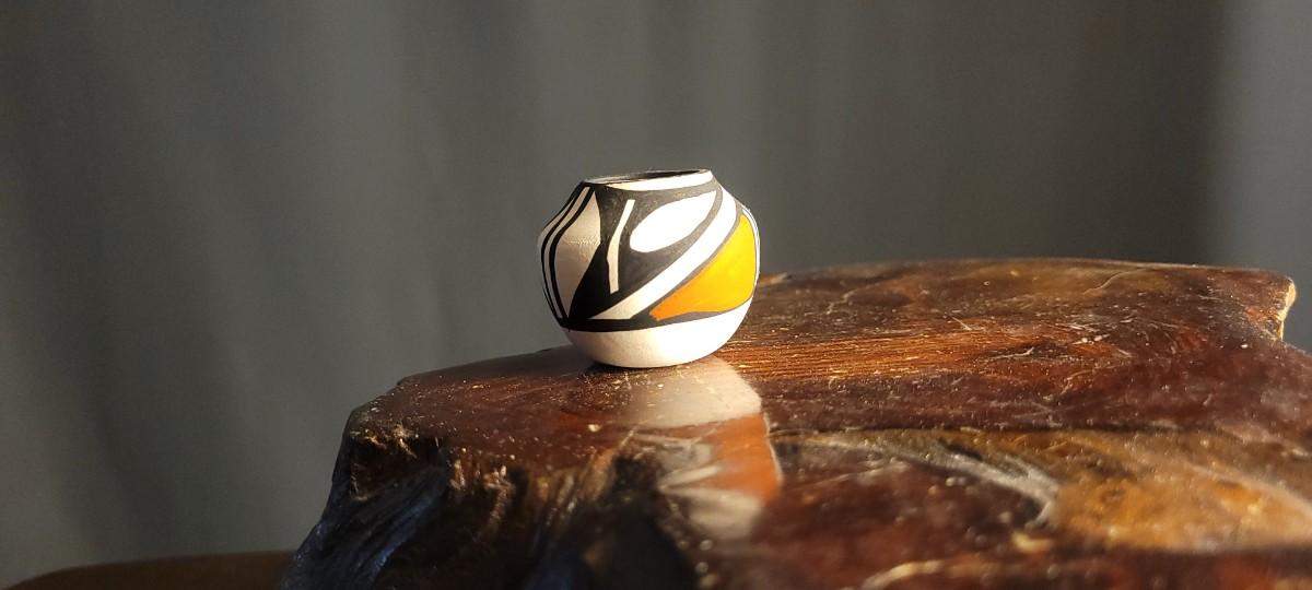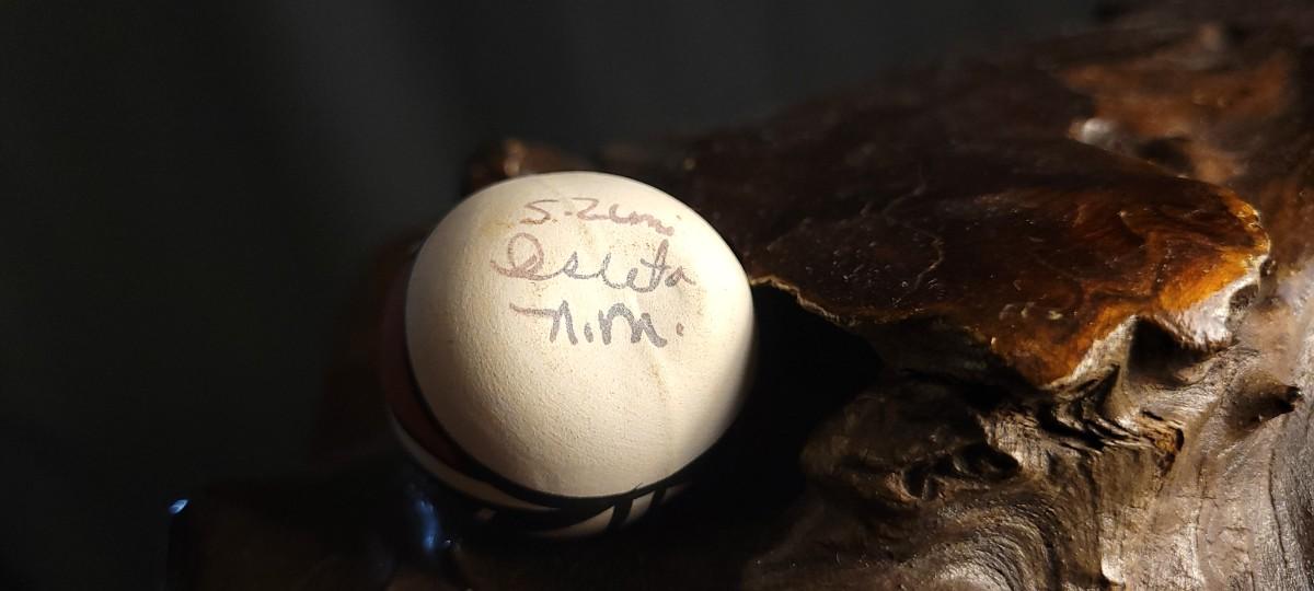 This little pottery creation has been signed by the ZUNI Native American artist responsible for the striking designs.