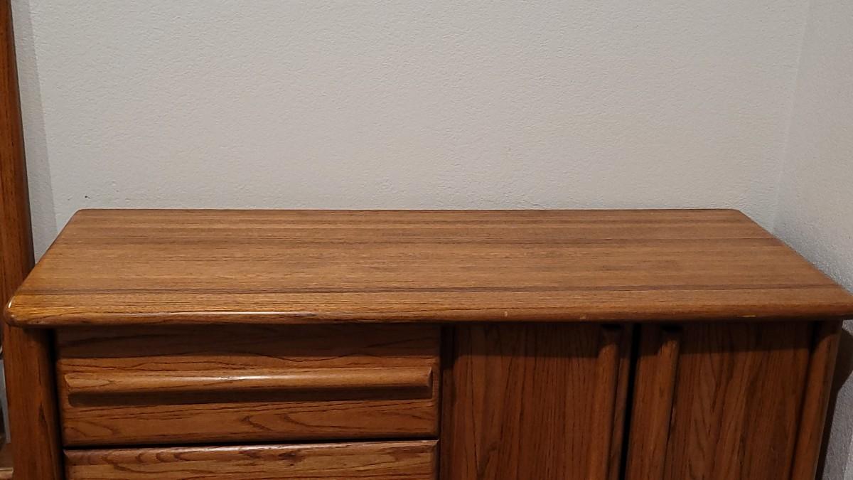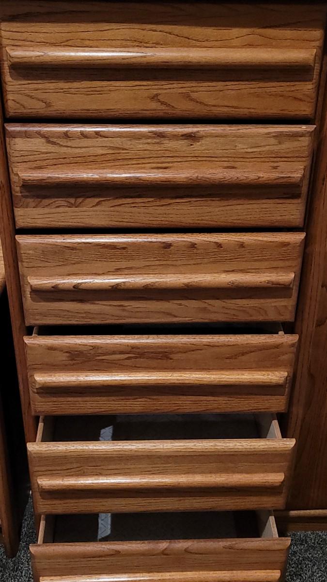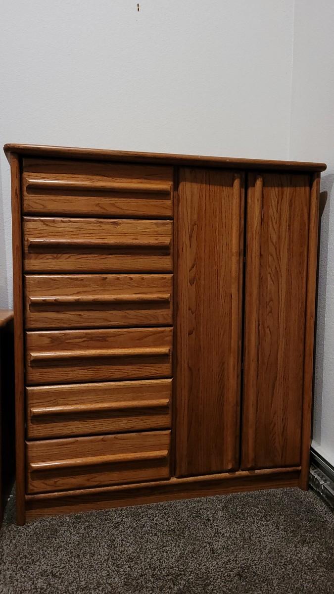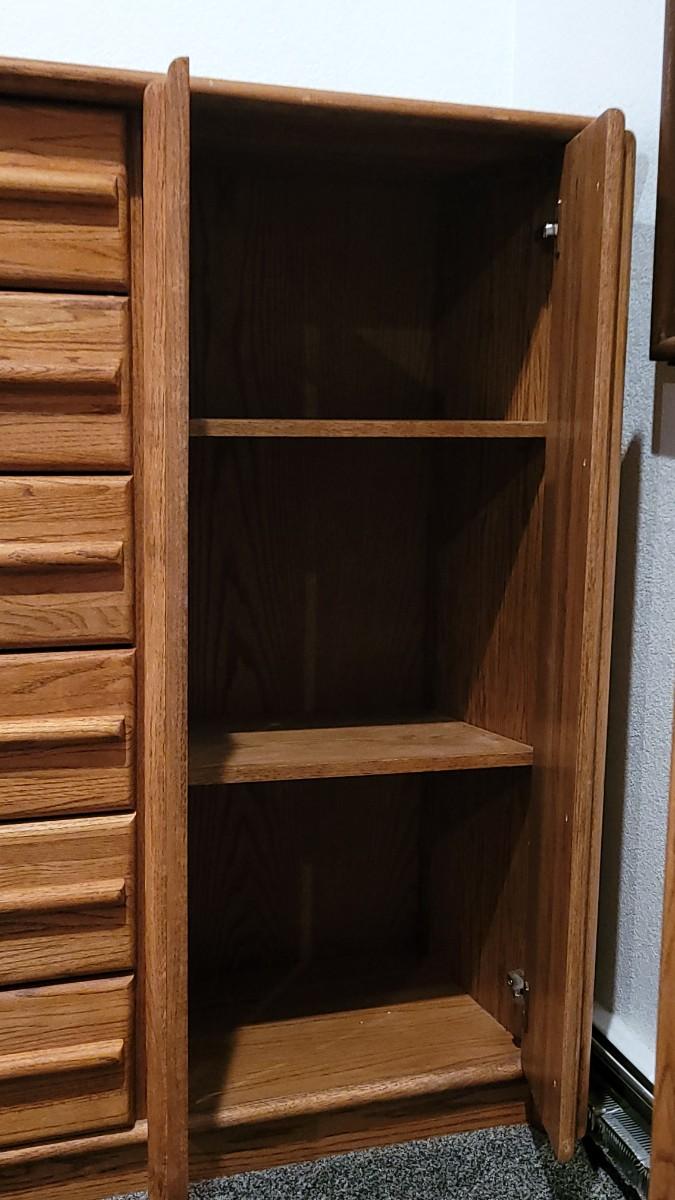 Features 6 drawers on one side and the othere side has double doos that open to shelving. ☆This dresser is upstairs. You will need to bring your own help to move it.