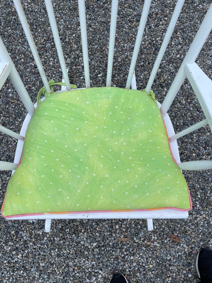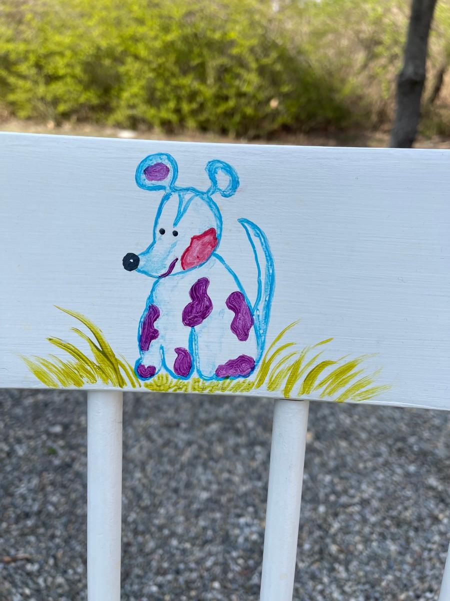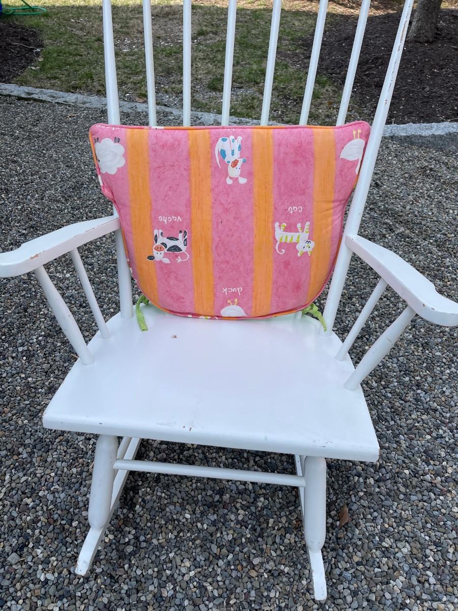 Wood rocking chair - white painted with a cute drawing at the top with two sided pillow.
