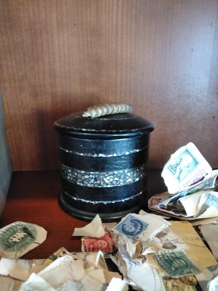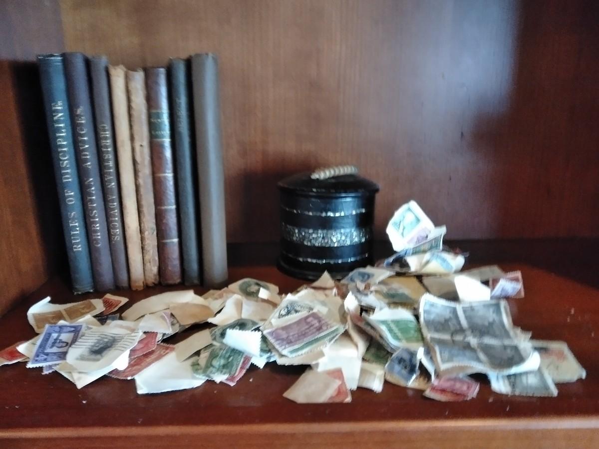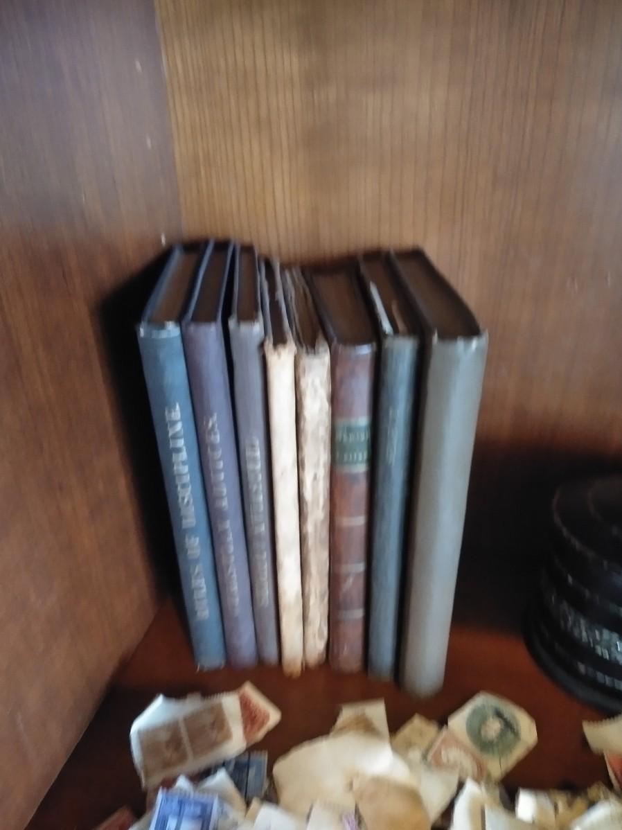 ANTIQUE BOOKS AND SOME STAMPS MOTHER OF PEARL CONTAINER