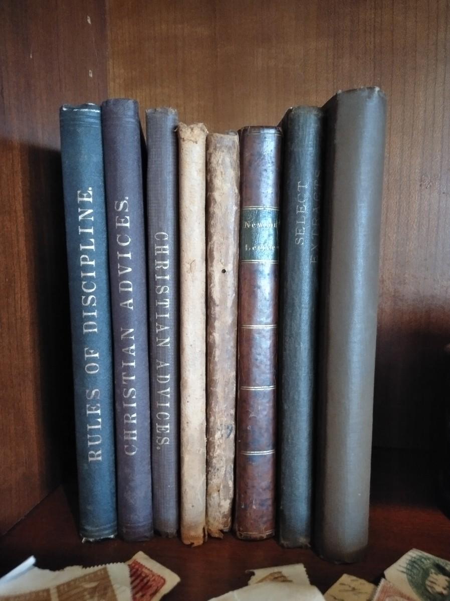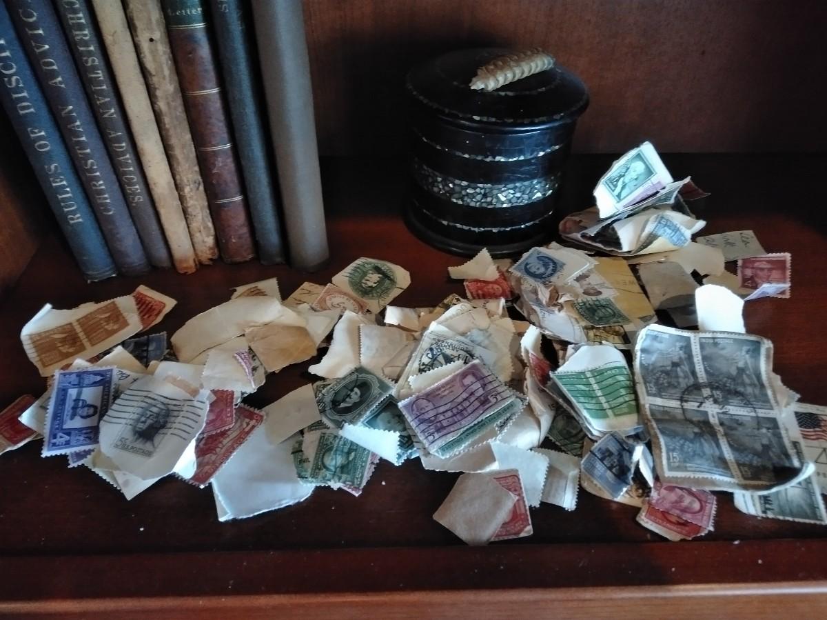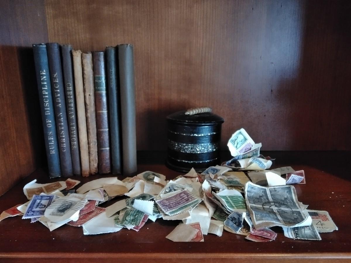 ANTIQUE BOOKS AND SOME STAMPS MOTHER OF PEARL CONTAINER