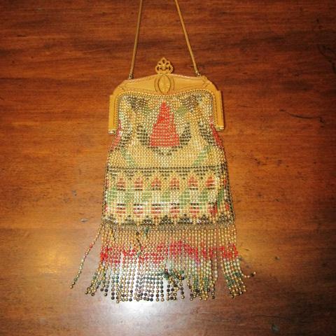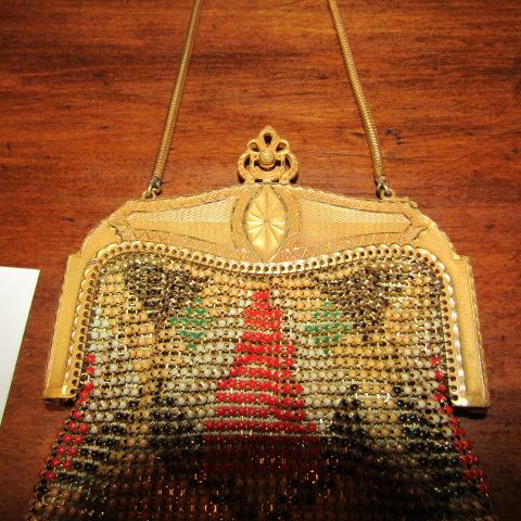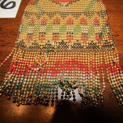 METAL BEADED PURSE, SILK LINED AND INCLUDES ROUND MIRROR