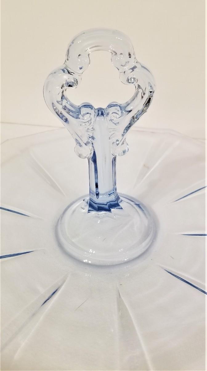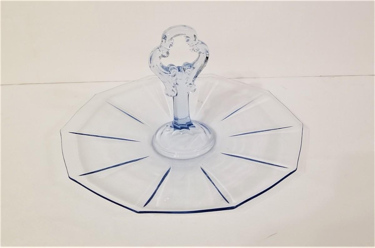 Elegant glassware from the 1940's - blue glass tidbit platter. Great condition - 6" tall, 10.5" across.