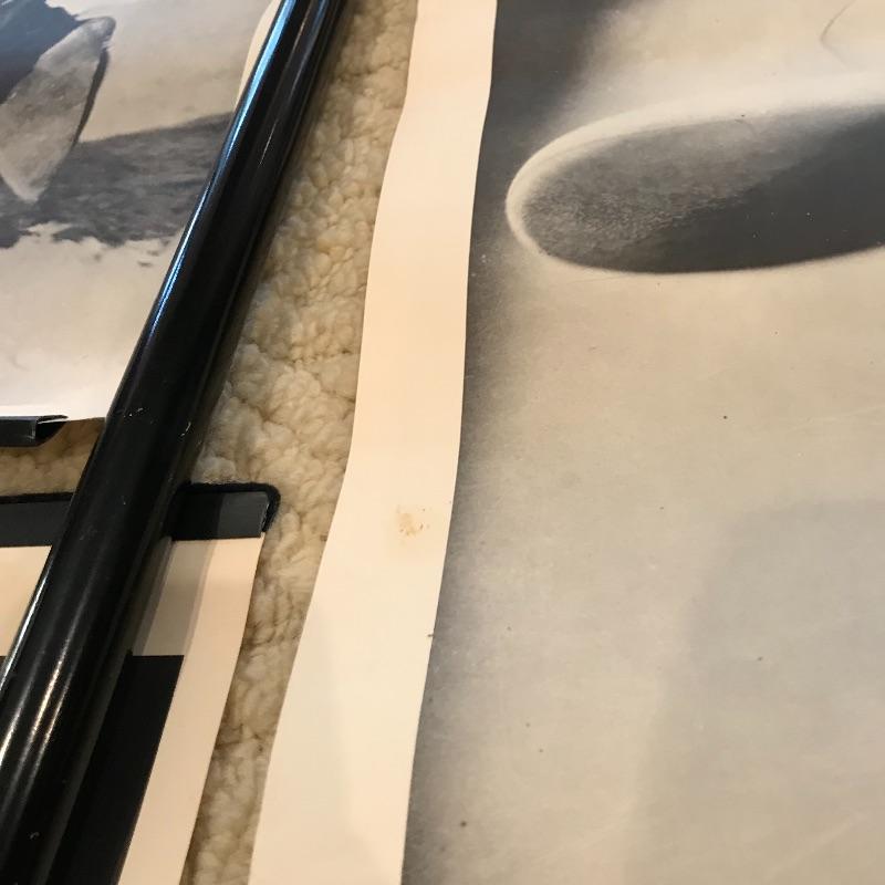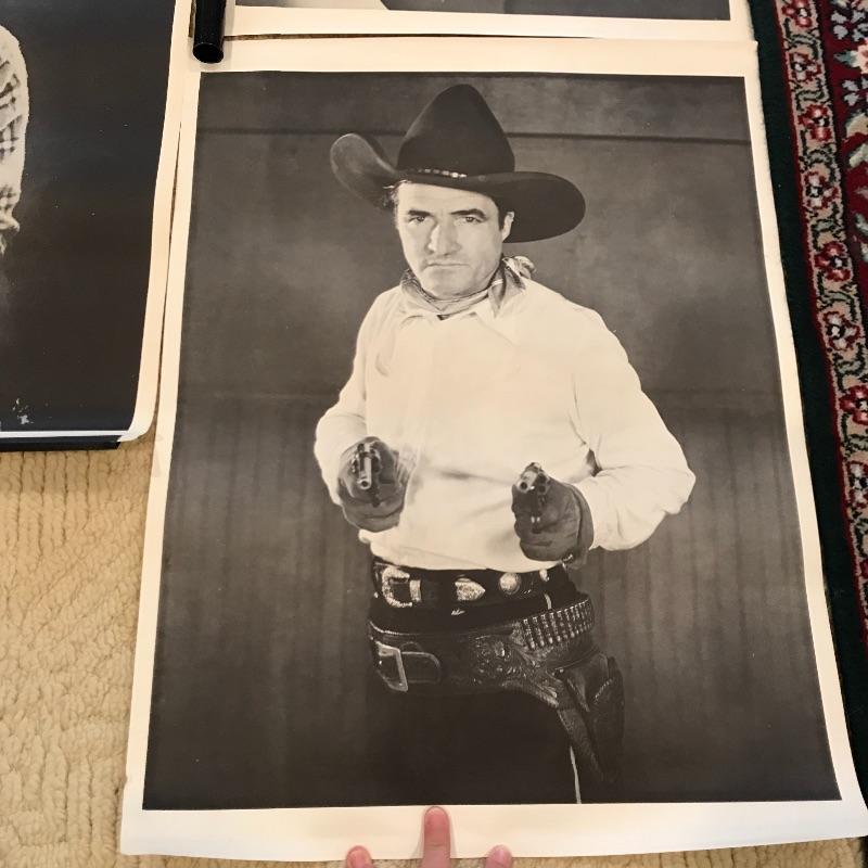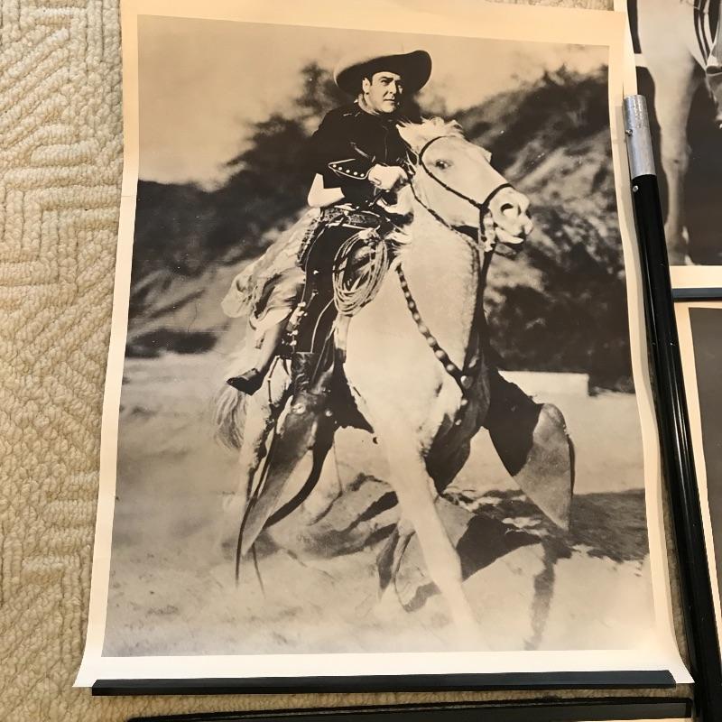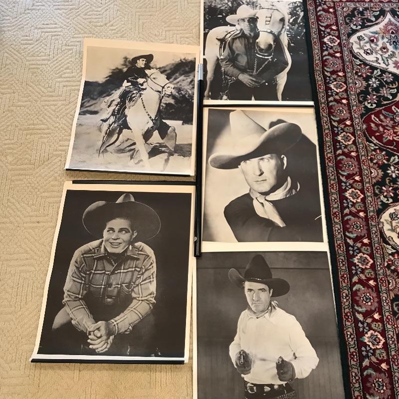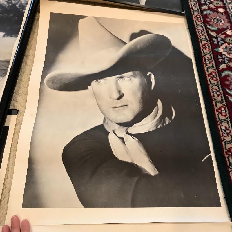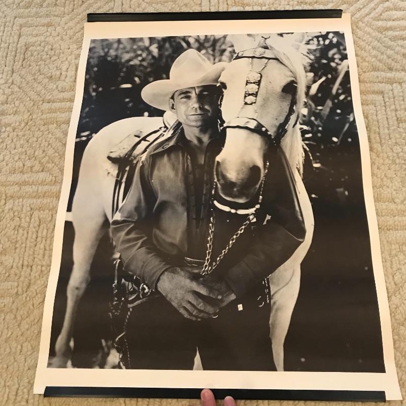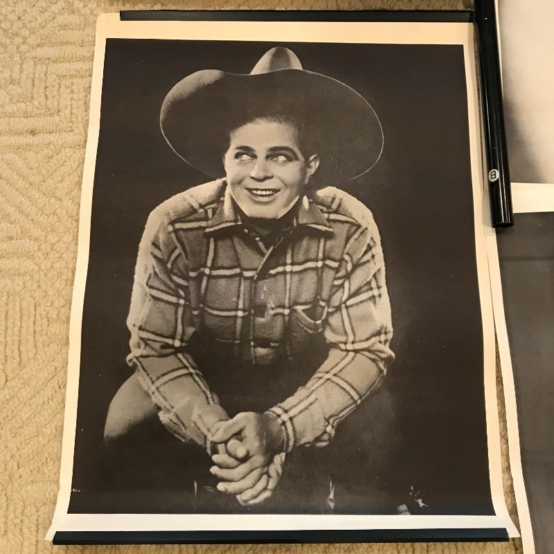 Gene Autry and four other great shots of favorite cowboys blown up to poster size! Posters are all black and white and have a matte finish. They each measure approximately 19” x 25”. A few black plastic poster clips are included. Posters are all curled as if previously stored as a roll with minor creasing. No evidence of hard creases/folds have been noticed. The Gene Autry poster has a brown blemish on the side, see photos. Shipping available.