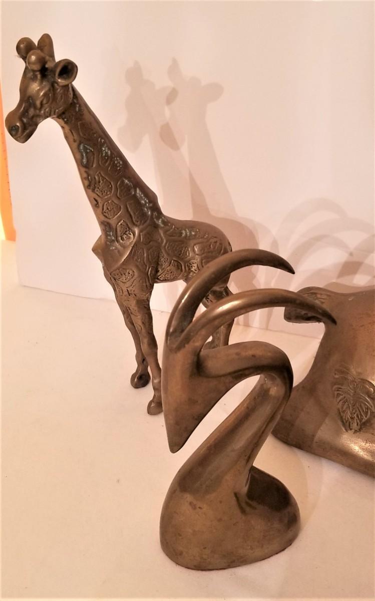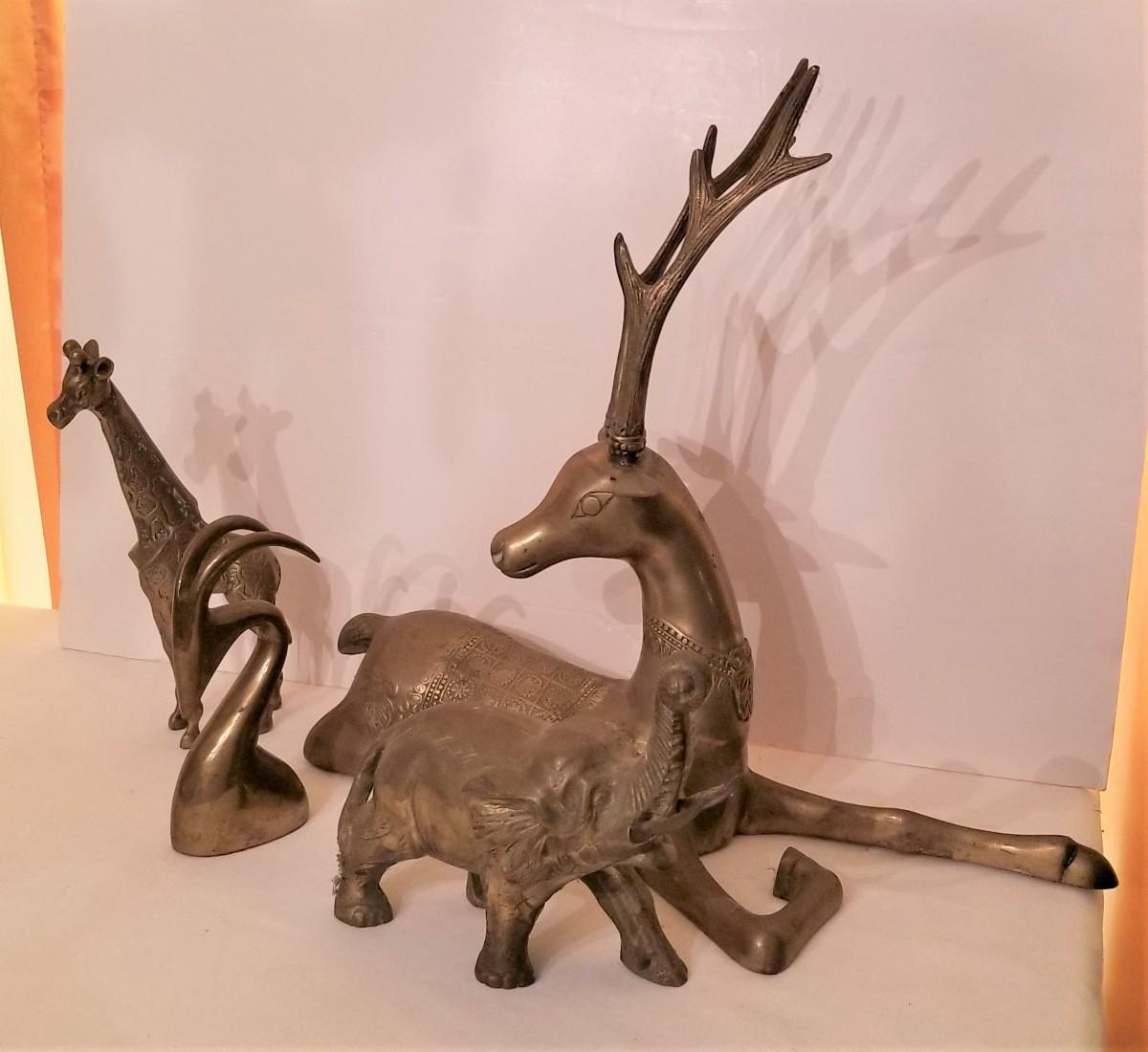 MidCentury Brass decorator lot - Large reclining deer (18" tall, 20" long), Elephant with upraised trunk (9" x 8"), Stylized antelope (7.5" tall), and giraffe (10" tall."). We have not attempted to polish. Late 1960's, early 70's.